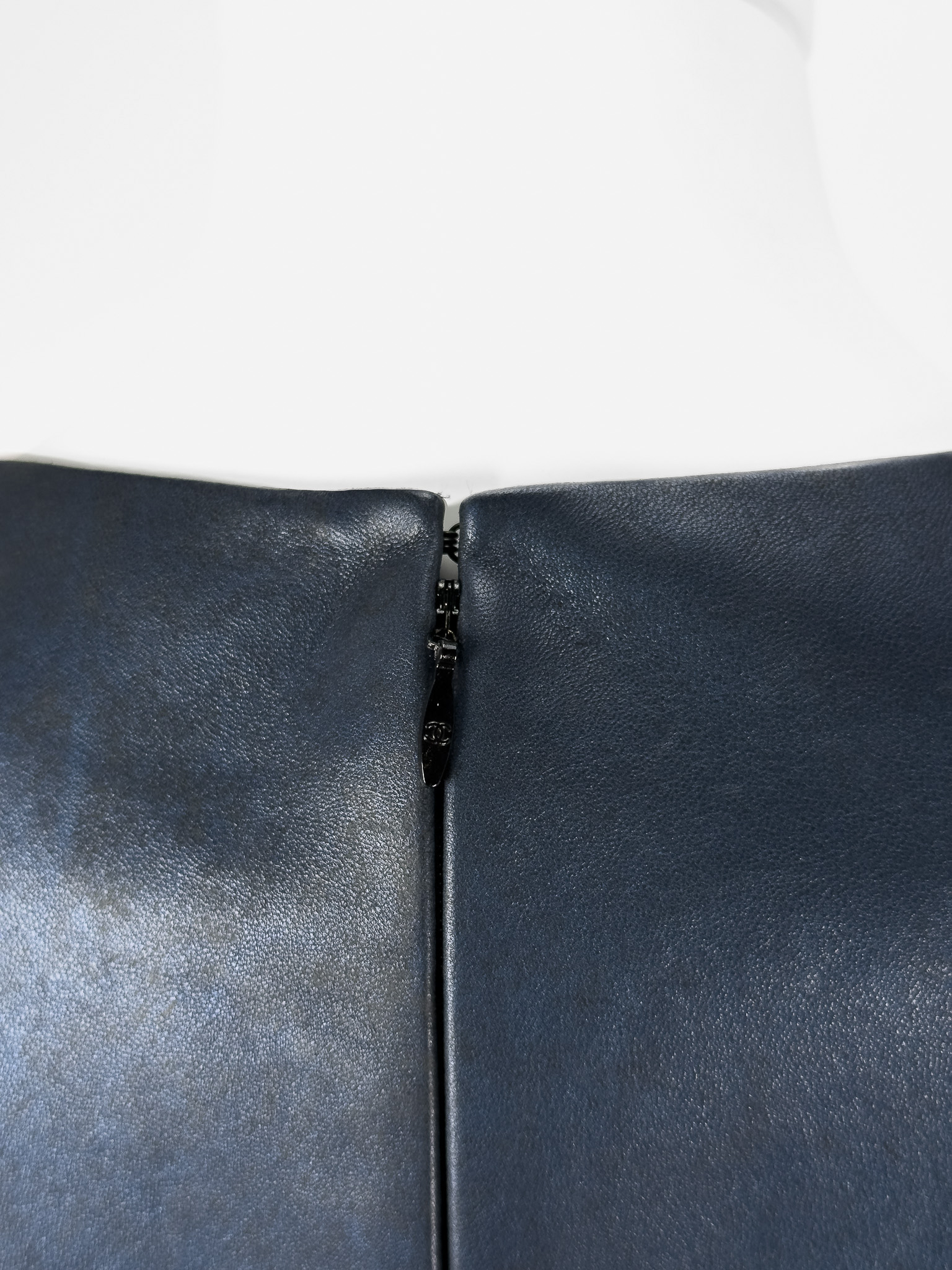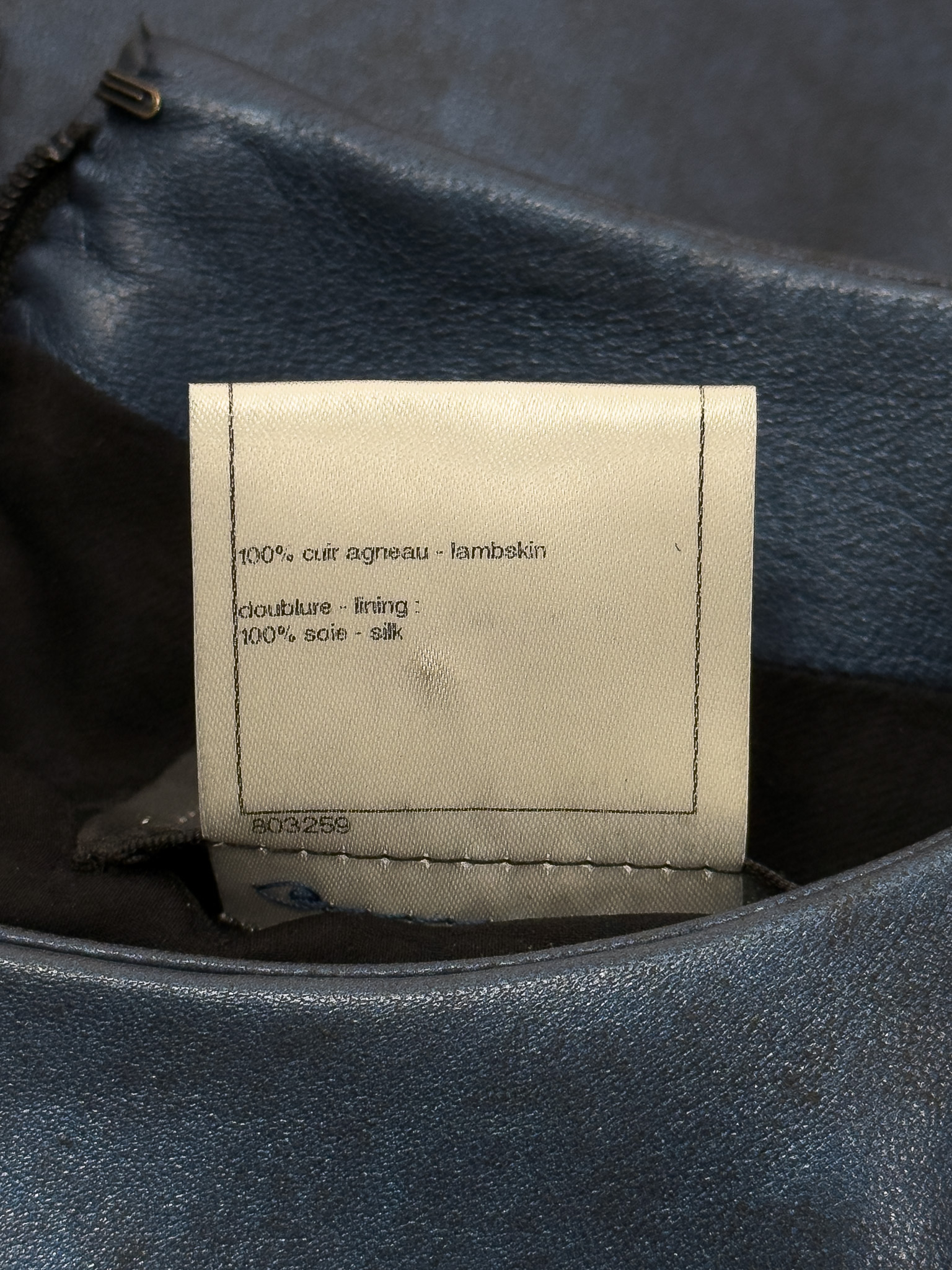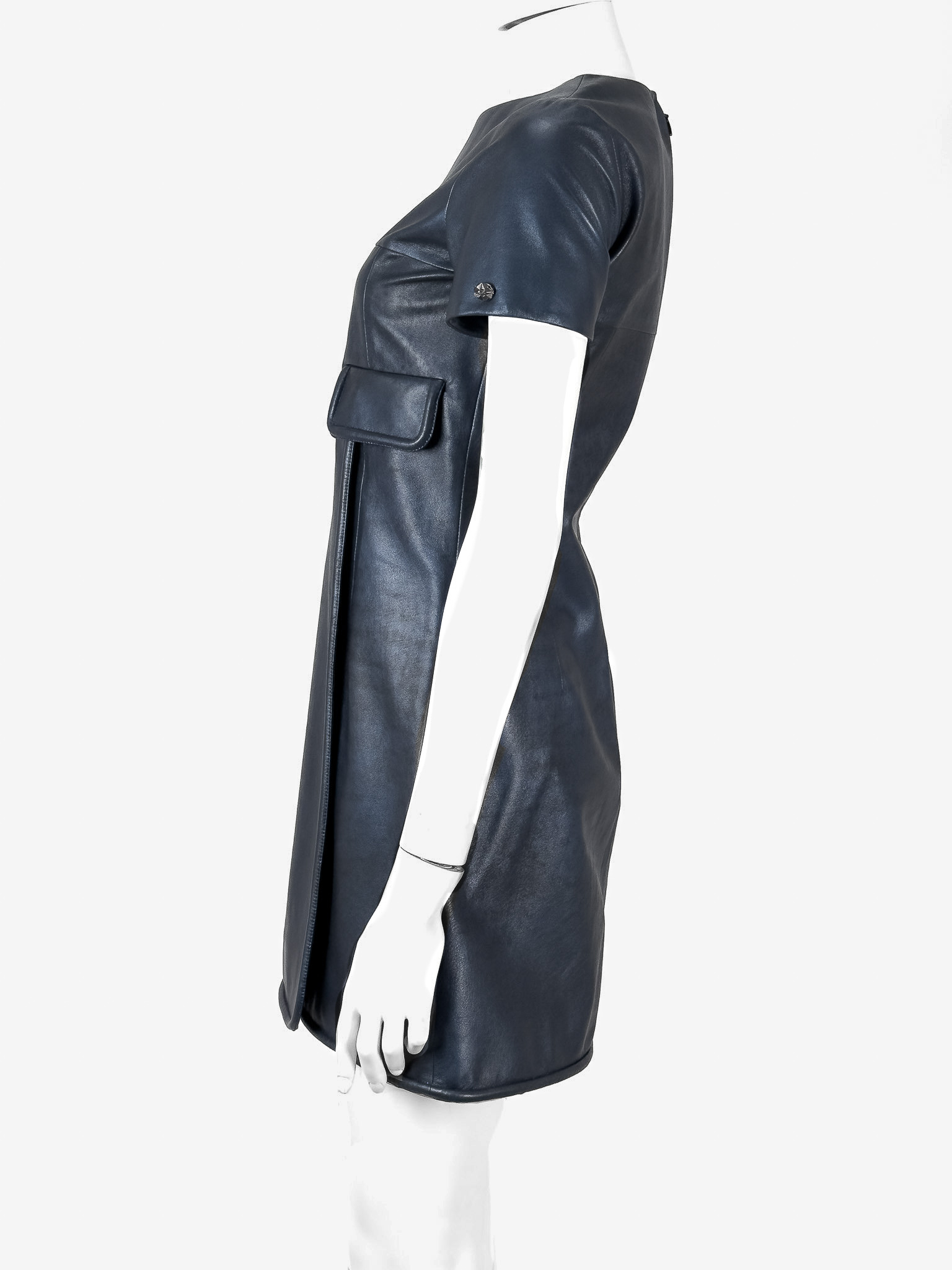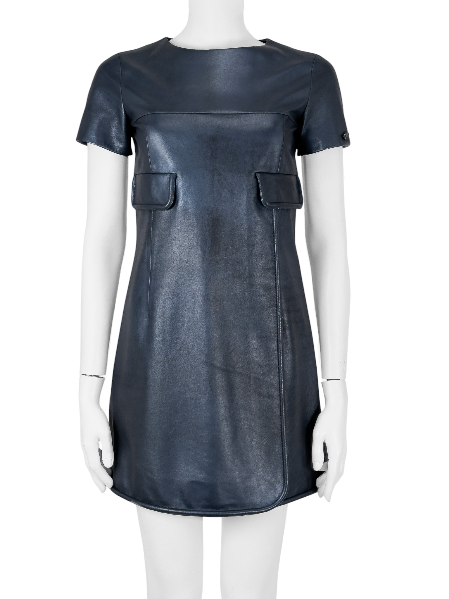 "Granatowa skórzana sukienka delikatnie przyciemniana, krótki rękaw, dwie patki na przodzie, zapinana z tyłu na suwak, zakładka na przodzie. Rozmiar z metki FR 36. Skład; 100% skóra cielęca, podszewka 100% jedwab. Stan bardzo dobry. Wymiary: szerokość mierzona od pachy do pachy 41cm, długość całkowita 82cm."