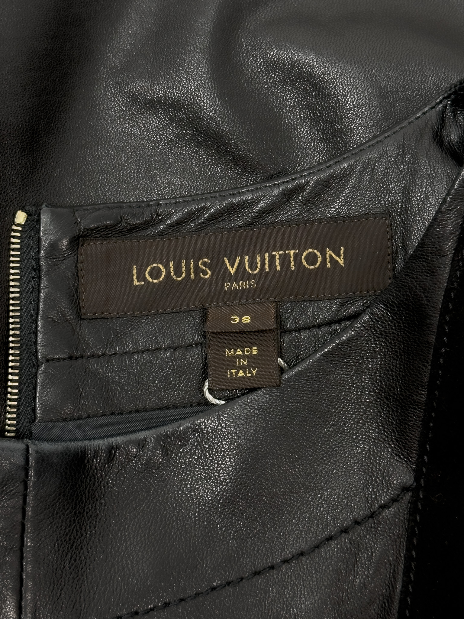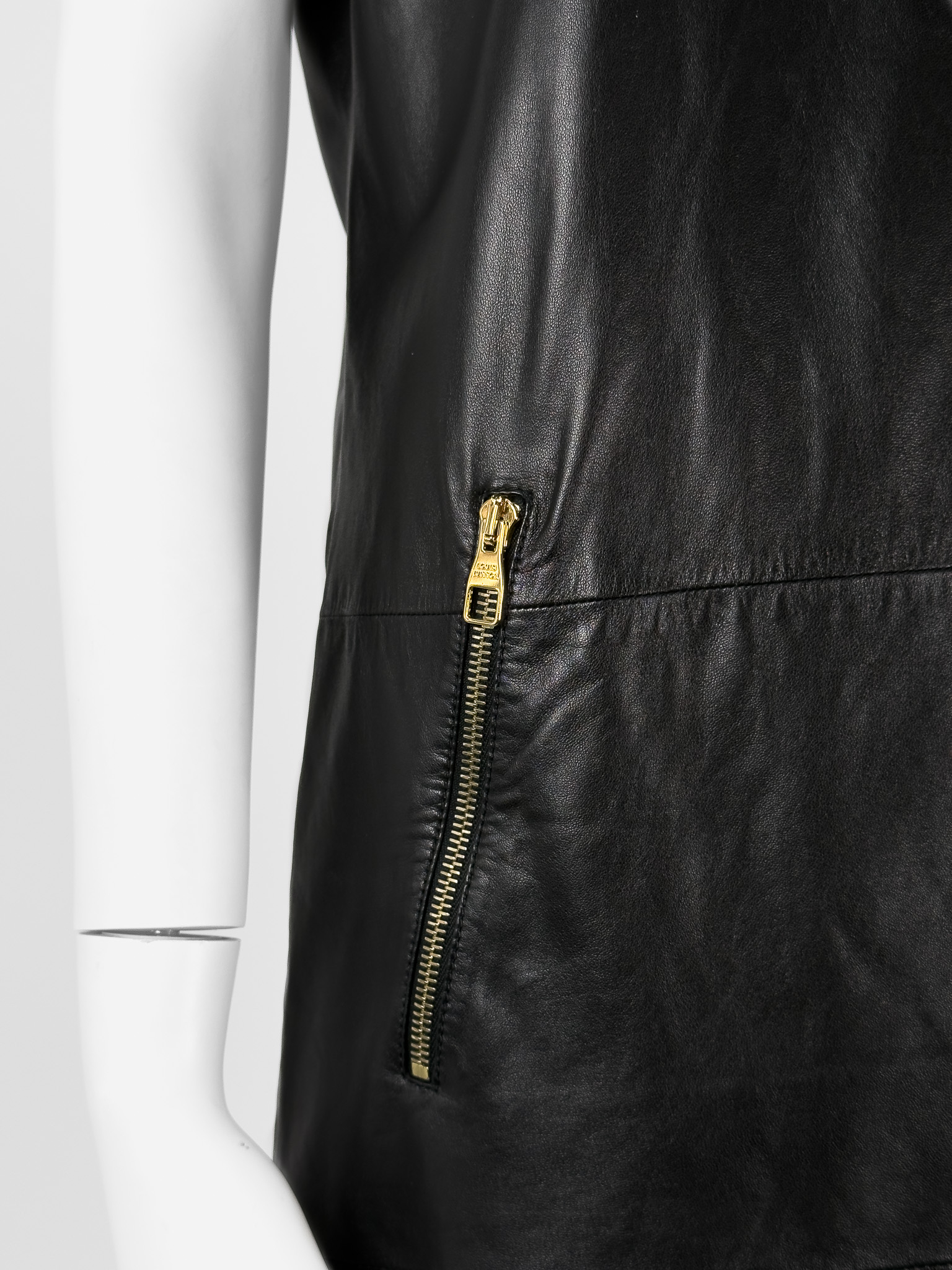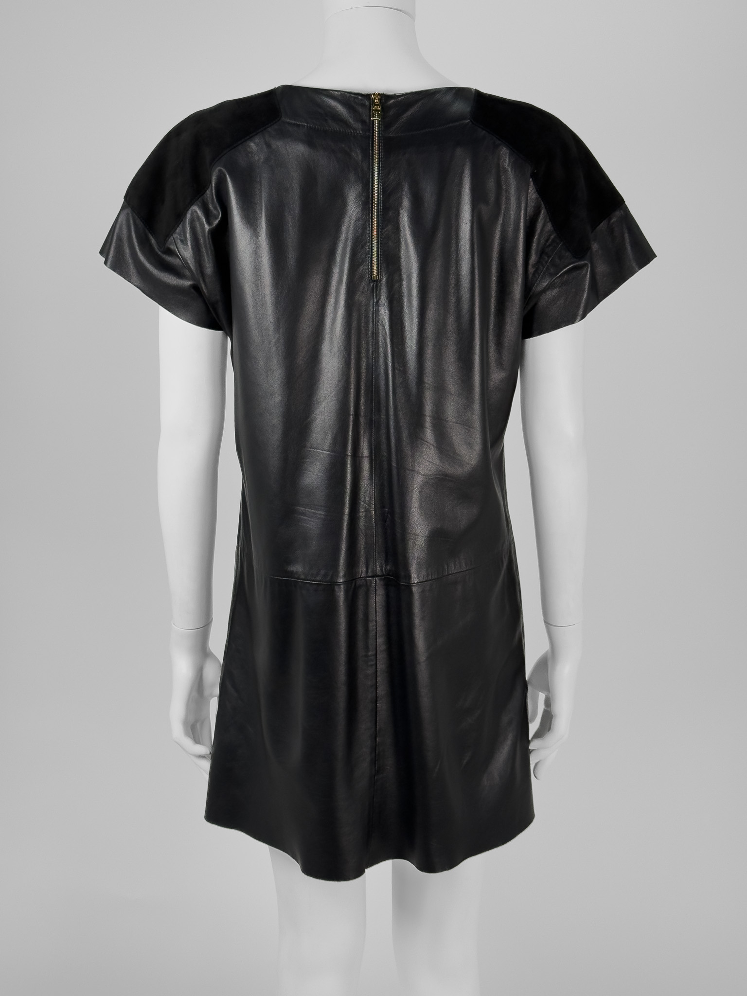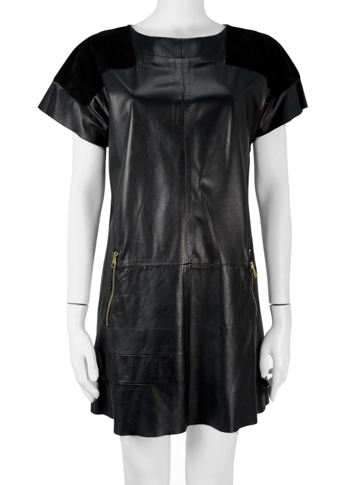 "Czarna skórzana sukienka o pudełkowym kroju, długość przed kolano, zamszowe wstawki na ramionach, zaokrąglony dekolt, dwie kieszenie zapinane na złote logowane suwaki po bokach, przeszycia, zapinana w tylnej części, surowo wykończona, podszewka. Stan bardzo dobry. Rozmiar z metki IT 38. Skład:100% skóra jagnięca; podszewka: 60% wiskoza, 35% kupro, 5% elastan. Wymiary: szerokość mierzona od pachy do pachy 52cm, długość całkowita 84cm."