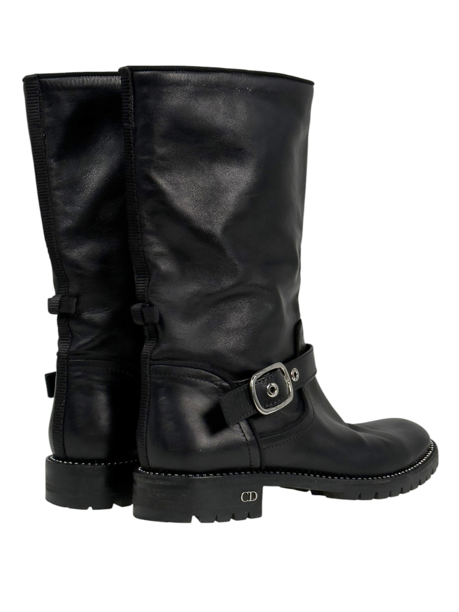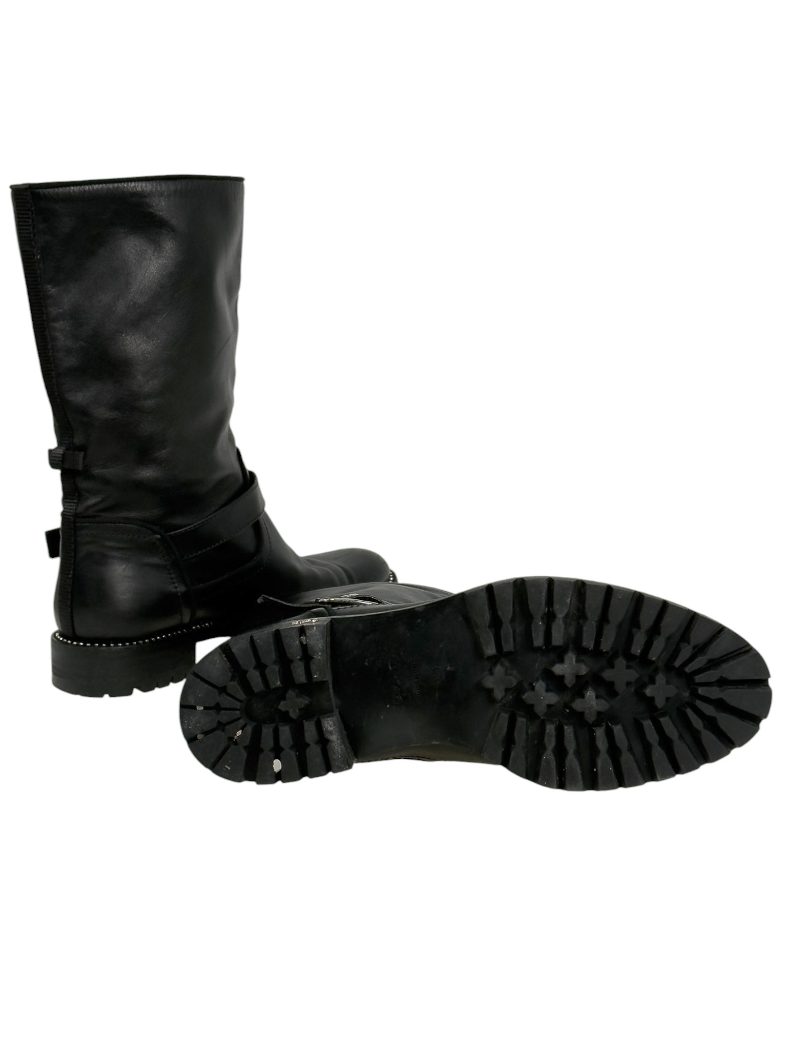 "Czarne skórzane botki ozdobione błyszczącymi cyrkoniami na podeszwie, regulowany pasek ze srebrną klamrą w bocznej części, niski obcas z inicjałami marki, wsuwane. Stan dobry, posiadają niewielkie zabrudzenia na podeszwie, marszczenia na skórze, minimalną wadę w postaci delikatnego rozklejenia podeszwy prawego buta. Rozmiar 38,5."