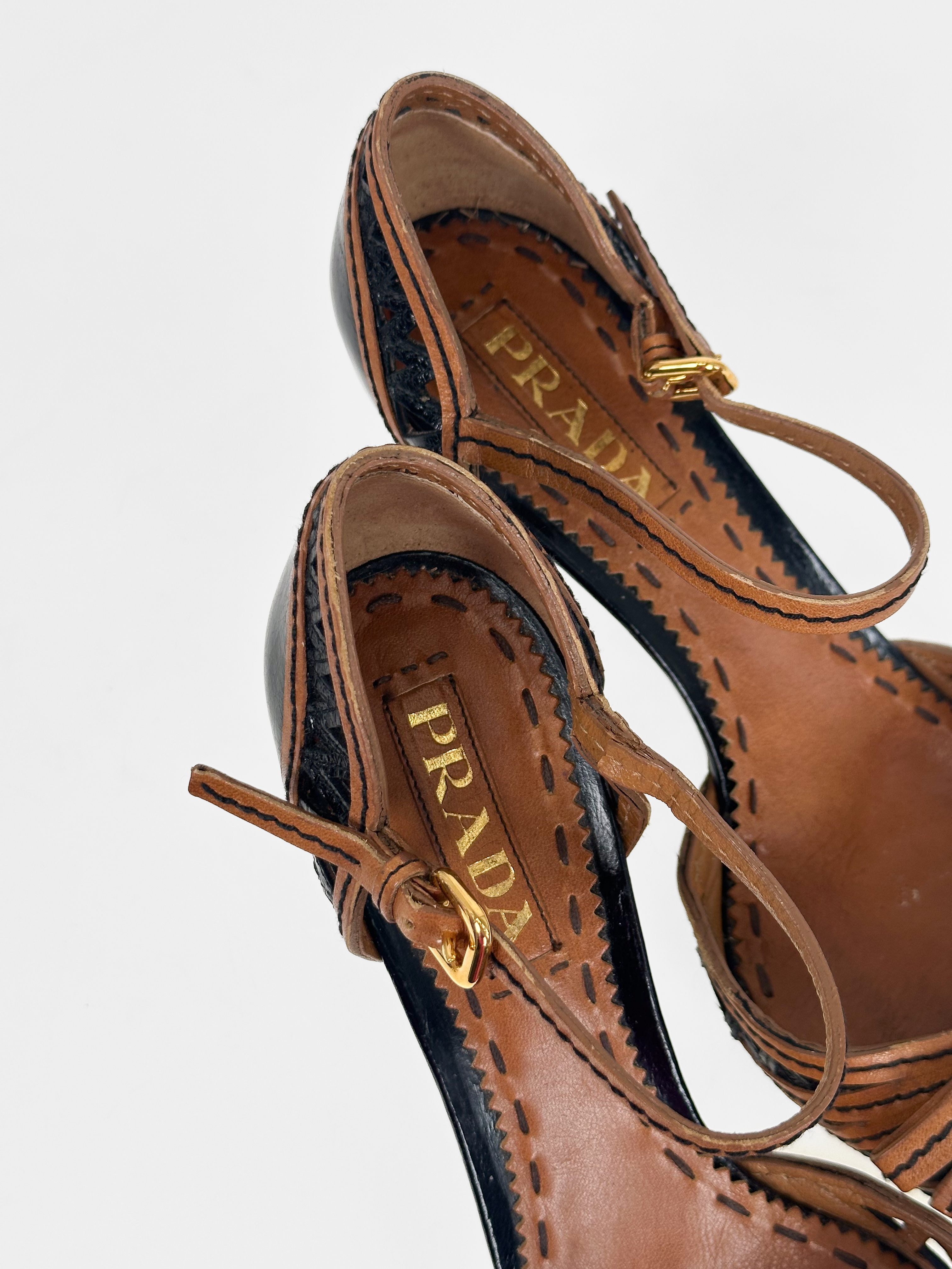 "Czarne skórzane szpilki w stylu vintage z camelowym wykończeniem, wkładką i kokardką na czubku, zapięcie wokół kostki ze złotą klamerką, rozmiar 36,5, w zestawie z pudełkiem, używane."