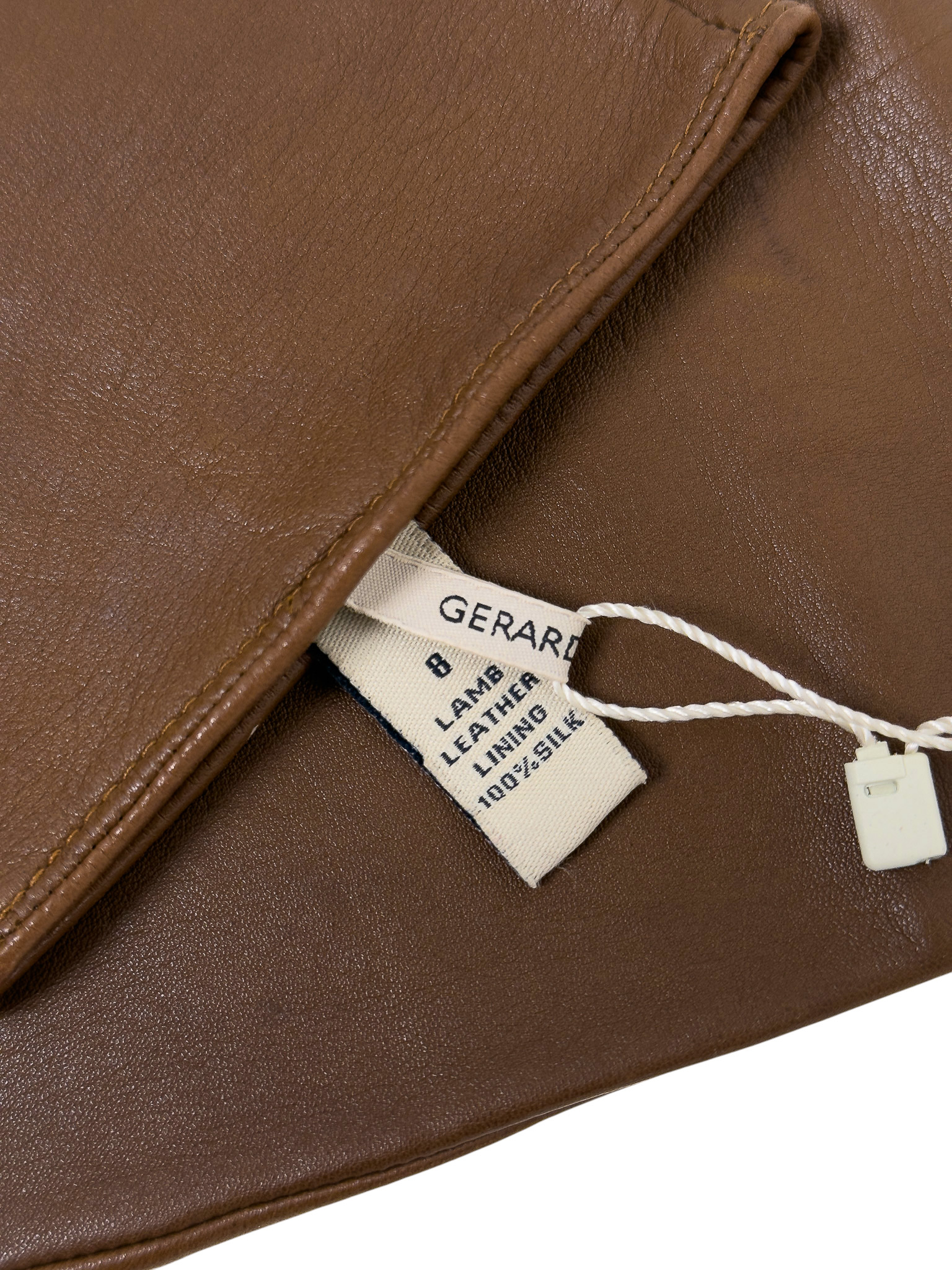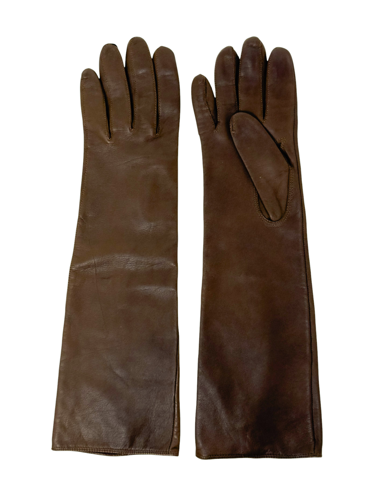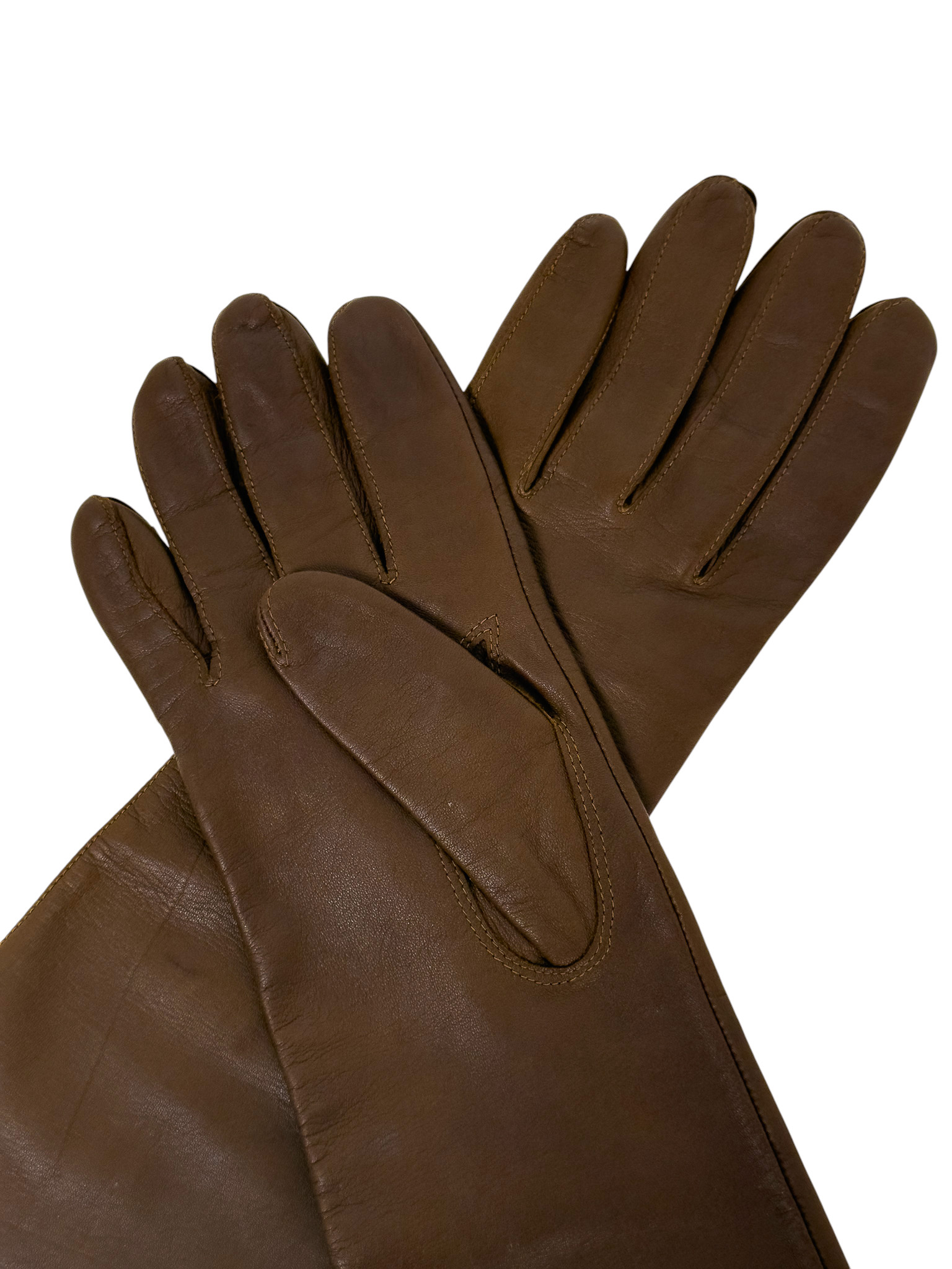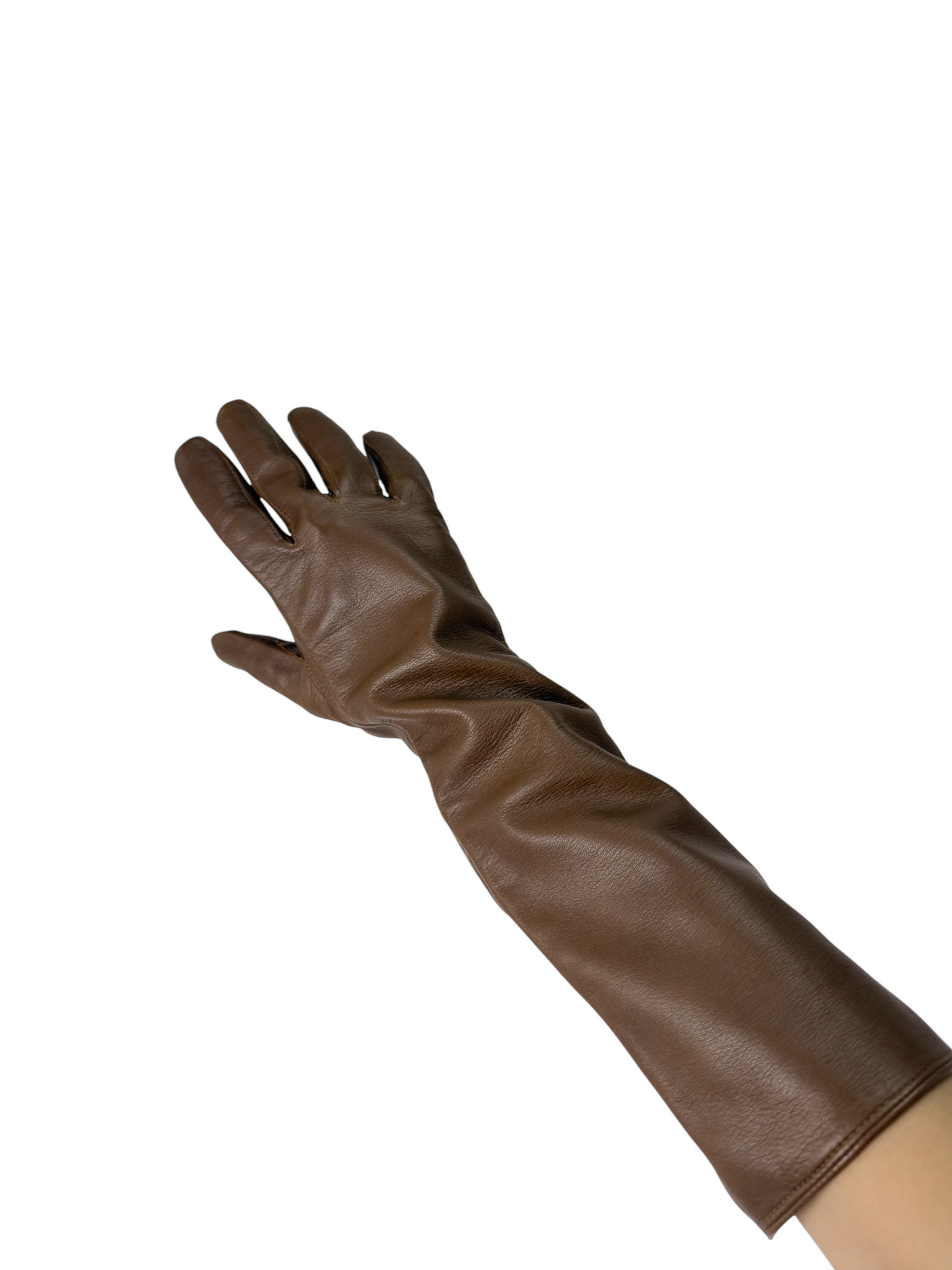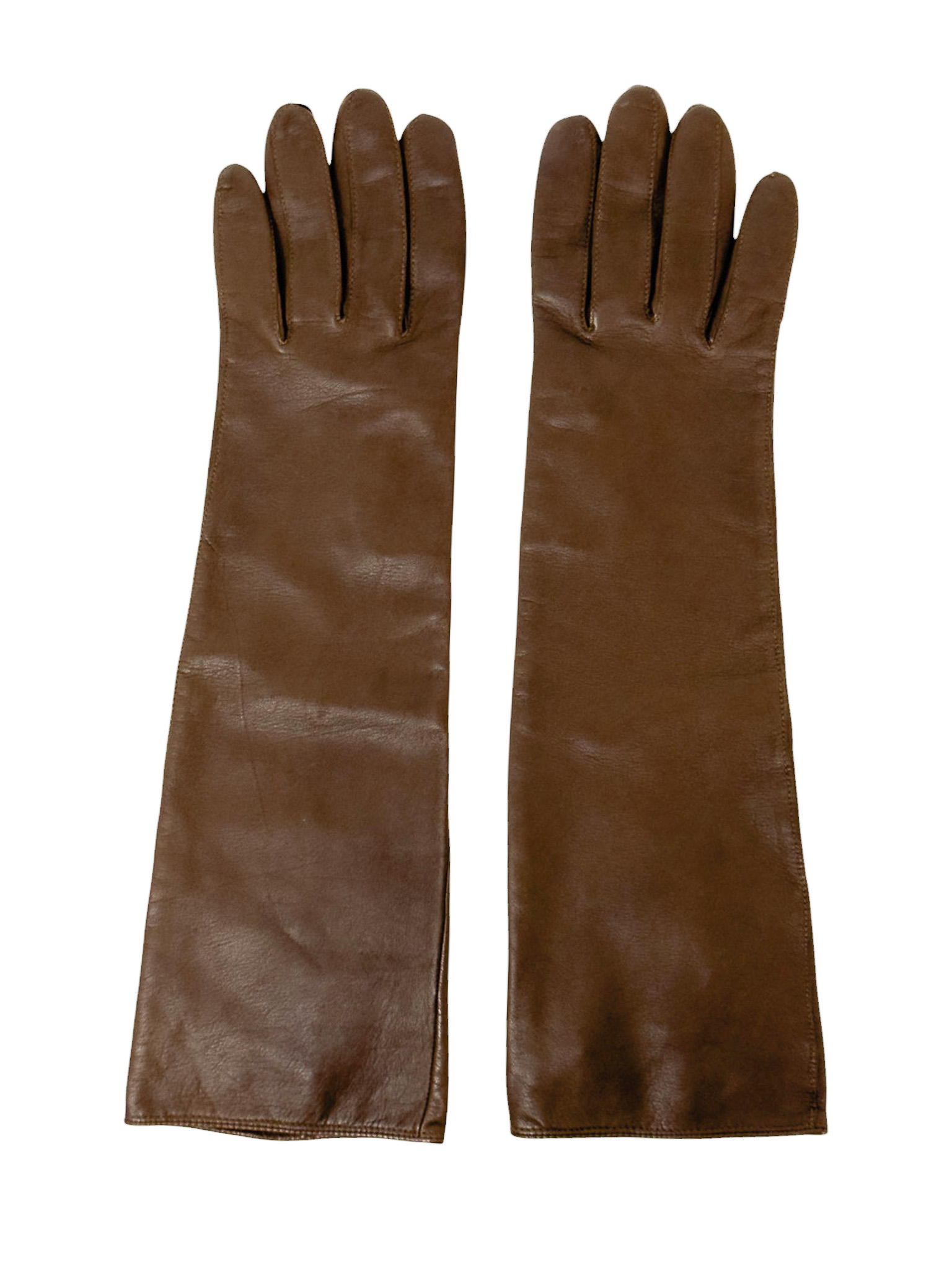 "Brązowe skórzane długie rękawiczki, miękka skóra, pięciopalczaste, jedwabna podszewka. Skład: 100% skóra, podszewka: 100% jedwab."