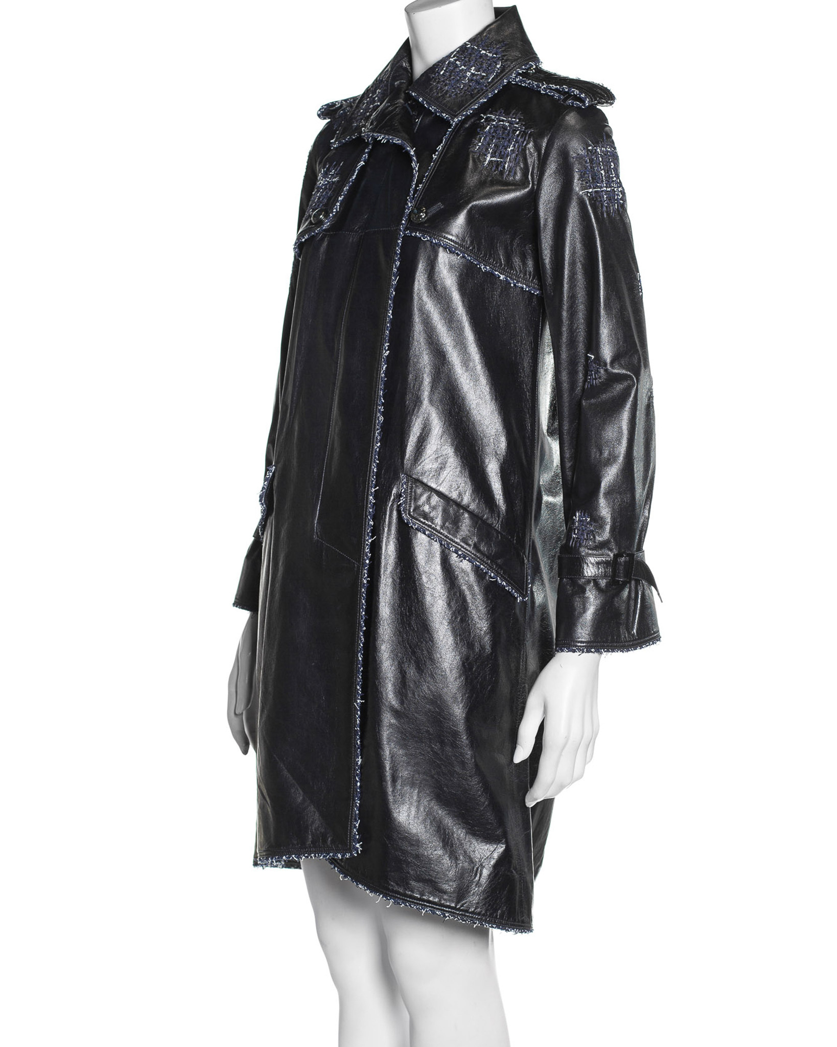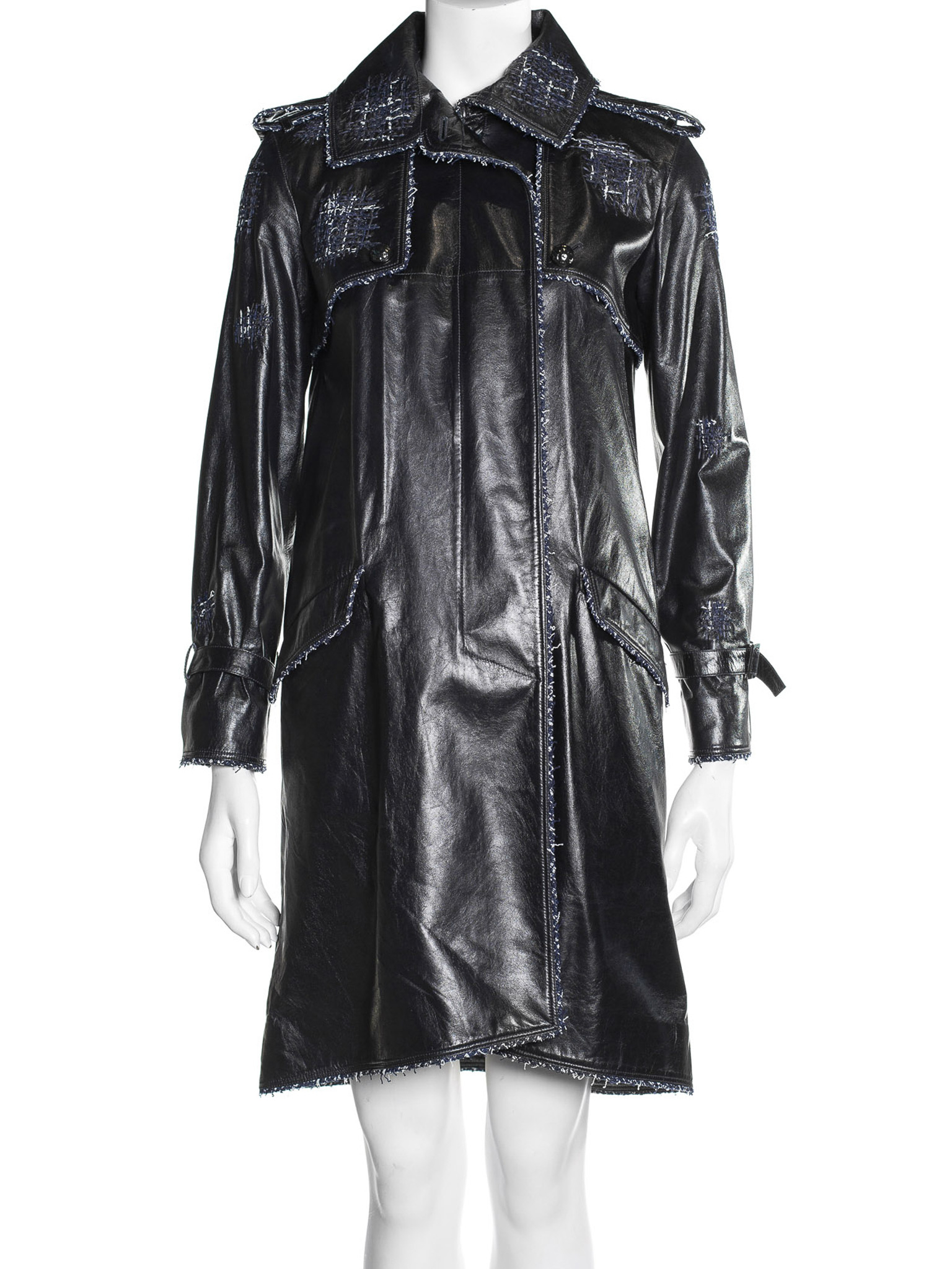 "Granatowy skórzany płaszcz z tweedowym biało-granatowym wykończeniem, srebrne guziki, zapinany na suwak, patki na ramionach. Rozmiar z metki 34. Skład: 100% skóra. Wymiary: długość całkowita 95cm, długość rękawa 59cm, szerokość w biuście 47cm."
