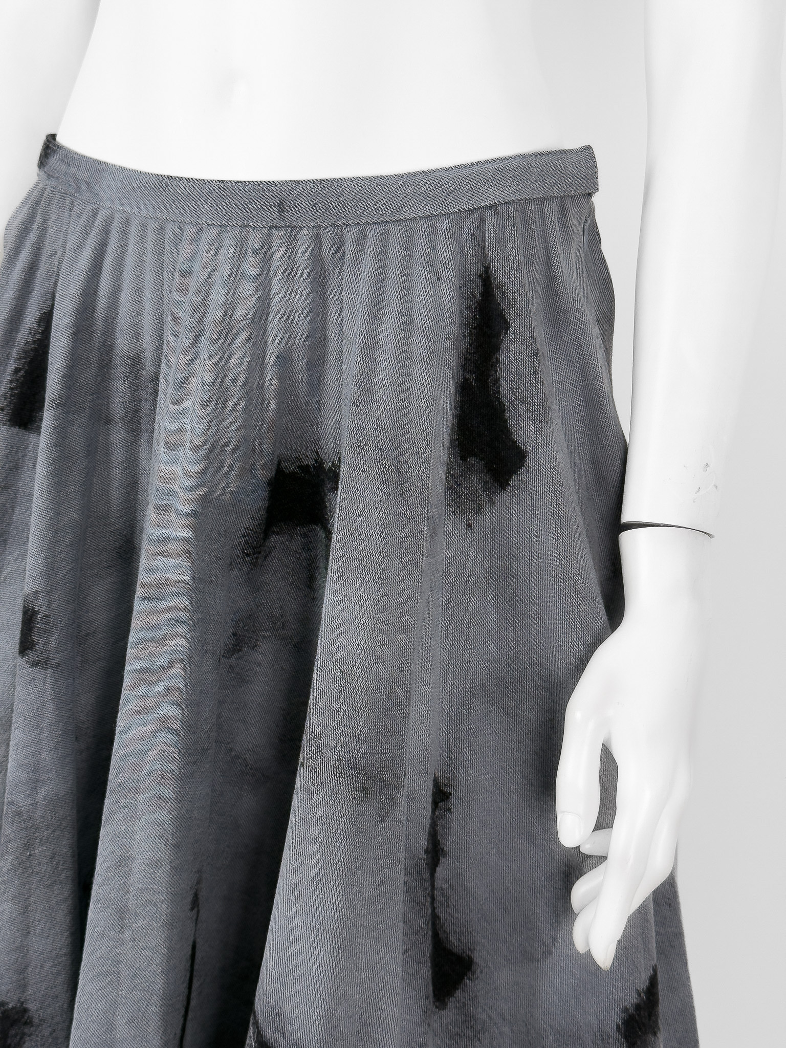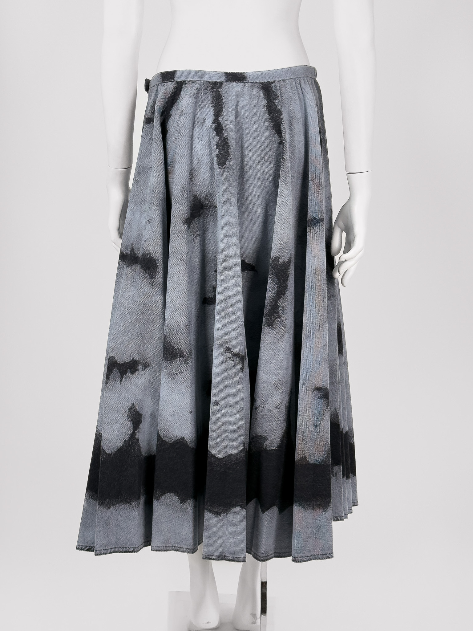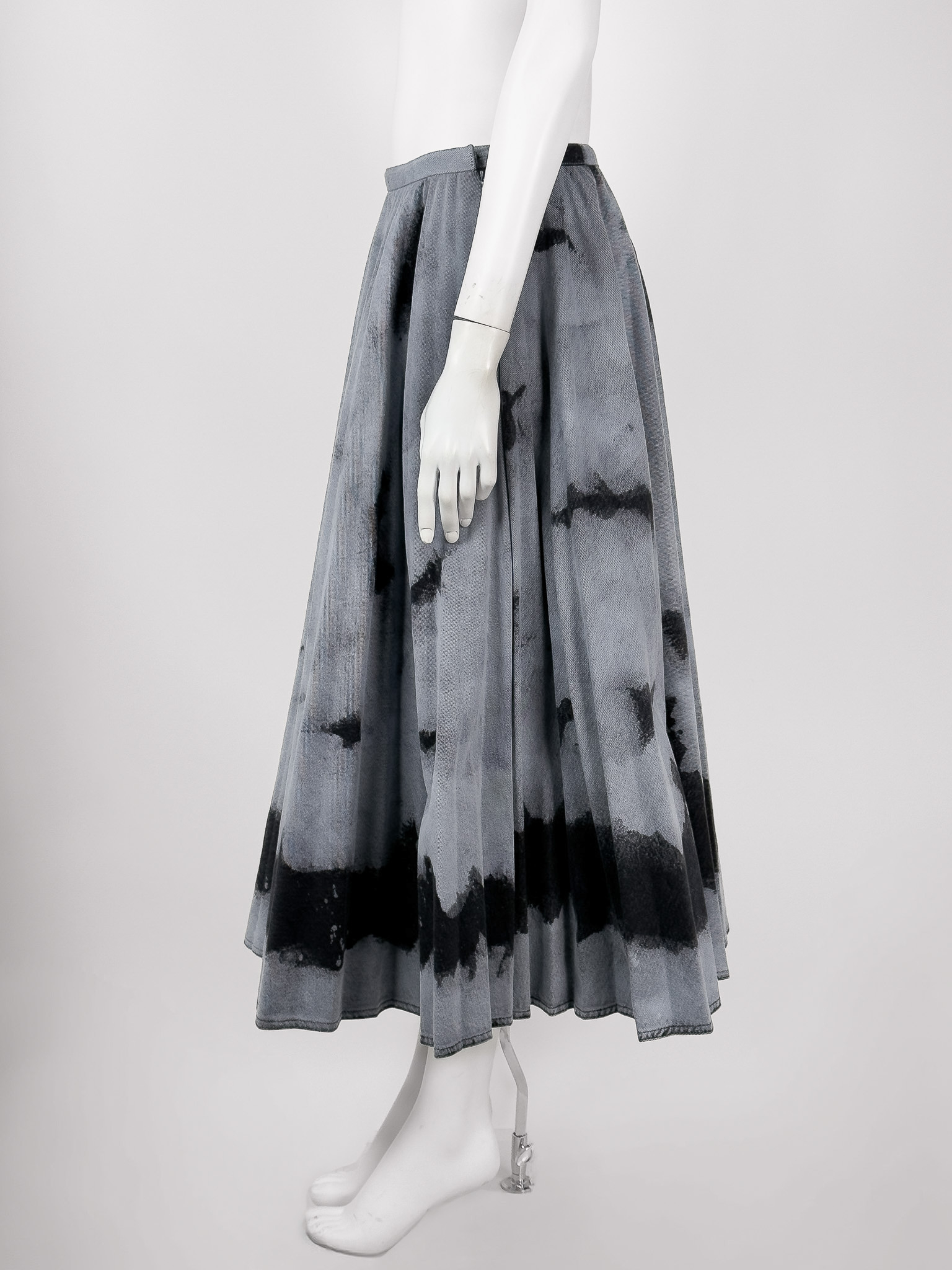 "Szaro - grafitowa maxi spódnica, rozkloszowana, denimowa, we wzór z efektem przybrudzenia. Rozmiar z metki IT 48. Skład: 100% bawełna. Nowa z metkami. Wymiary: szerokość w pasie 40cm, długość całkowita 83cm."