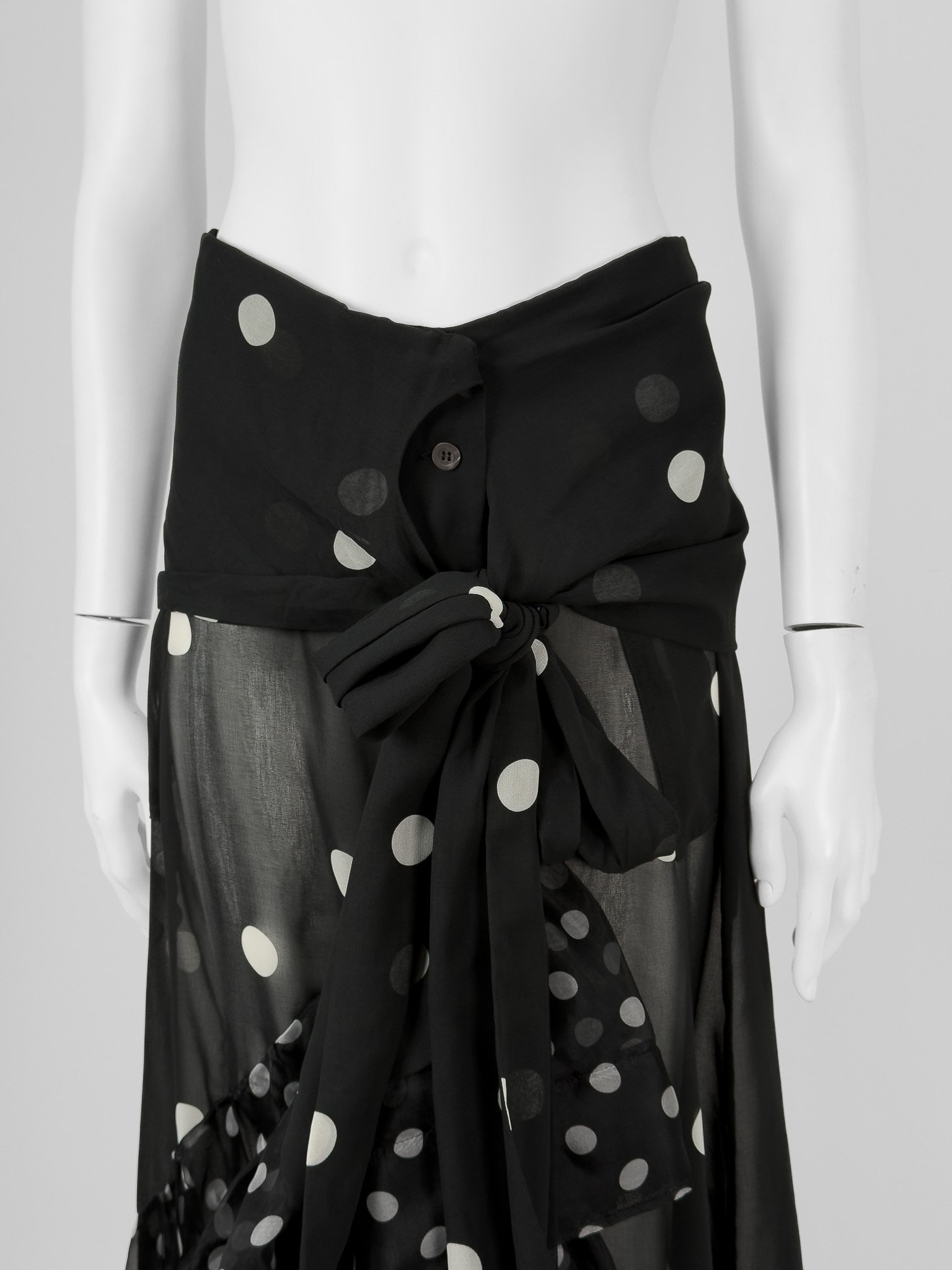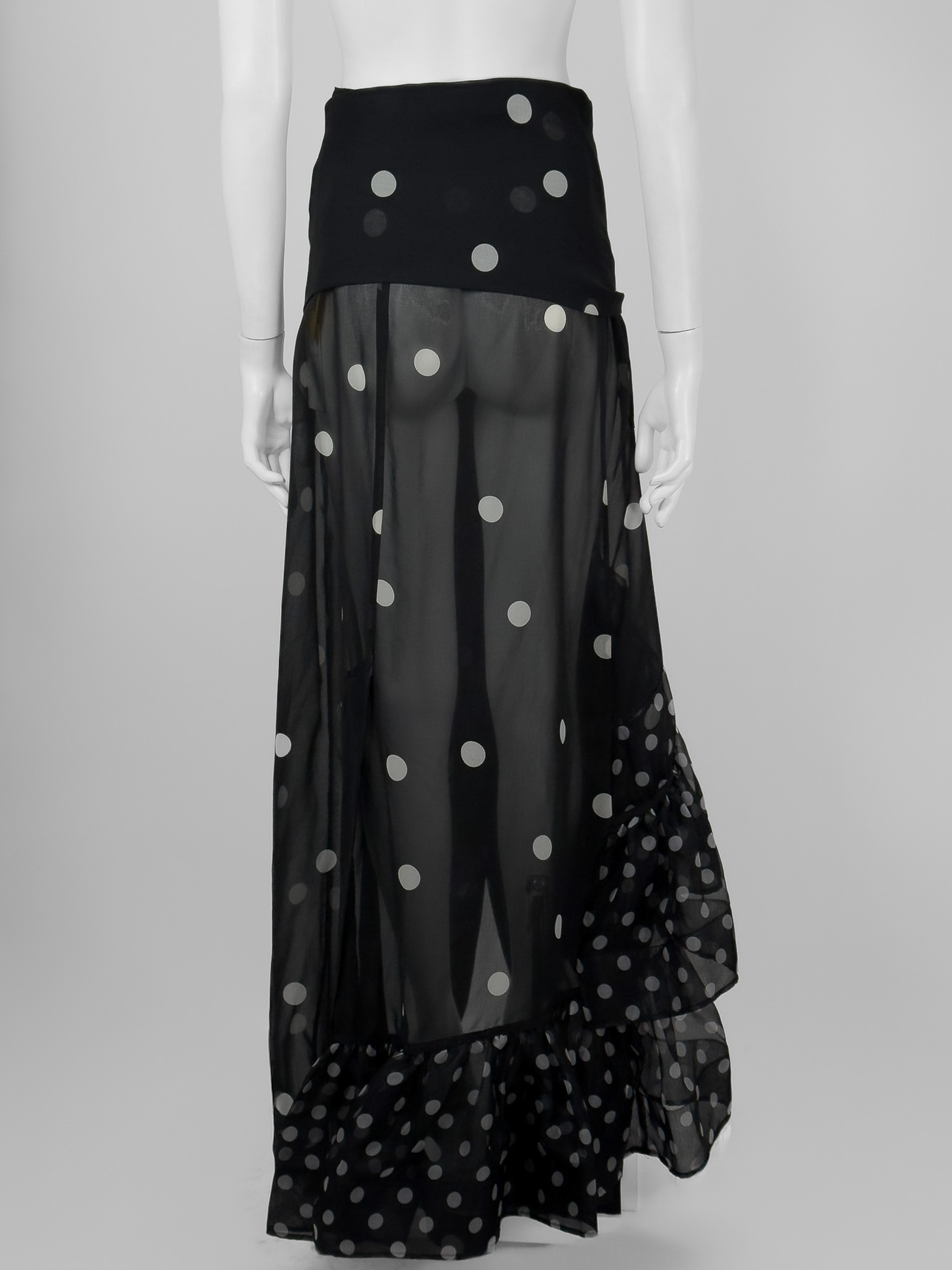 "Czarna spódnica w białe grochy, asymetryczna, długość maxi, ozdobiona falbaną wykończoną tiulem, miejscami transparentna, zapinana oraz wiązana w pasie. Stan bardzo dobry, w zestawie z metką. Rozmiar z metki 38. Skład: 100% poliester. Wymiary: szerokość w pasie 36cm, długość całkowita 120cm."