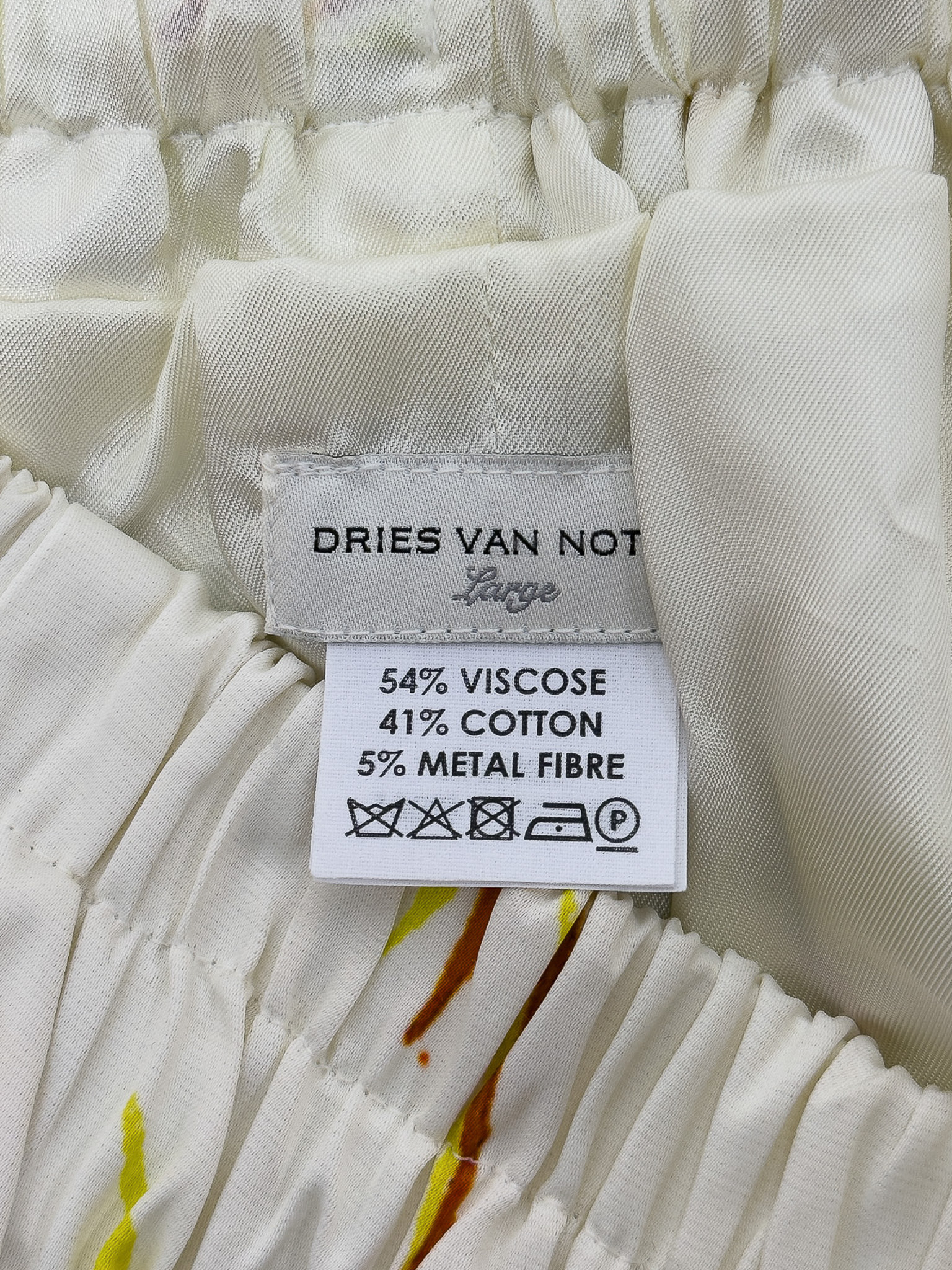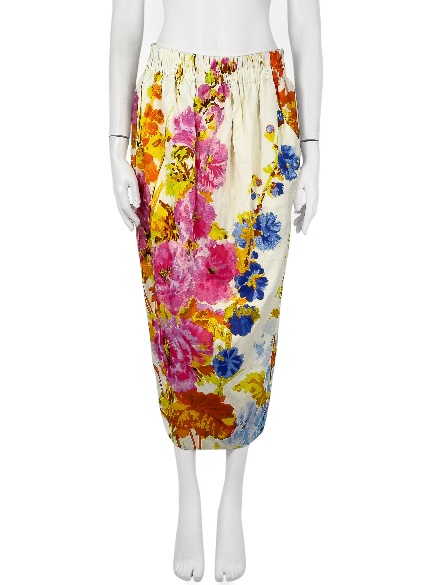 "Kremowa marszczona spódnica w wielobarwną grafikę kwiatową, długość midi, guma w pasie, regulowana sznurkiem od wewnętrznej strony.dwie kryte kieszenie po bokach, rozcięcie. Stan bardzo dobry. Rozmiar z metki L. Skład: 54% wiskoza, 41% bawełna, 5%włókna metalizowane. Wymiary: szerokość w pasie 38cm, długość całkowita 88cm."