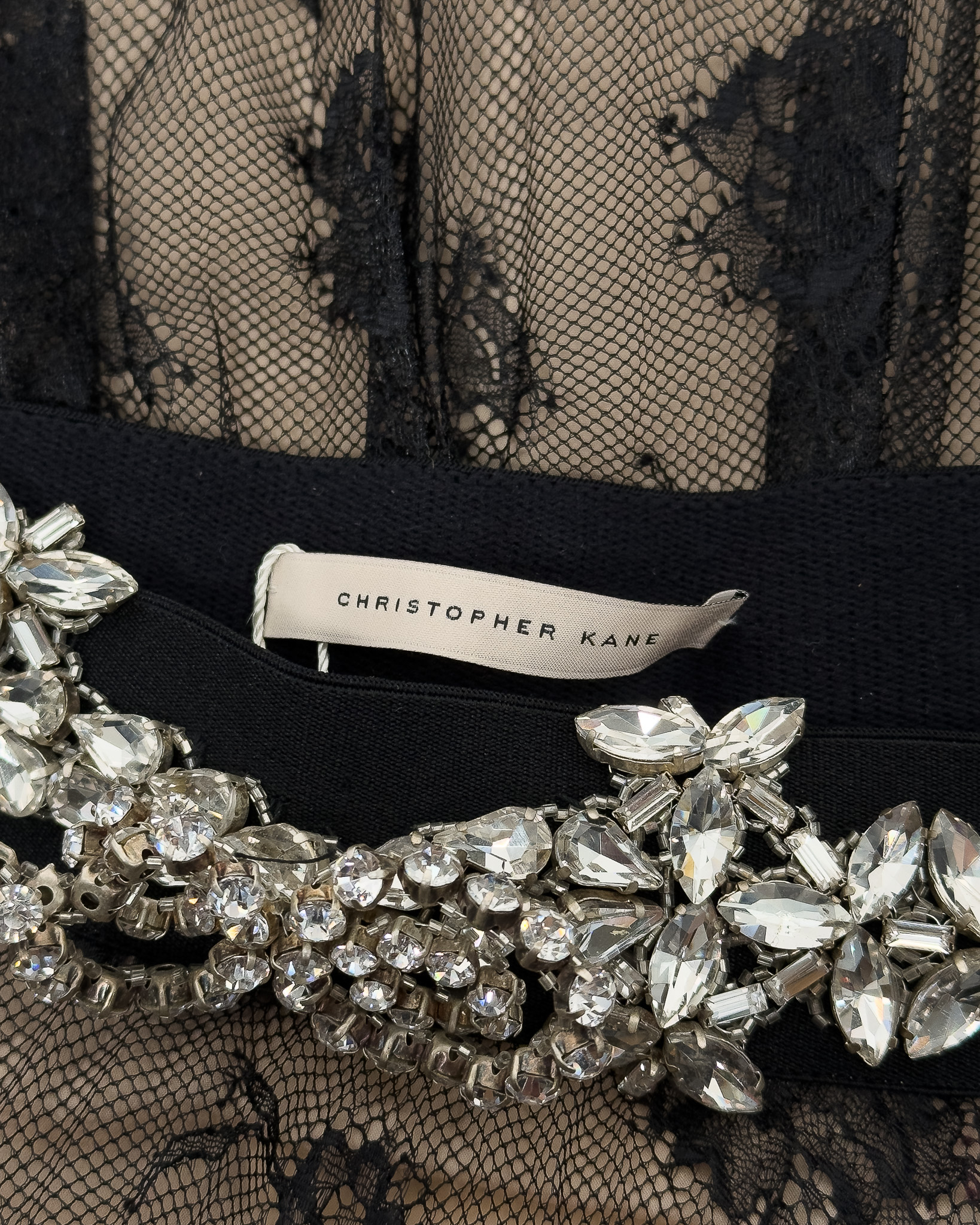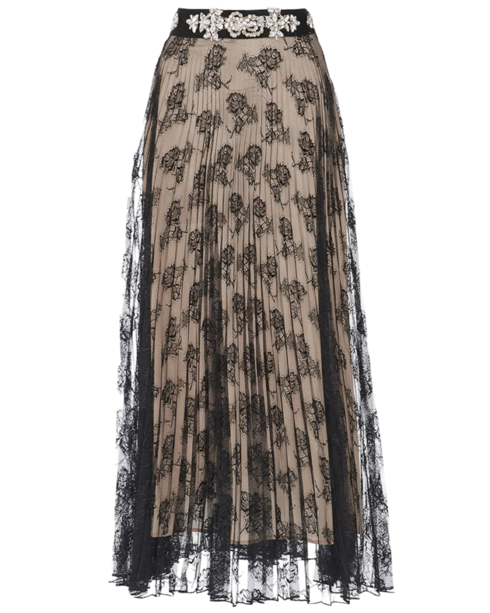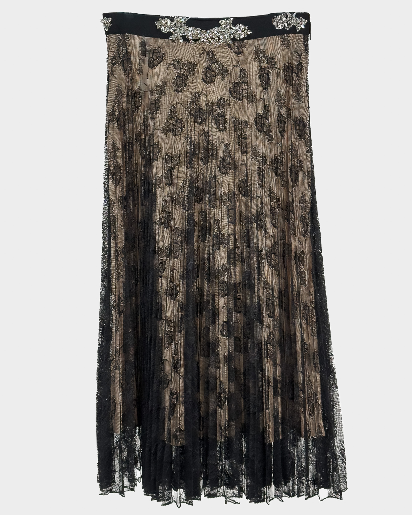 "Czarna tiulowa, transparentna spódnica we wzór koronki, beżowa halka, talia wysadzana kryształami we wzór kokardki oraz gwiazdek. Stan bardzo dobry. Rozmiar z metki IT46. Skład: 100% poliester, podszewka: 52% nylon, 39% jedwab, 9% elastan. Wymiary: szerokość w pasie 40cm, długość całkowita 93cm."