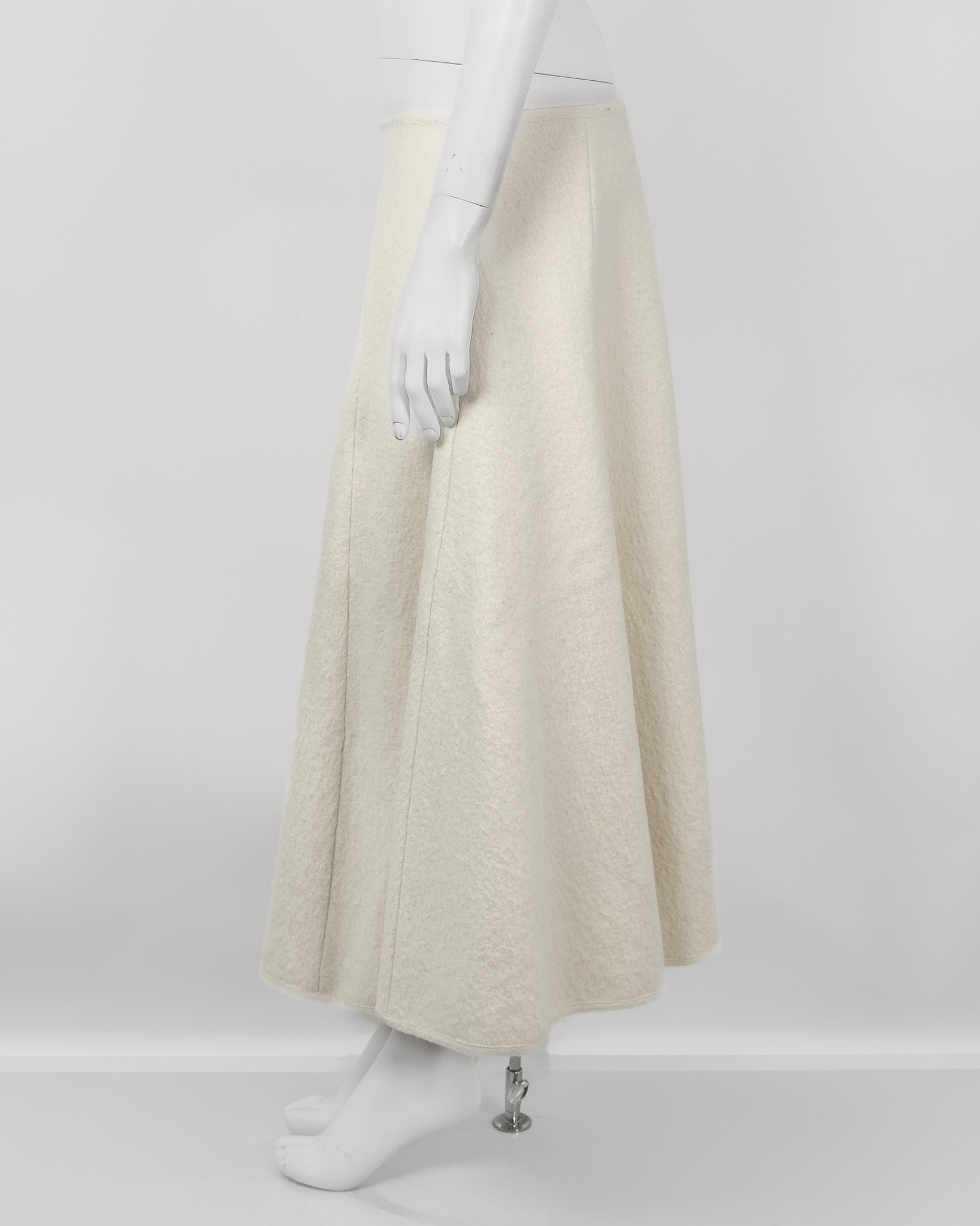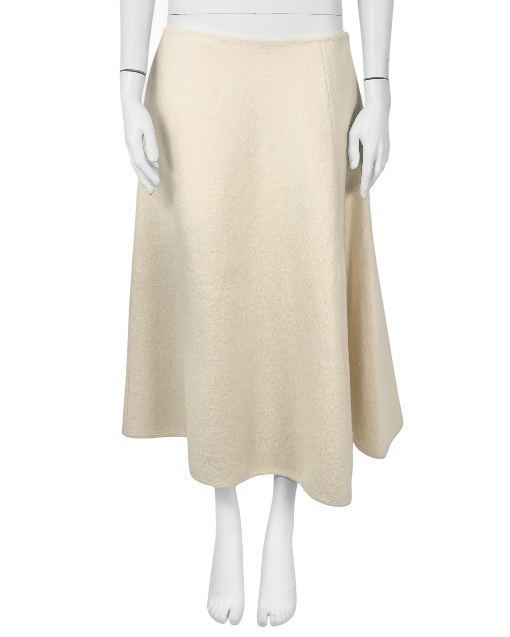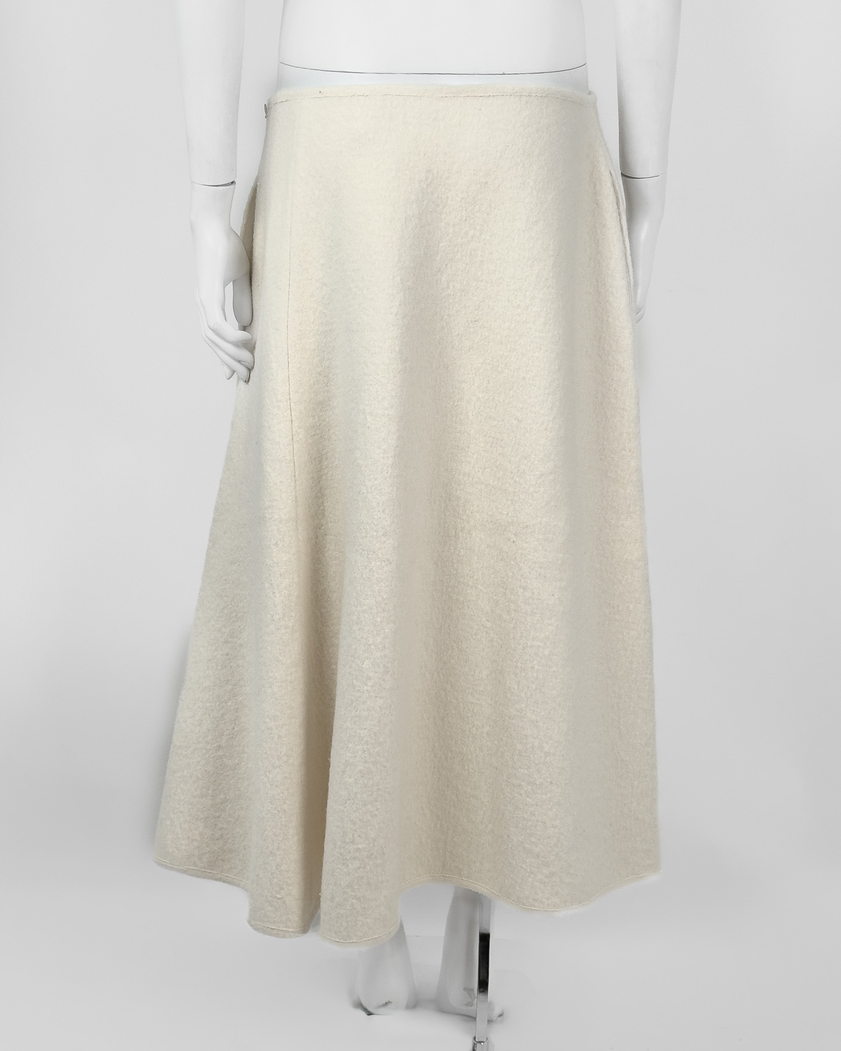 "Kremowa spódnica z domieszką bawełny oraz wełny w składzie, rozkloszowany krój, długość midi, zapinana w bocznej części na suwak oraz haftkę, dwie kryte kieszenie po bokach, brak podszewki. Stan bardzo dobry. Rozmiar z metki IT 42. Wymiary: szerokość w pasie 40cm, długość całkowita 80cm."