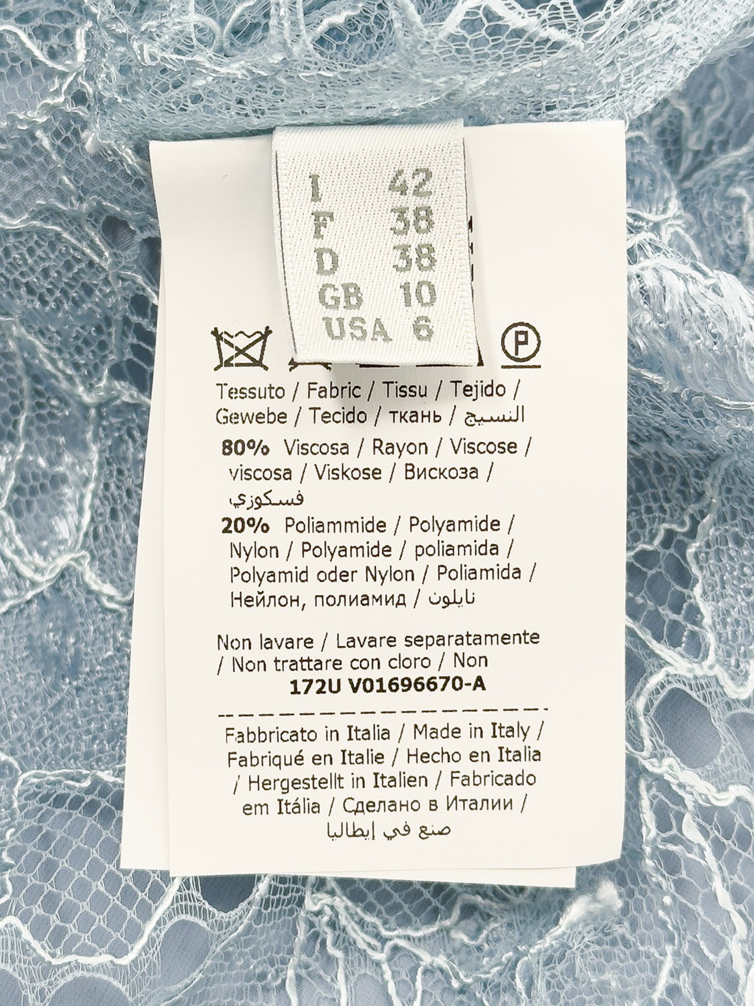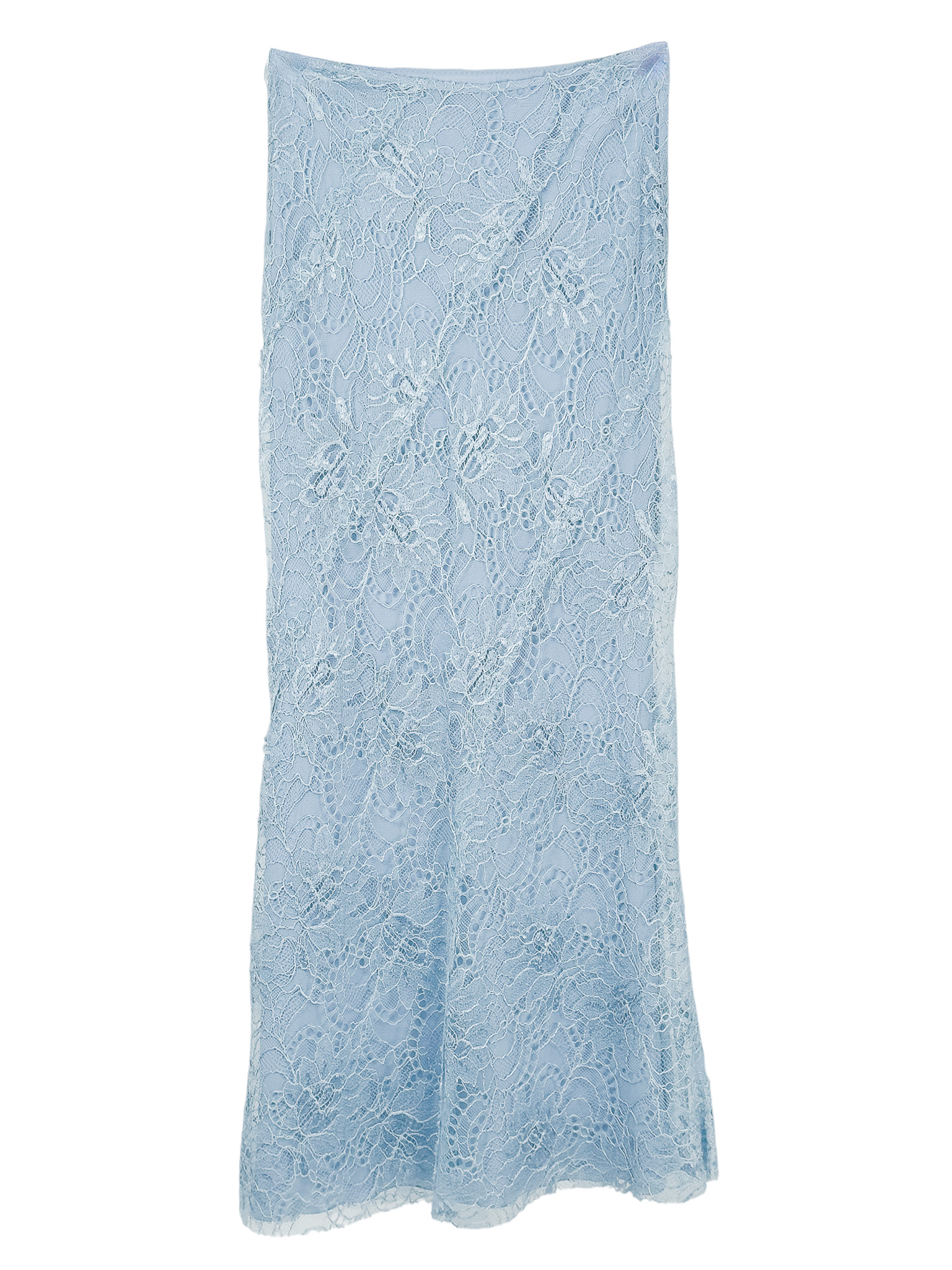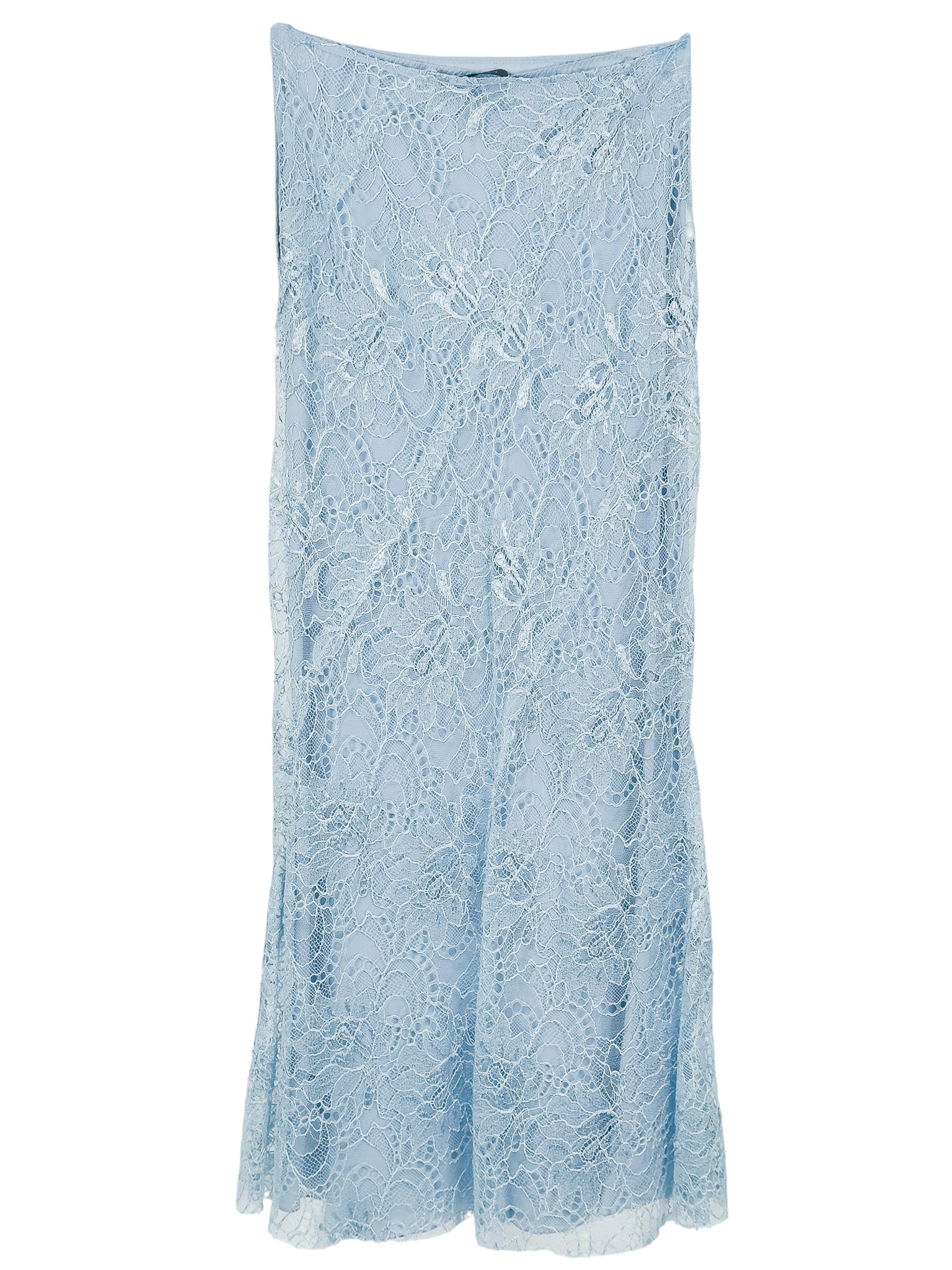 "Błękitna, koronkowa, maxi spódnica w motyw kwiatowy. Wysoki stan. Halka wykończona gumą w pasie. Stan bardzo dobry. Rozmiar z metki IT 42. Skład: 86% acetat, 9% jedwab, 5% inne tkaniny. Wymiary: szerokość w pasie 39cm, długość całkowita 110cm."