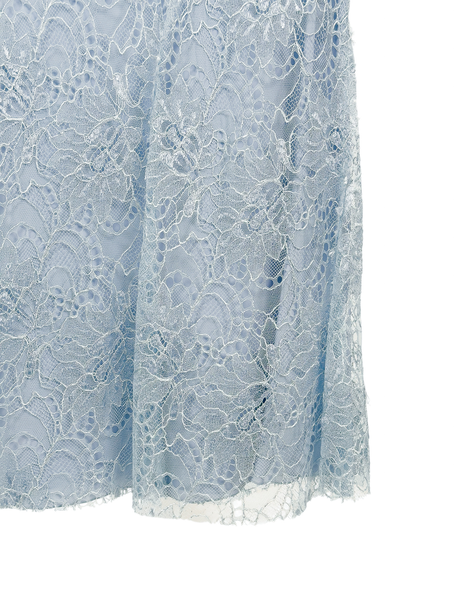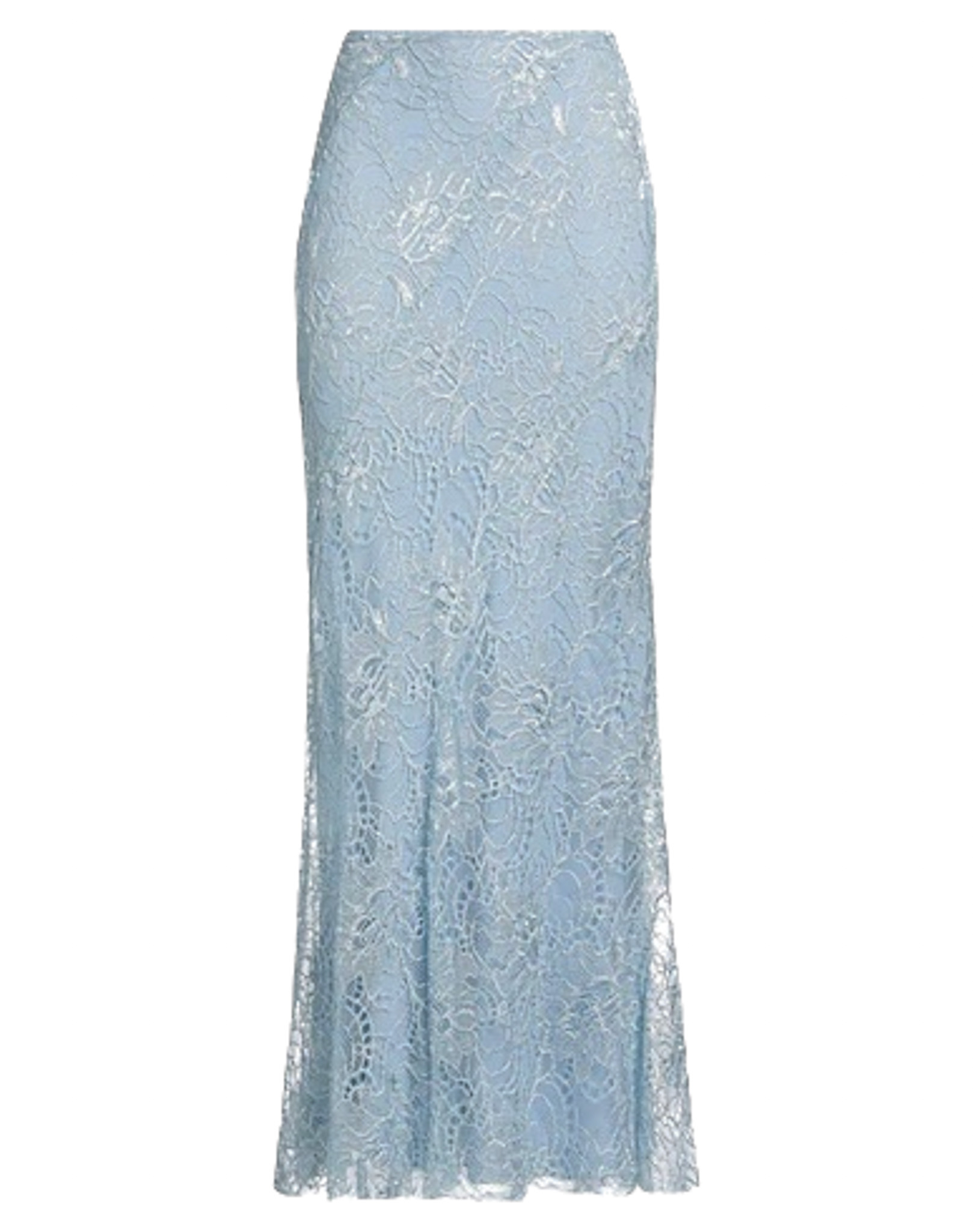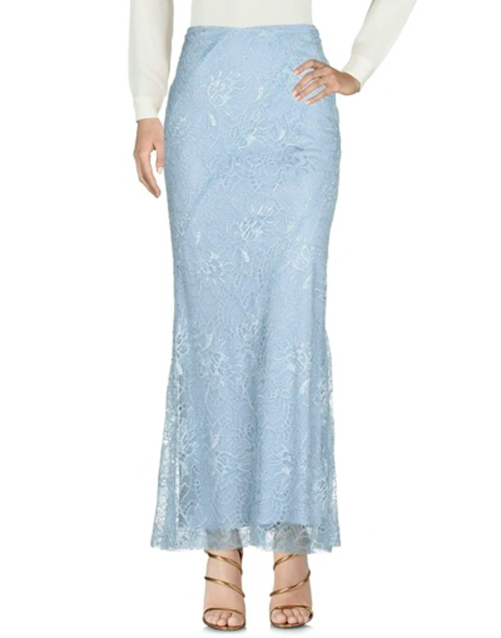 "Błękitna, koronkowa, maxi spódnica w motyw kwiatowy. Wysoki stan. Halka wykończona gumą w pasie. Stan bardzo dobry. Rozmiar z metki IT 42. Skład: 86% acetat, 9% jedwab, 5% inne tkaniny. Wymiary: szerokość w pasie 39cm, długość całkowita 110cm."