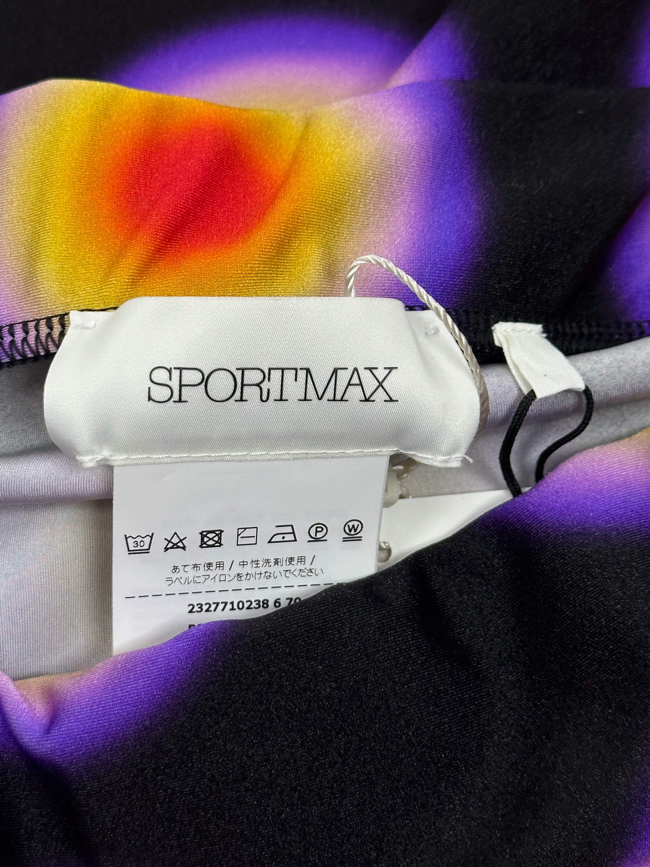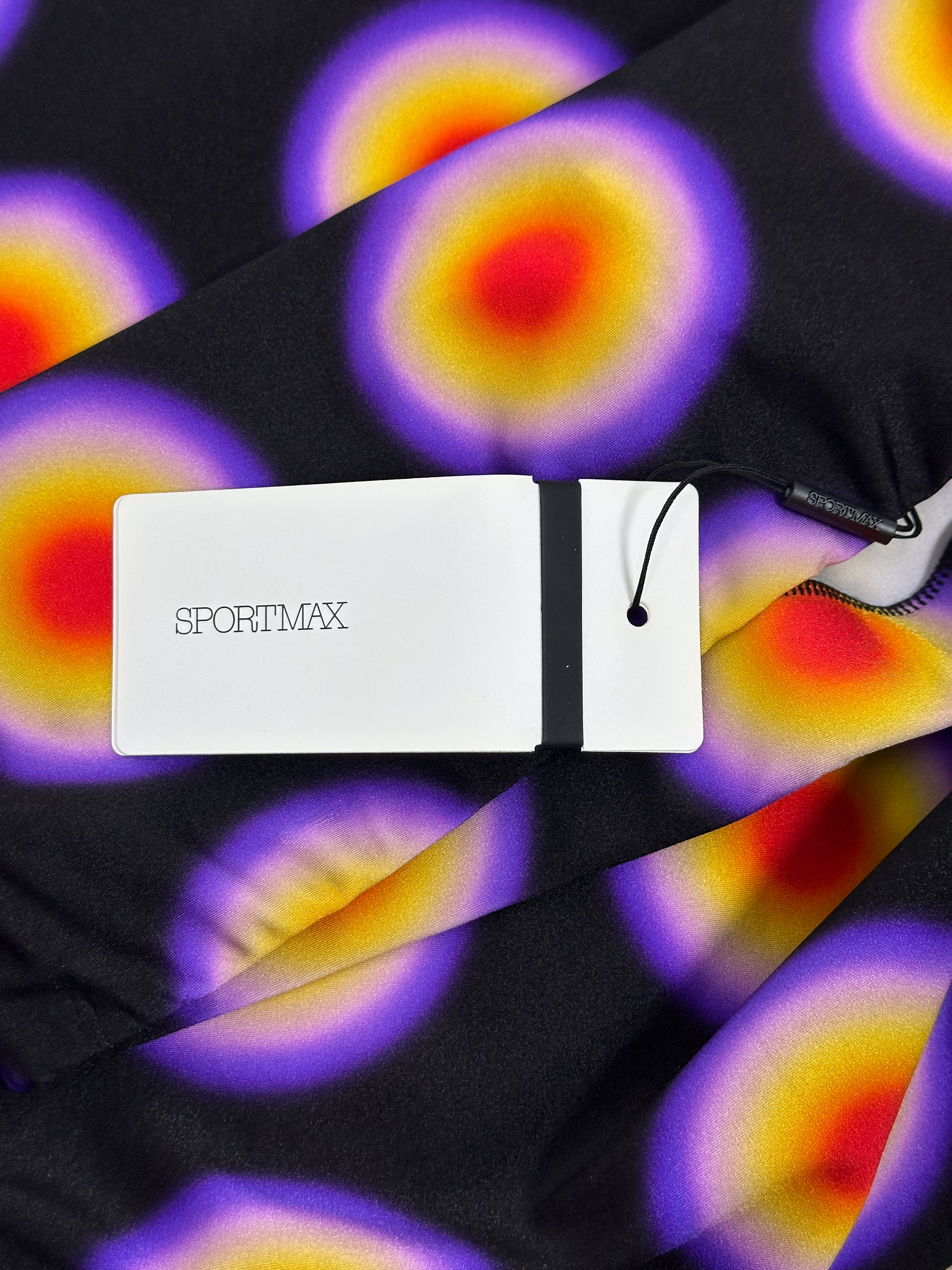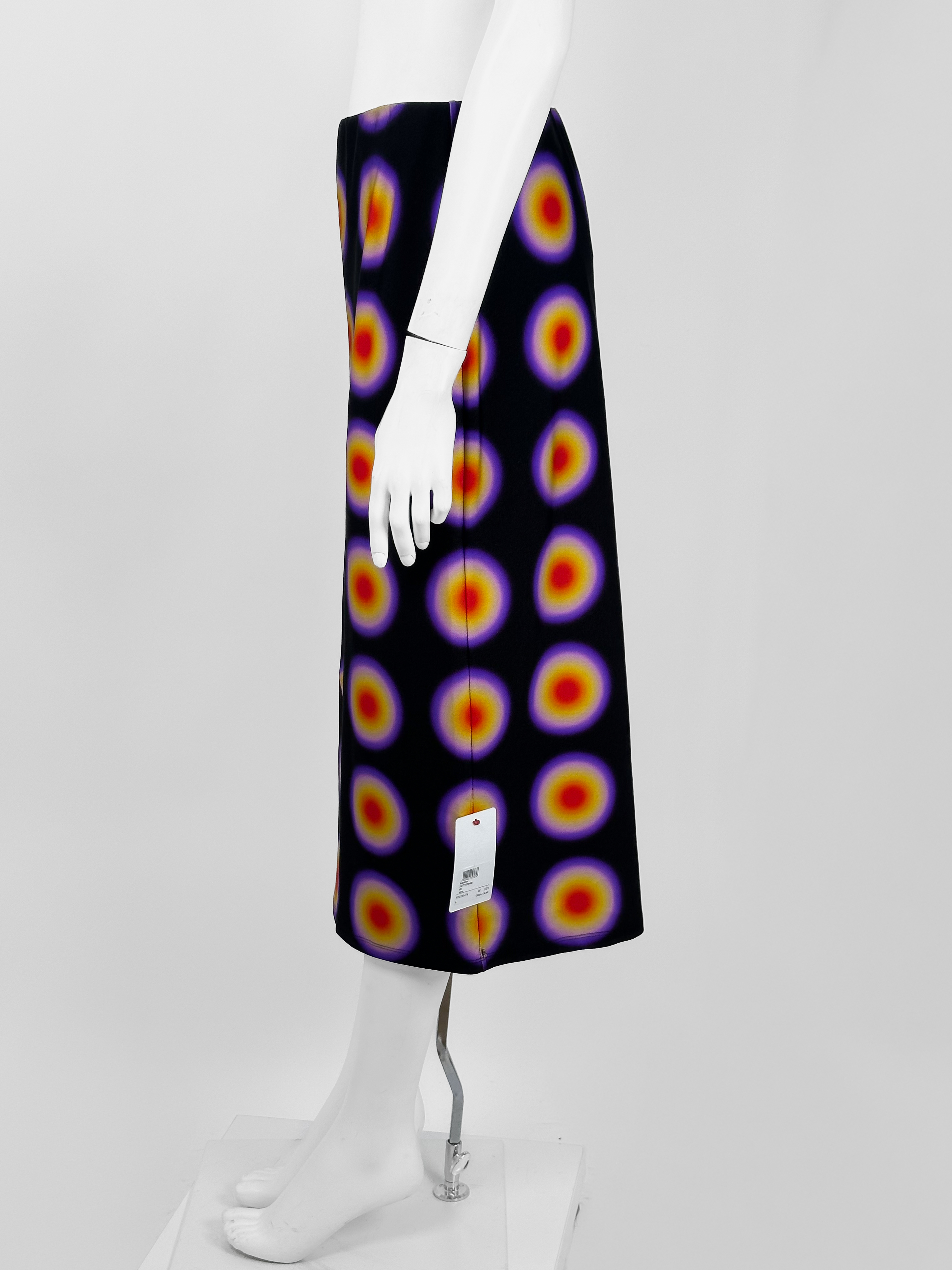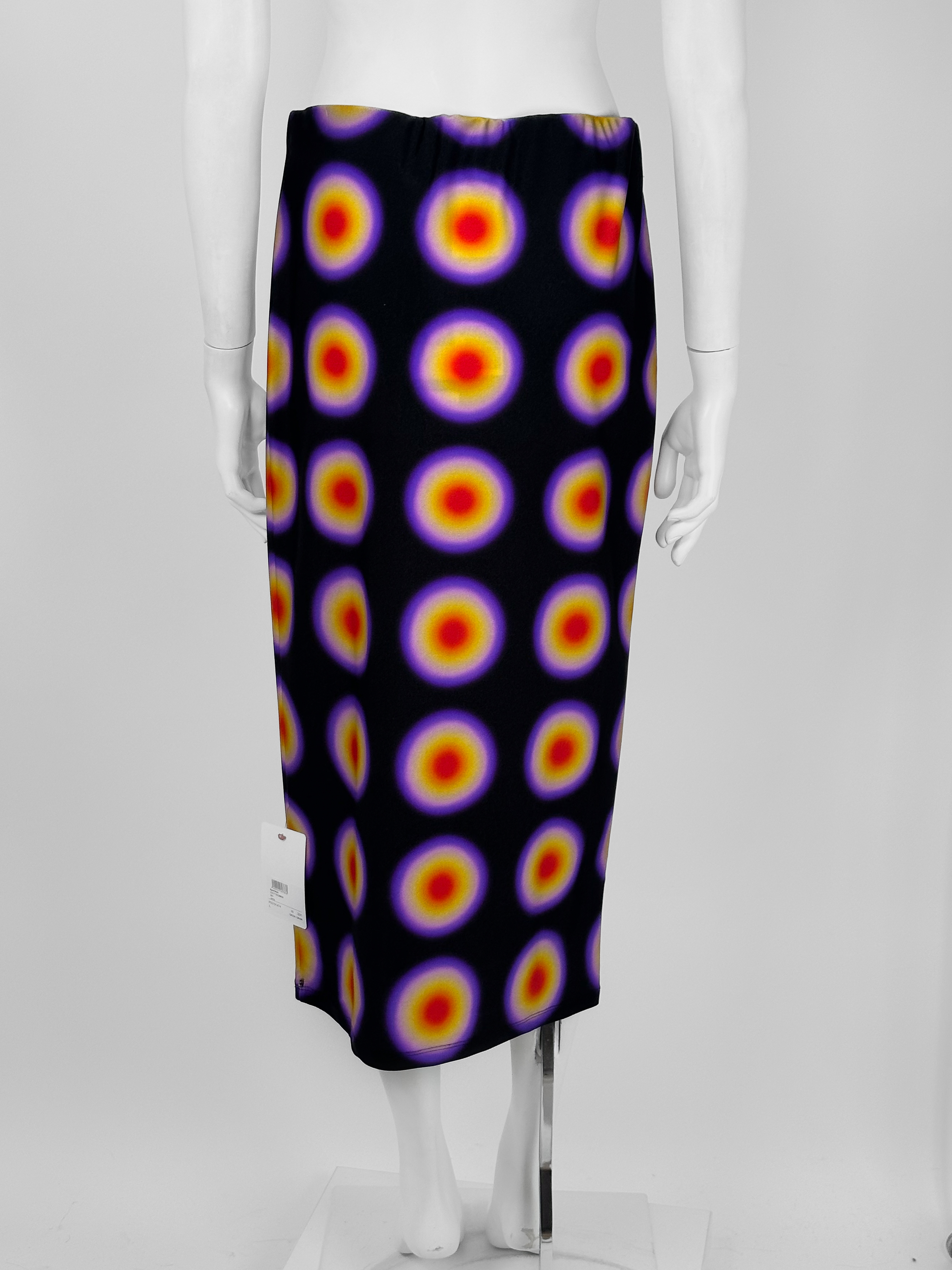 "Czarna spódnica midi w motyw fioletowo-żółto-czerwonych kół, prosty ołówkowy, dopasowany krój, guma w pasie. Stan nowa z metką. Rozmiar z metki L. Skład: 80% poliamid, 20% elastan. Wymiary: szerokość w pasie 39cm, długość całkowita 81cm."