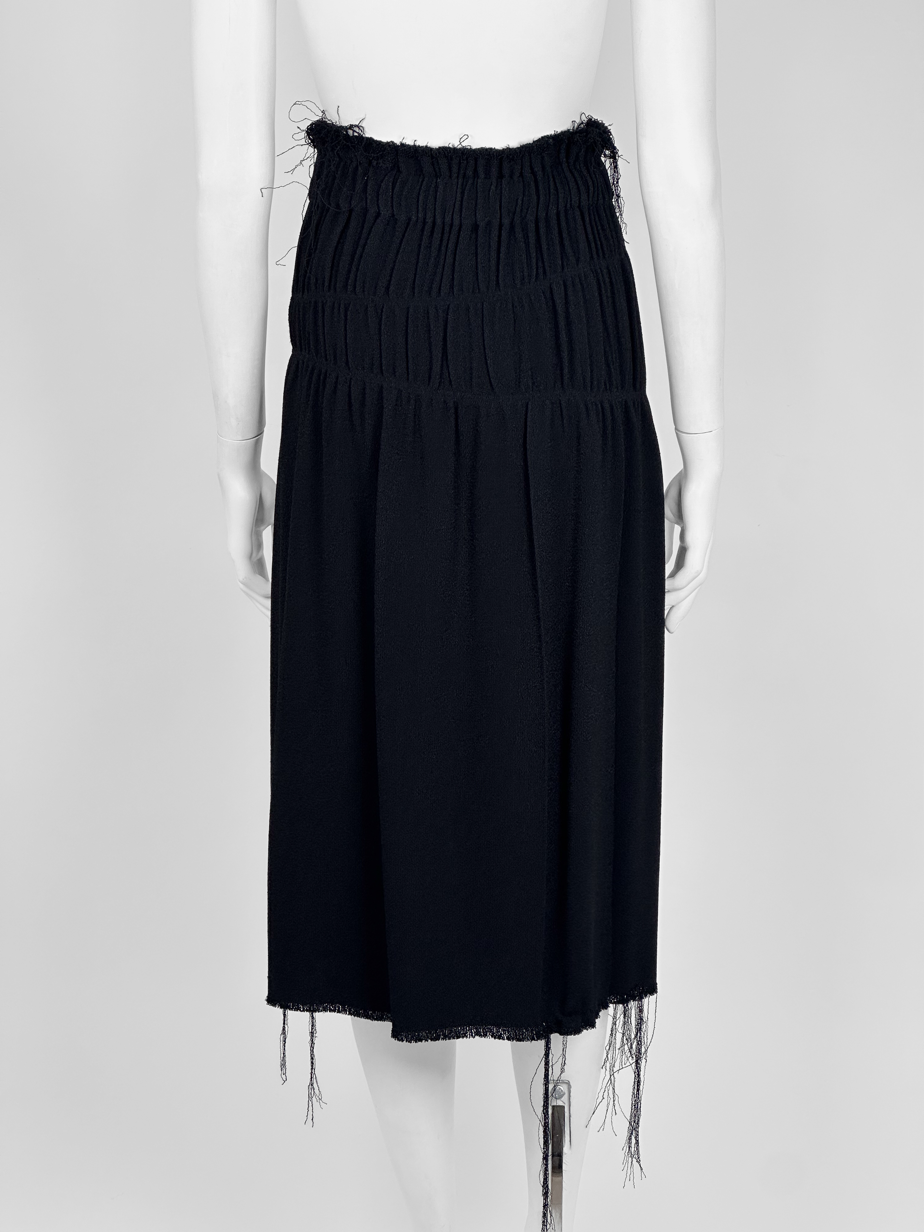 "Czarna spódnica za kolano, motyw postrzępionego materiału, drapowanie materiału. Nowa z metką. Rozmiar 6. Skład: 100% wiskoza. Wymiary: szerokość w pasie 35cm, długość całkowita 79cm."