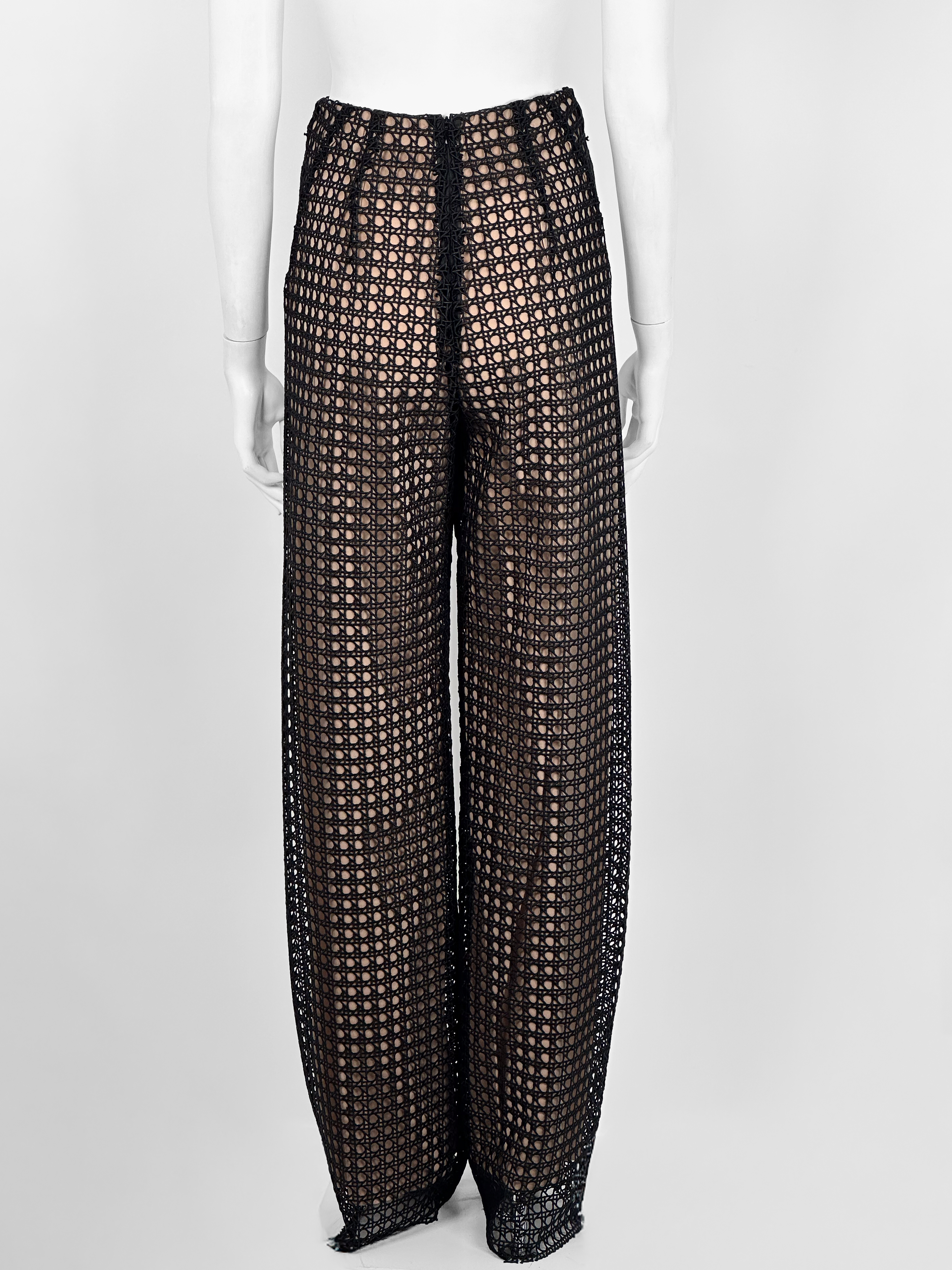 "Czarno-beżowe spodnie, prosta, długa nogawka, ażurowe, beżowa podszewka, zapinane na kryty suwak w tylnej części, wysoki stan. Stan nowe z metką. Rozmiar z metki 8. Skład: 97% poliester, 3% elastan; 100% poliester. Wymiary: szerokość w pasie 33cm, długość całkowita 122cm."