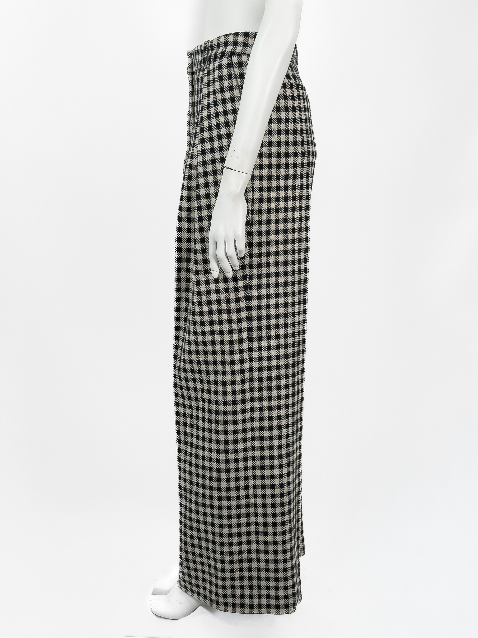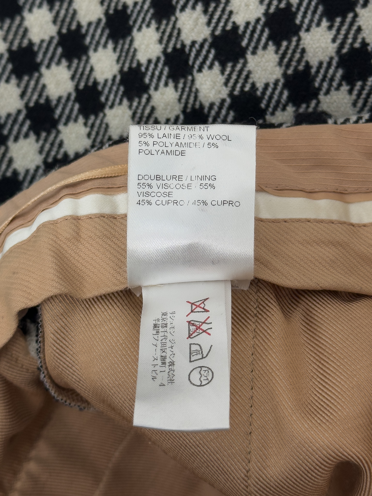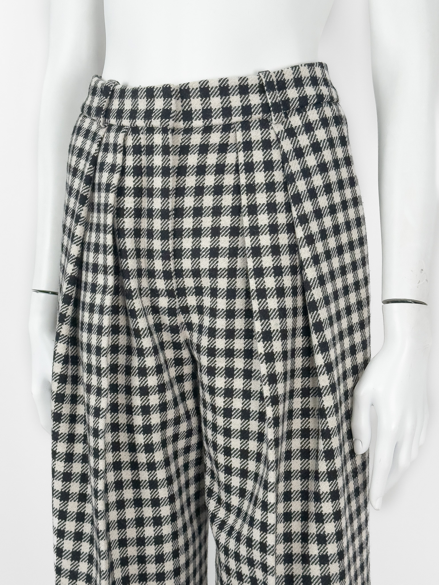 "Wełniane spodnie w beżowo-czarną pepitkę, prosta, szeroka nogawka, wysoki stan, zaszewki, szlufki w pasie, dwie kryte kieszenie po bokach, zapinane na kryty logowany suwak, haftkę oraz guzik. Stan bardzo dobry. Rozmiar z metki 34. Skład: 95% wełna, 5% poliamid; podszewka: 55% wiskoza, 45% kupro. Wymiary: szerokość w pasie 34,5cm, długość mierzona od zewnętrznej strony nogawki 116cm."