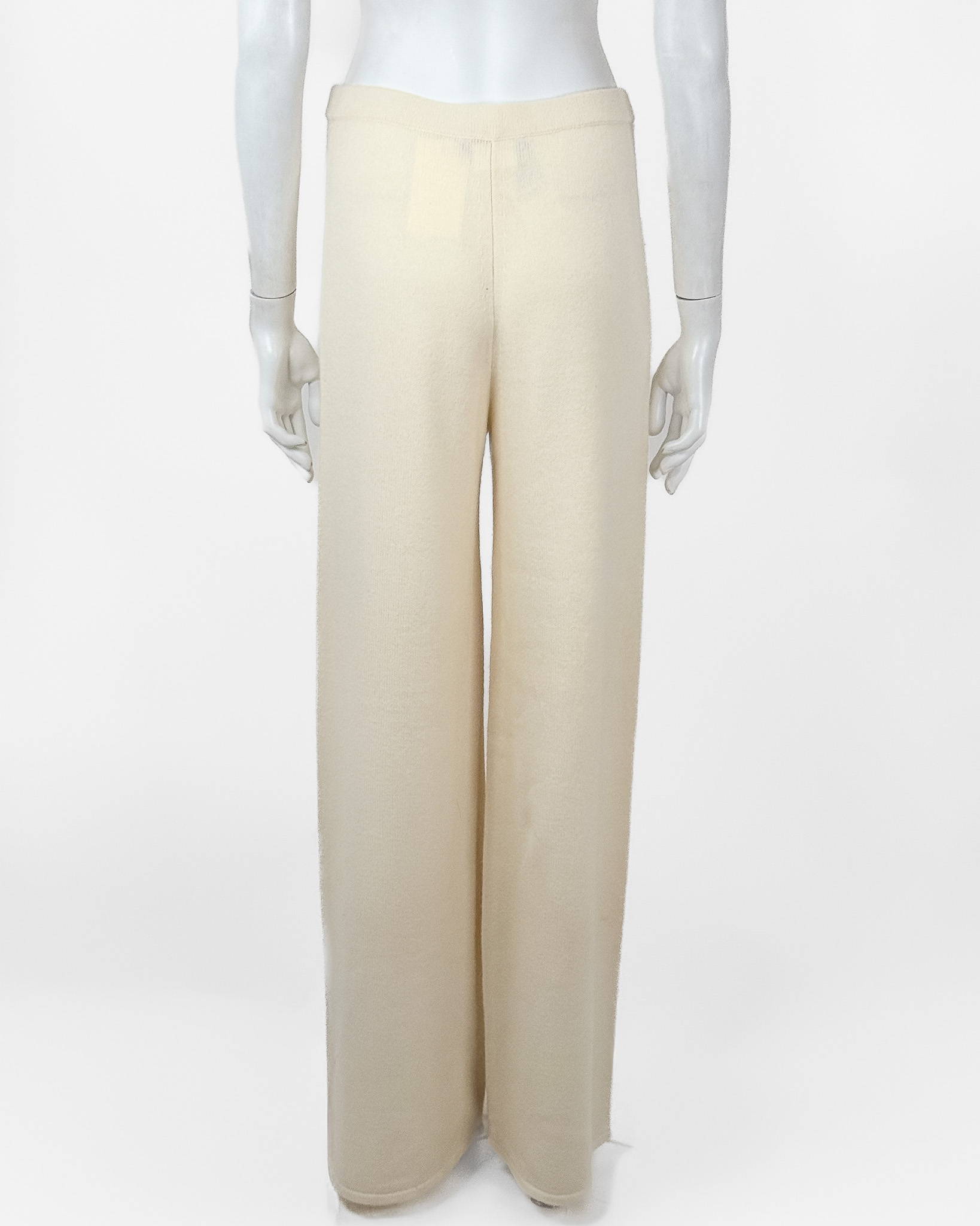 "Wełniano- kaszmirowe kremowe spodnie, prosta, szeroka nogawka, wysoki stan, guma w pasie. Stan bardzo dobry. Rozmiar z metki L. Skład: 80% wełna, 20% kaszmir. Wymiary: szerokość w pasie 38cm, długość całkowita mierzona od zewnętrznej strony nogawki 116cm."