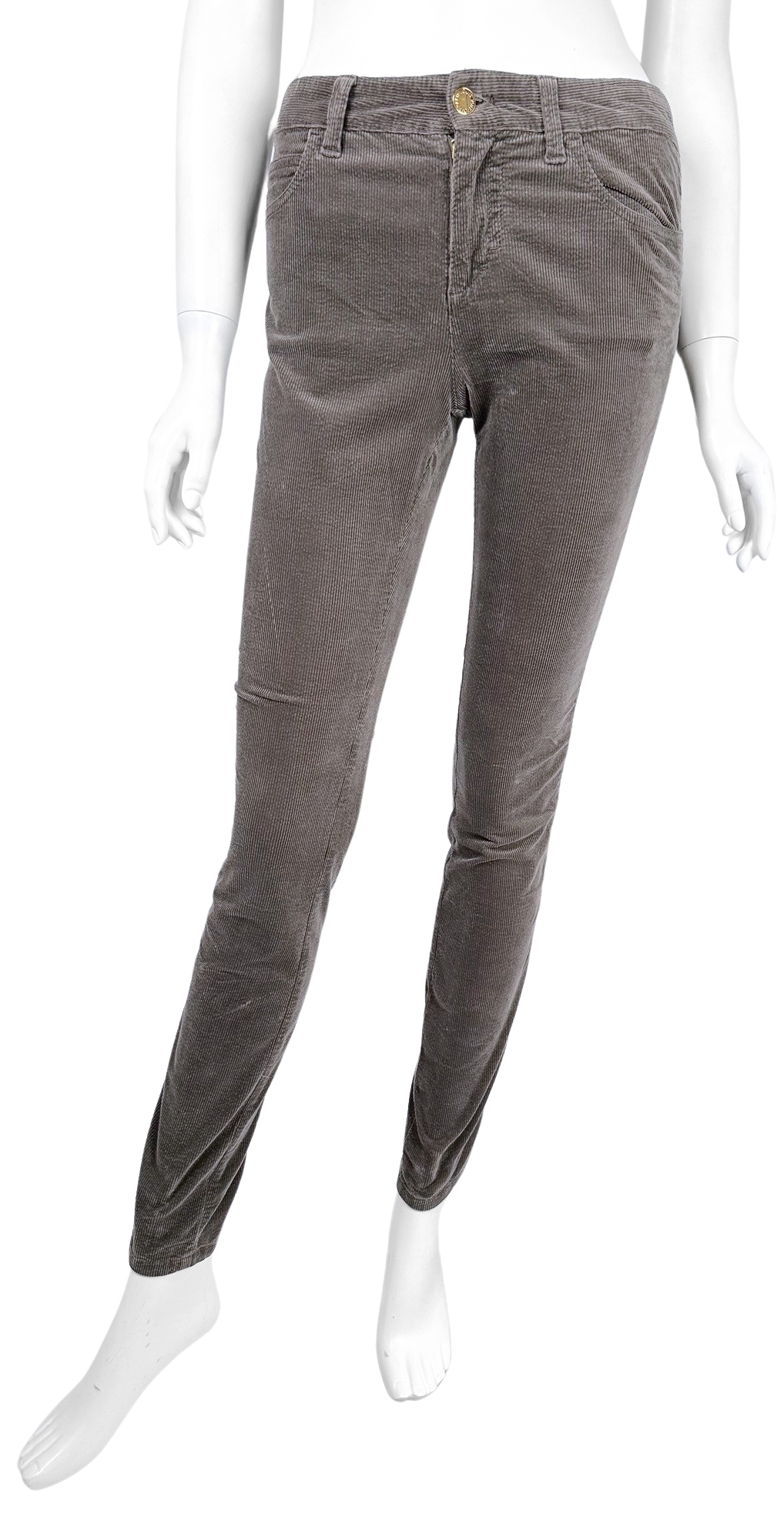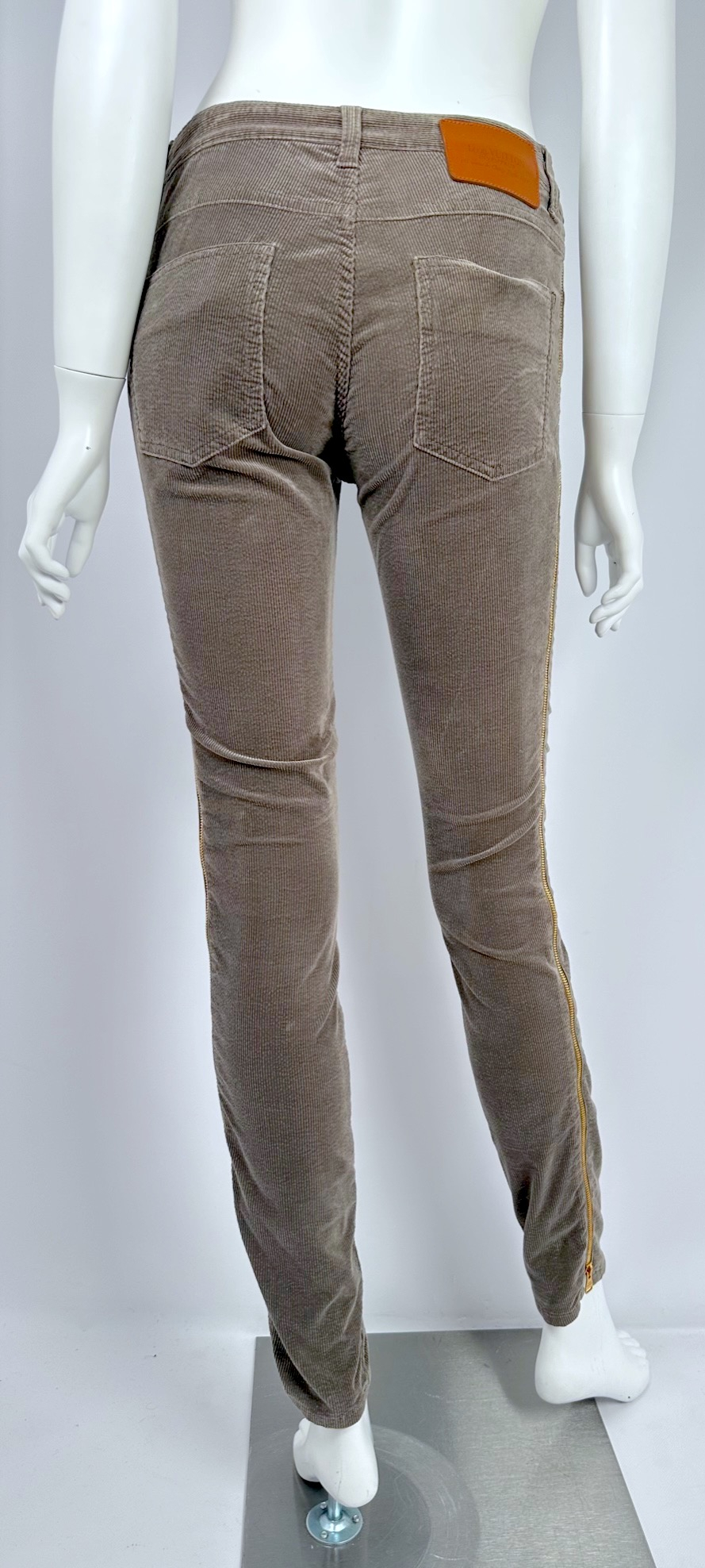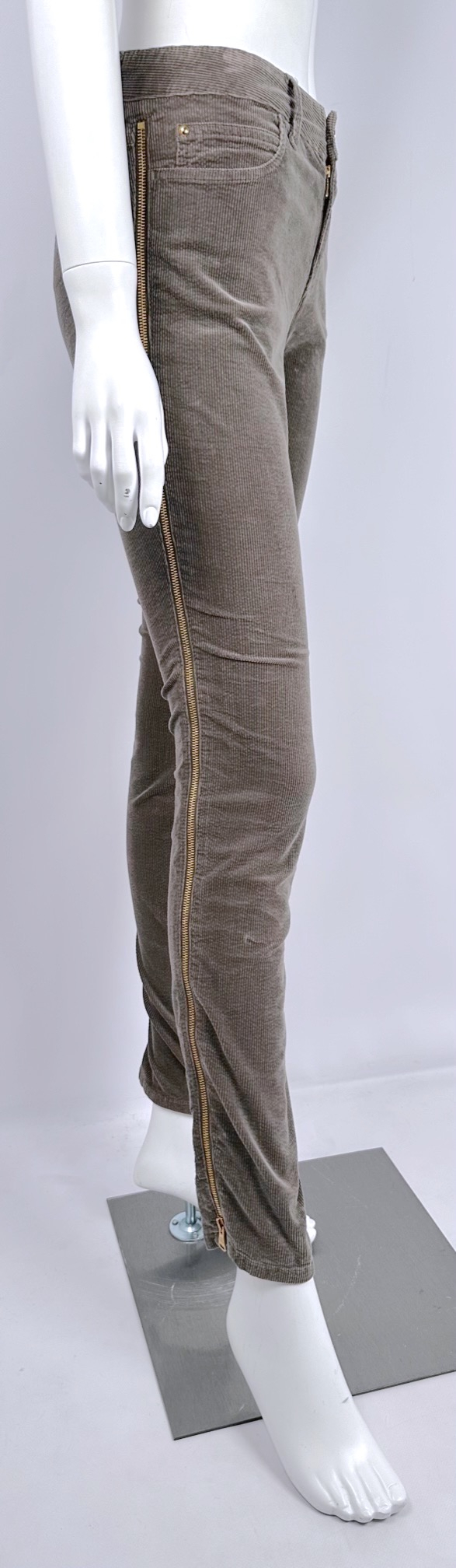 "Sztruksowe, popielate spodnie rurki. Po obydwu stronach mają charakterystyczne złote suwaki z możliwością całkowitego rozsunięcia, które biegną od linii biodra aż po koniec nogawki. Z przodu mają trzy, a z tyłu dwie kieszenie. Zapinane są na kryty zamek oraz złoty guzik z grawerowany logo. Stan: bardzo dobry. Rozmiar: 36. Skład: 98% bawełna, 2% elastan. Wymiary: wys. stanu: 21 cm., dł. całkowita: 98 cm., dł. wewnętrzna nogawki: 78 cm., szer. (mierzona na linii biodra): 22 cm., szer. w pasie: 36 cm., szer. w biodrach: 42 cm"