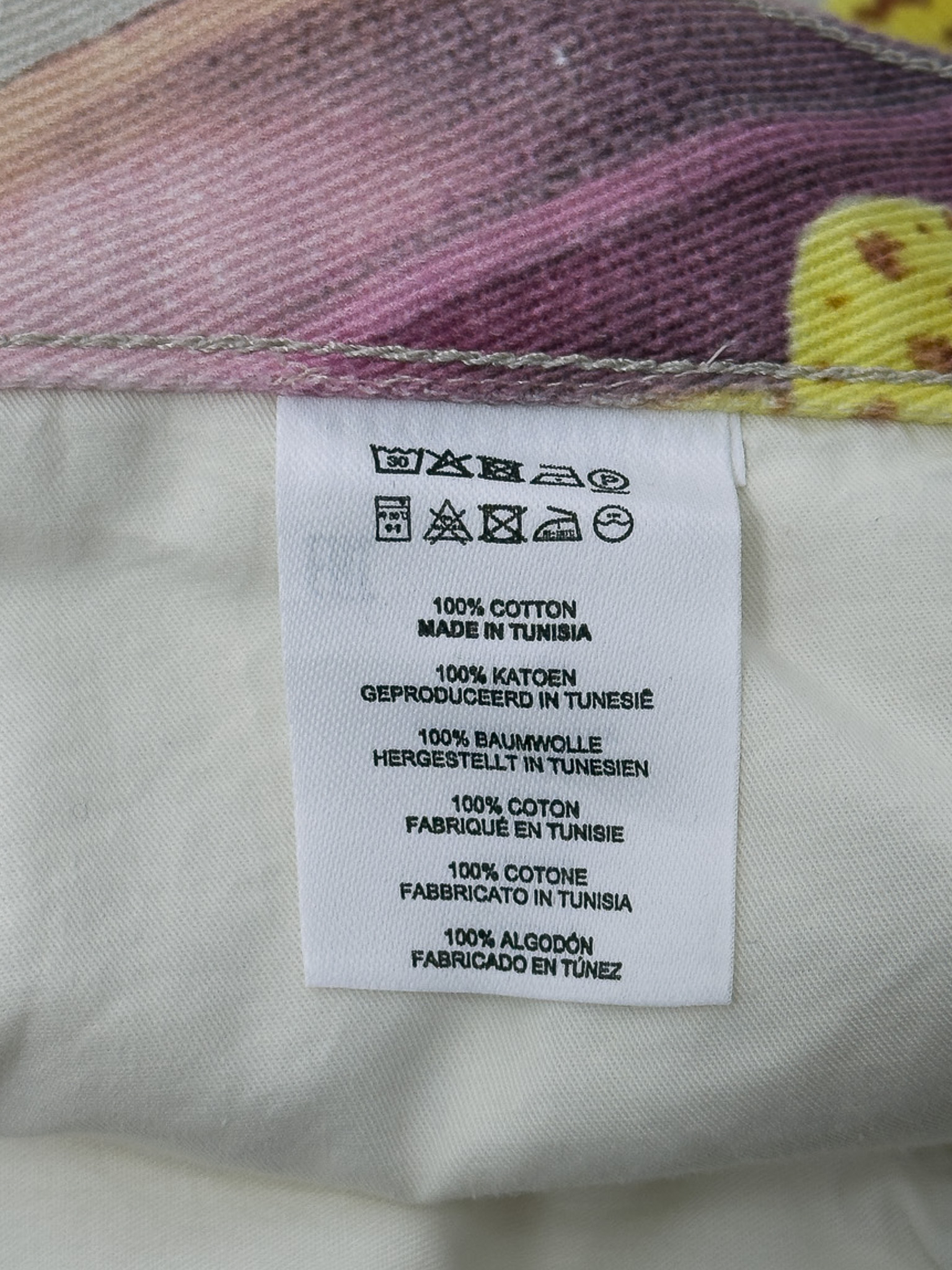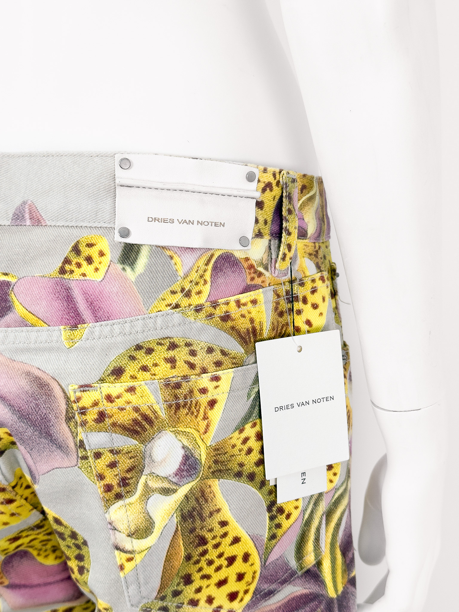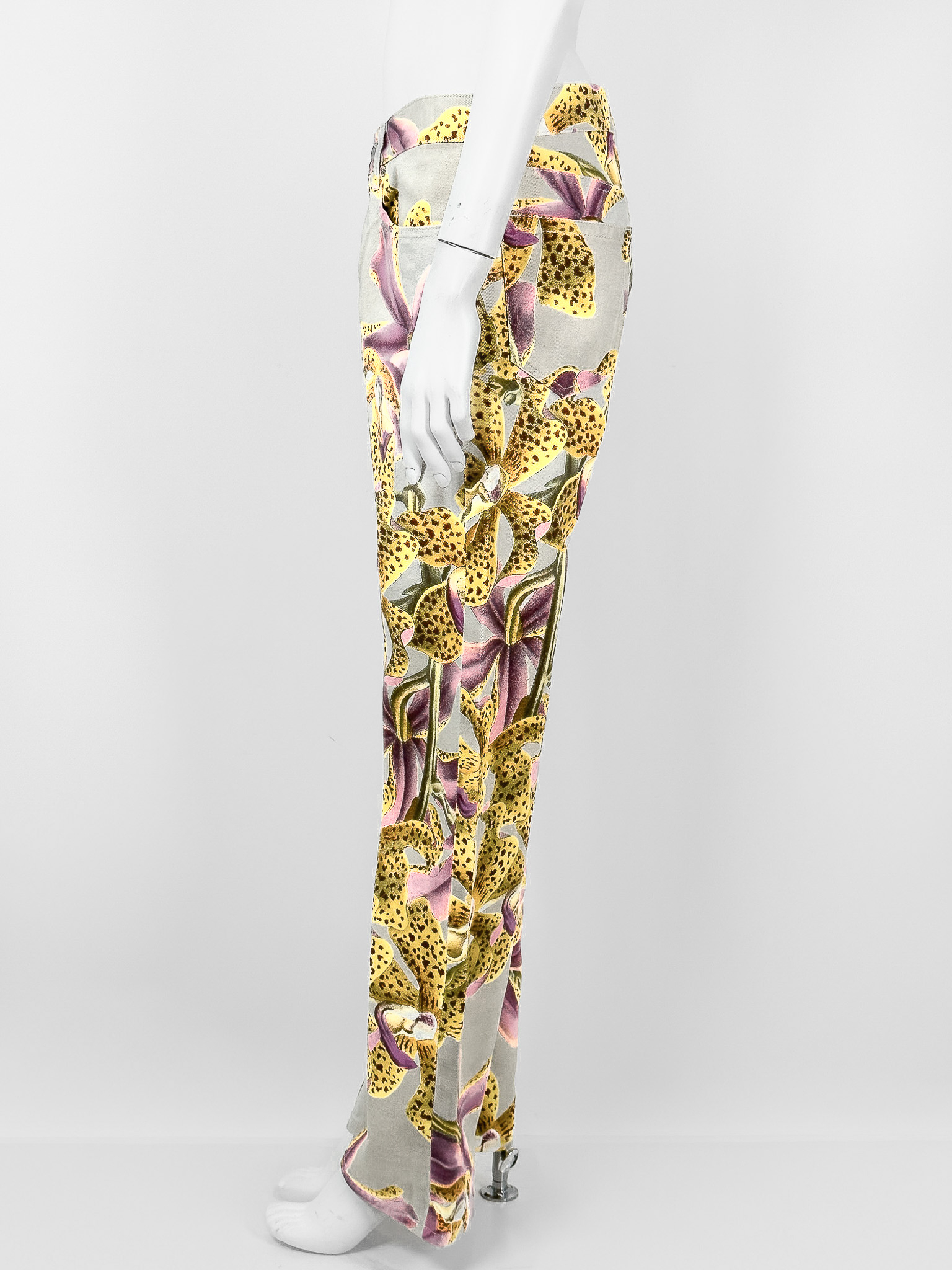 "Jasnoszare spodnie jeansowe ozdobione żółto-różowym wzorem o motywie kwiatowym, wysoki stan, prosta nogawka, zapinane na kryte guziki oraz jeden widoczny logowany, pięć kieszeni, skórzana naszywka z logo marki na wysokości szlufek. Stan nowe z metką Rozmiar z metki 30. Skład: 100% bawełna. Wymiary: szerokość w pasie 42cm, długość całkowita mierzona od zewnętrznej strony nogawki 106cm."