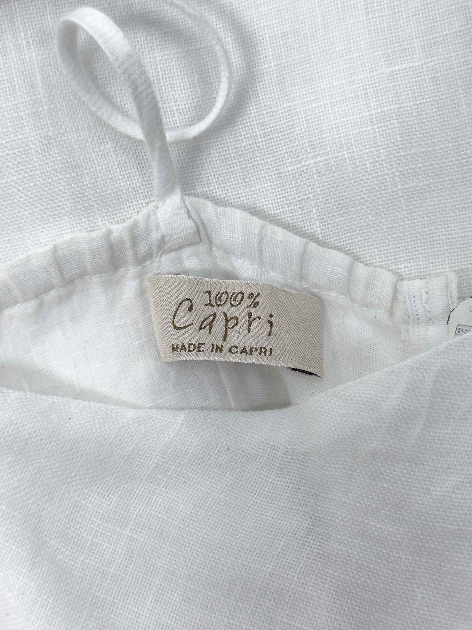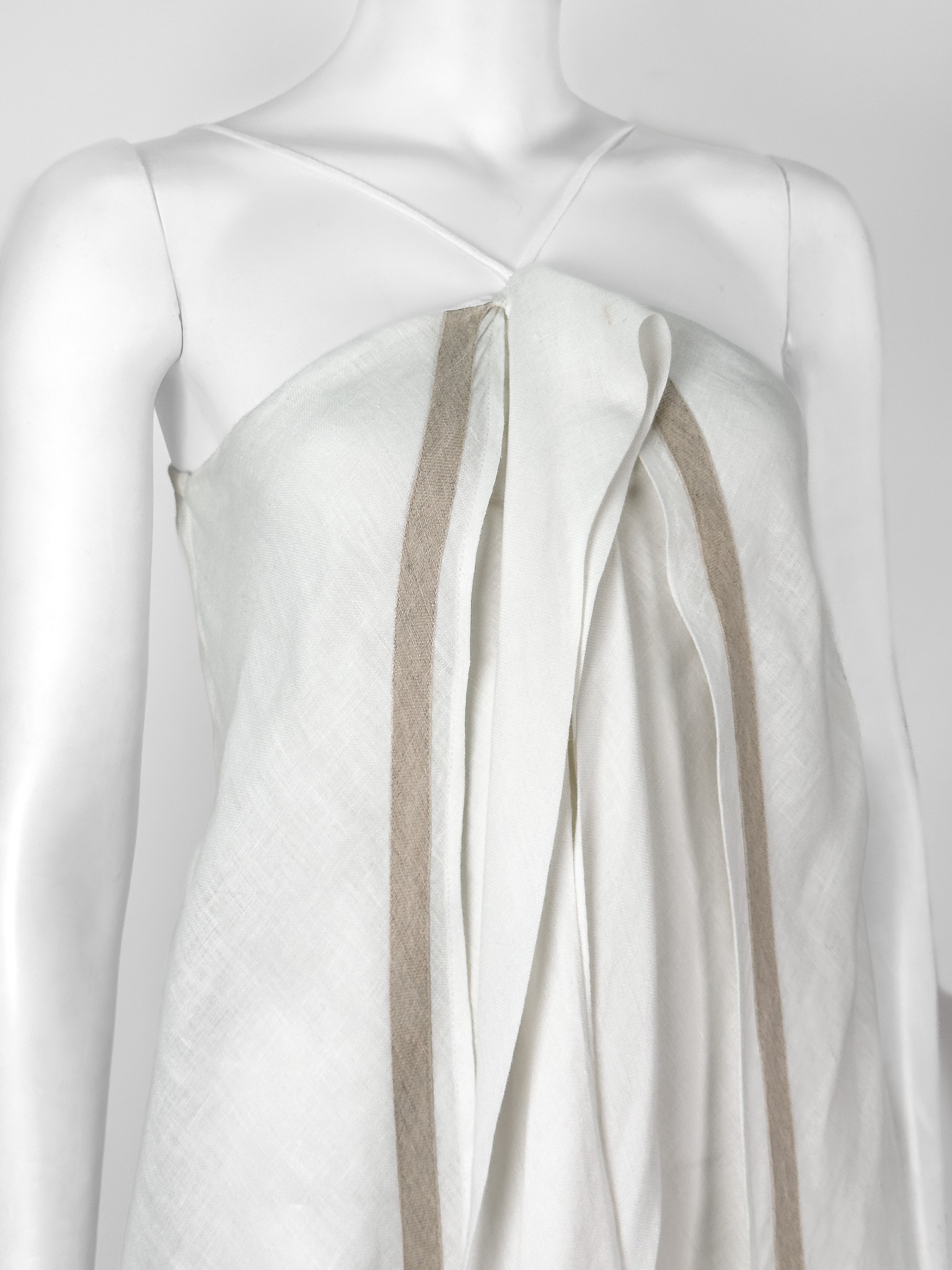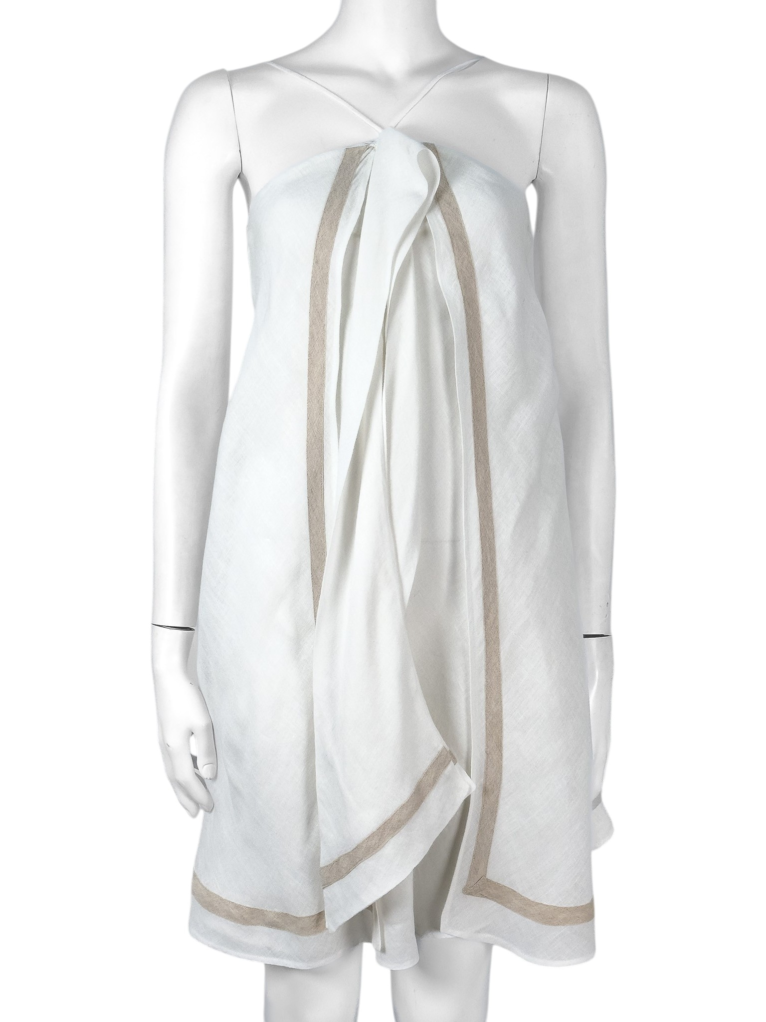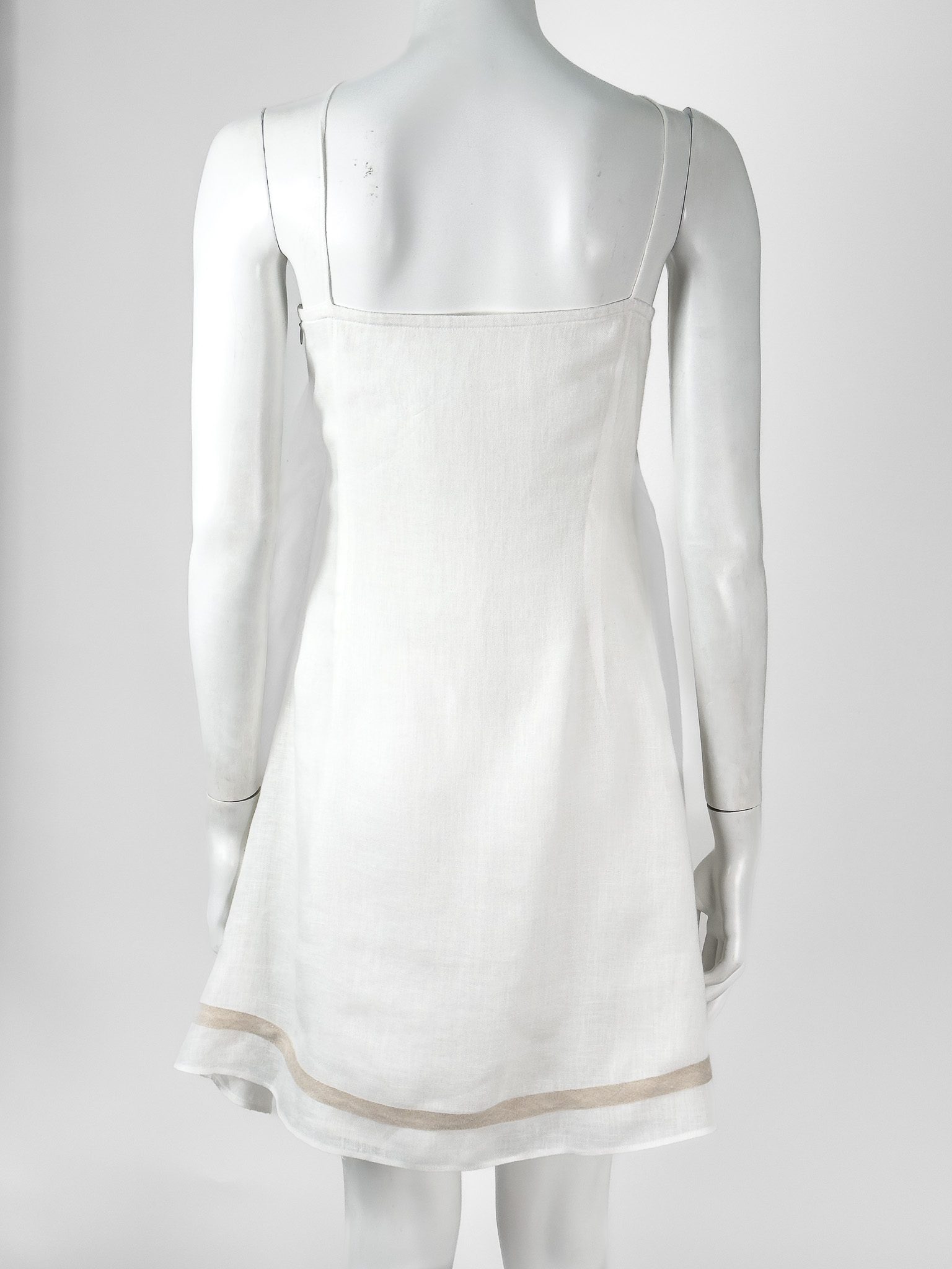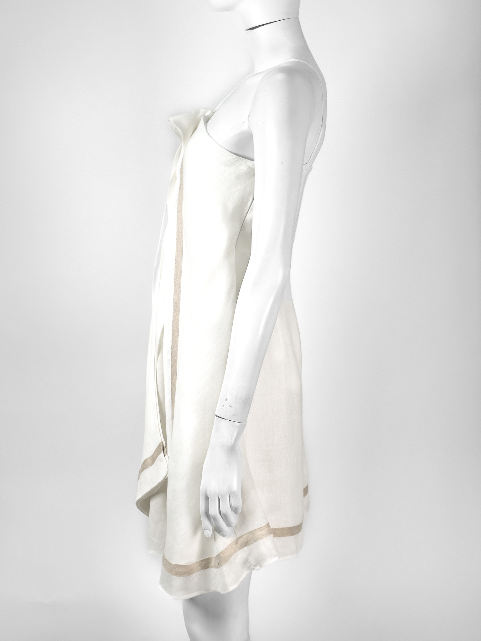"Kremowa sukienka na ramiączkach, wykończona beżową wstawką. Rozmiar z metki: XS. Skład: 100% len. Stan: bardzo dobry. Wymiary: szerokość mierzona od pachy do pachy 43cm, długość całkowita 91cm."