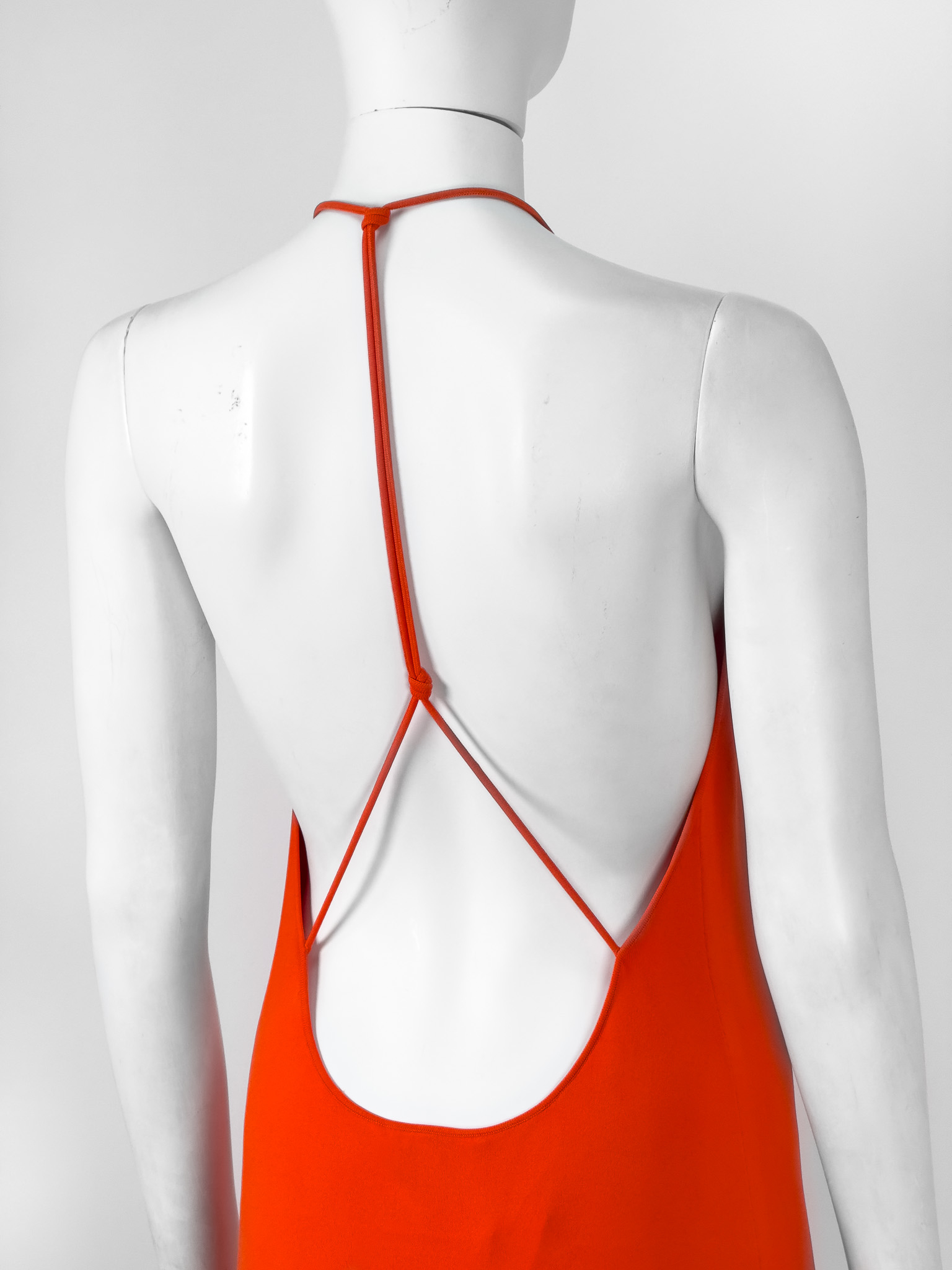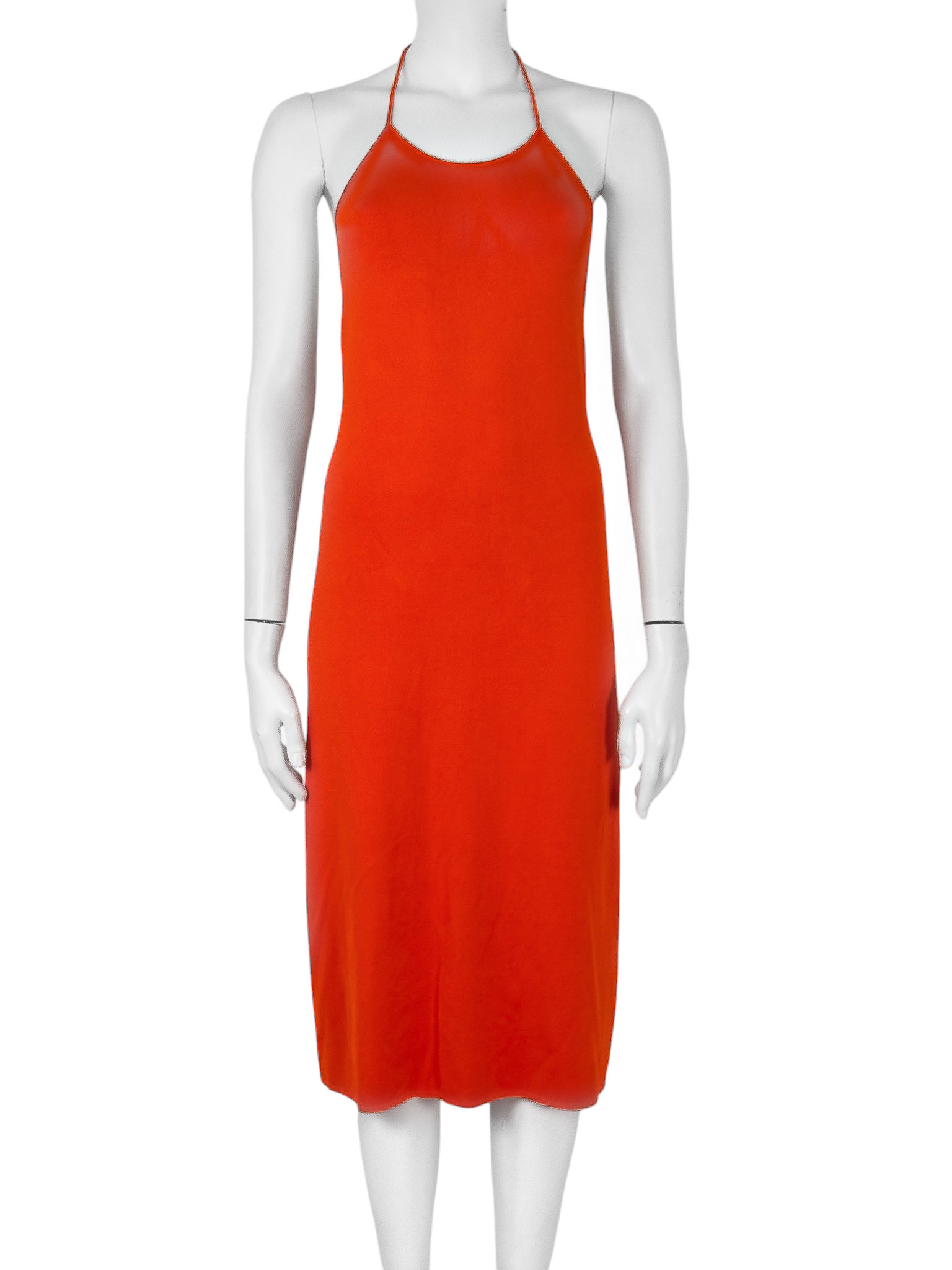 "kolekcja spring 2020; Pomarańczowa sukienka, w kształcie litery "A", cienkie ramiączka, dekolt halter, długość midi, odkryte plecy. Rozmiar z metki IT 40. Skład: 87% wiskoza, 10% poliamid, 3% poliuretan. Wymiary: szerokość mierzona od pachy do pachy 44cm, długość całkowita 113cm."
