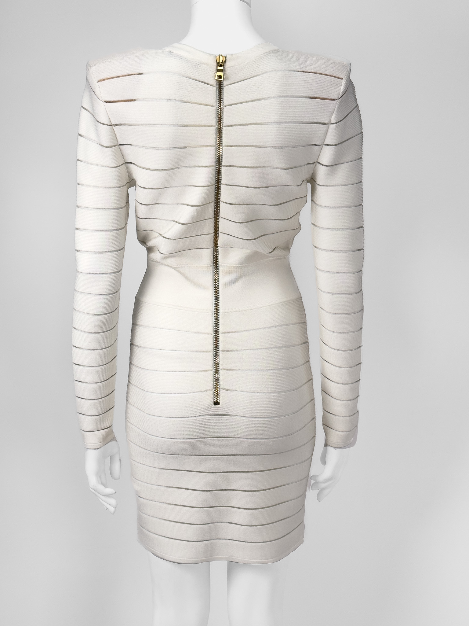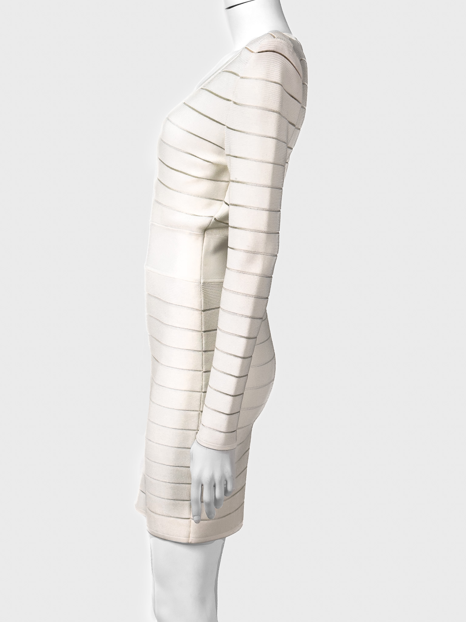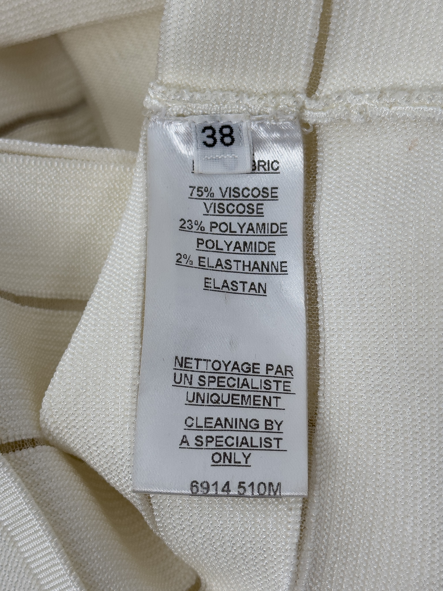 "Sukienka w kolorze ecru w transparentny prążek, dopasowana, długość przed kolano, dekolt w serek, poduszki w ramionach, długi rękaw, zasuwana w tylnej części na złoty suwak. Stan bardzo dobry. Rozmiar z metki IT 38. Skład: 75% wiskoza, 23% poliamid, 2% elastan. Wymiary: szerokość mierzona od pachy do pachy 44cm, długość całkowita 94cm."