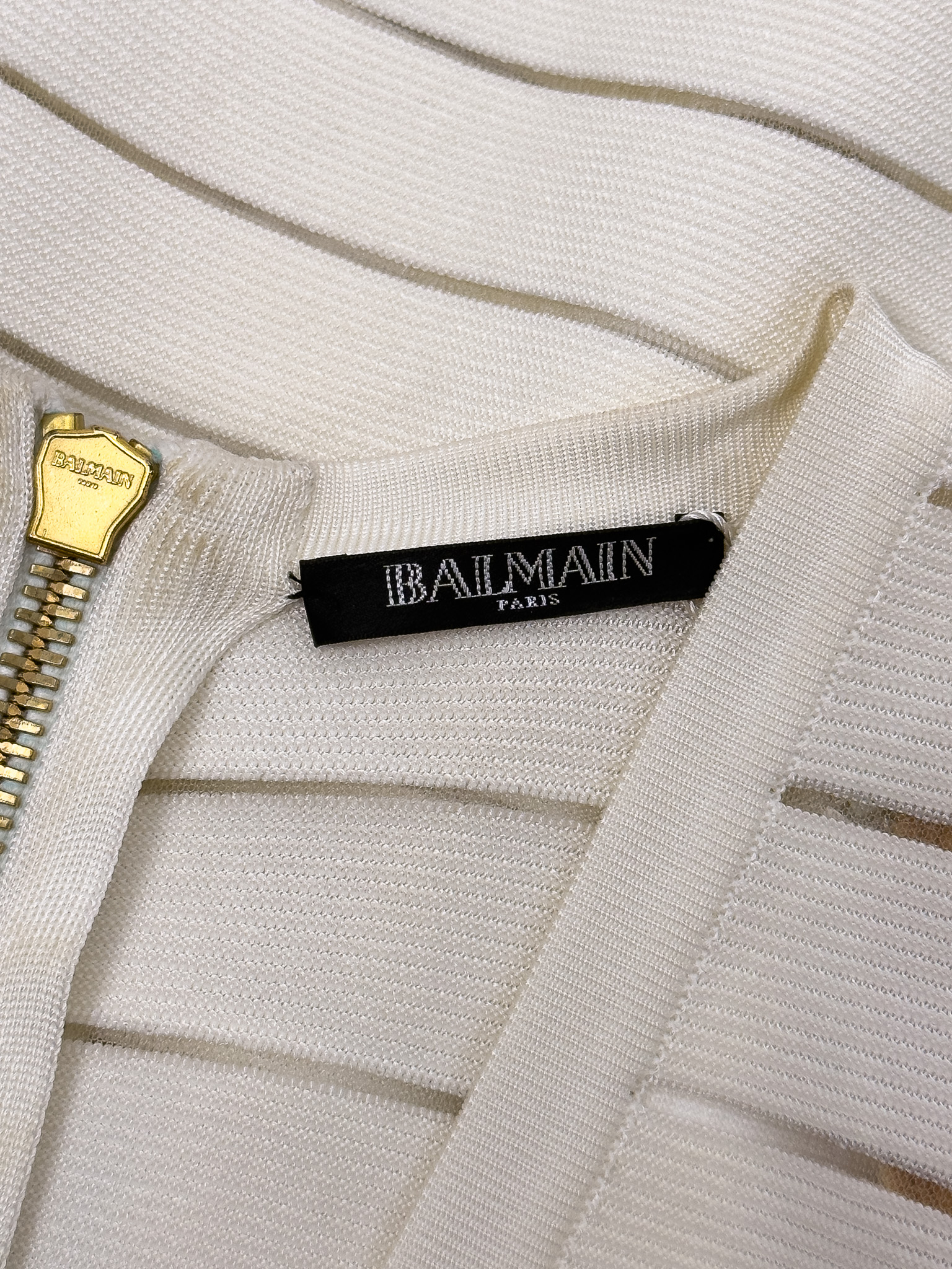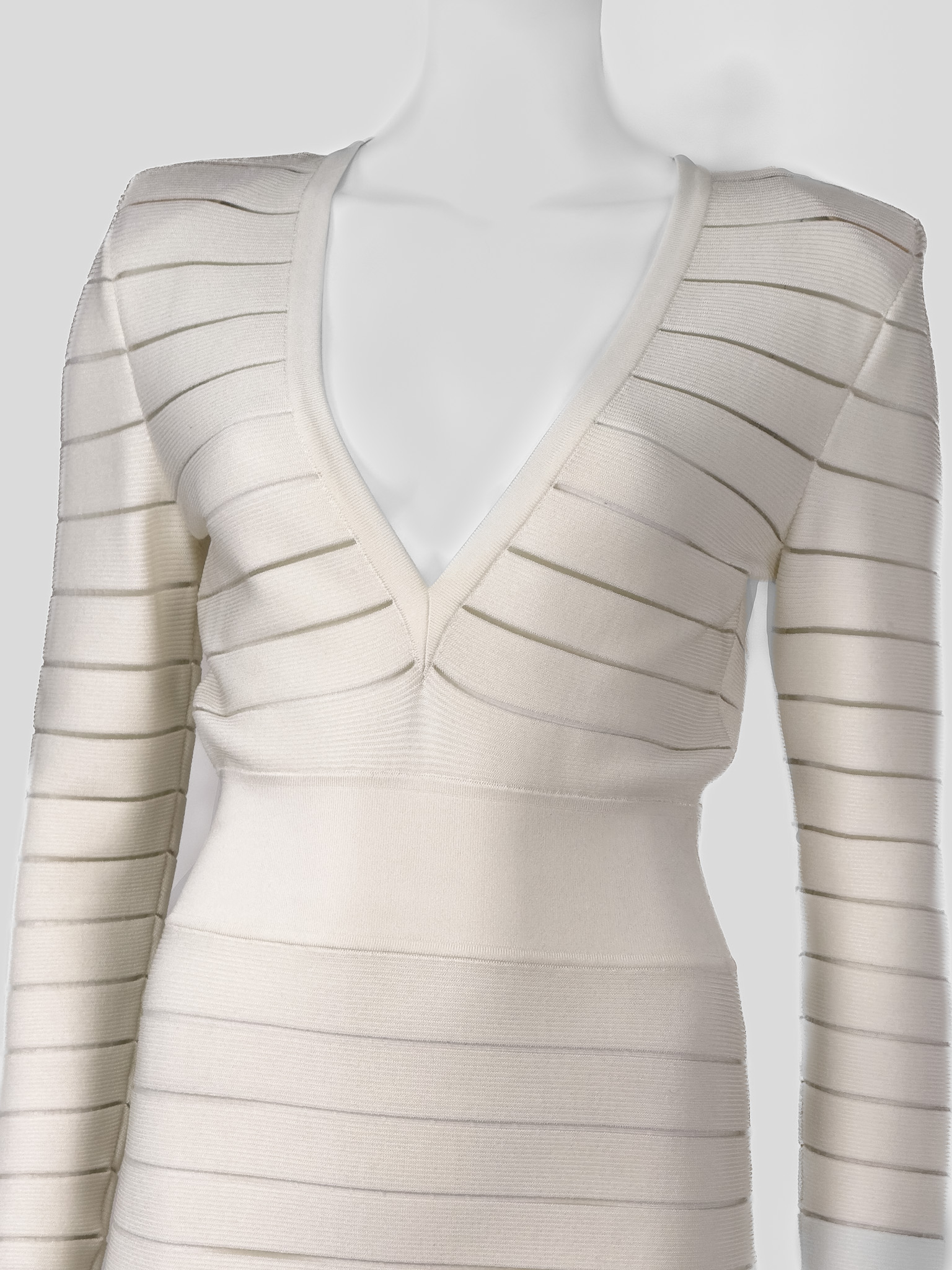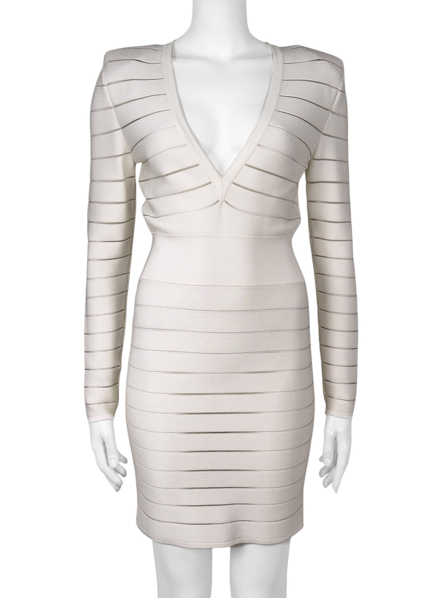 "Sukienka w kolorze ecru w transparentny prążek, dopasowana, długość przed kolano, dekolt w serek, poduszki w ramionach, długi rękaw, zasuwana w tylnej części na złoty suwak. Stan bardzo dobry. Rozmiar z metki IT 38. Skład: 75% wiskoza, 23% poliamid, 2% elastan. Wymiary: szerokość mierzona od pachy do pachy 44cm, długość całkowita 94cm."