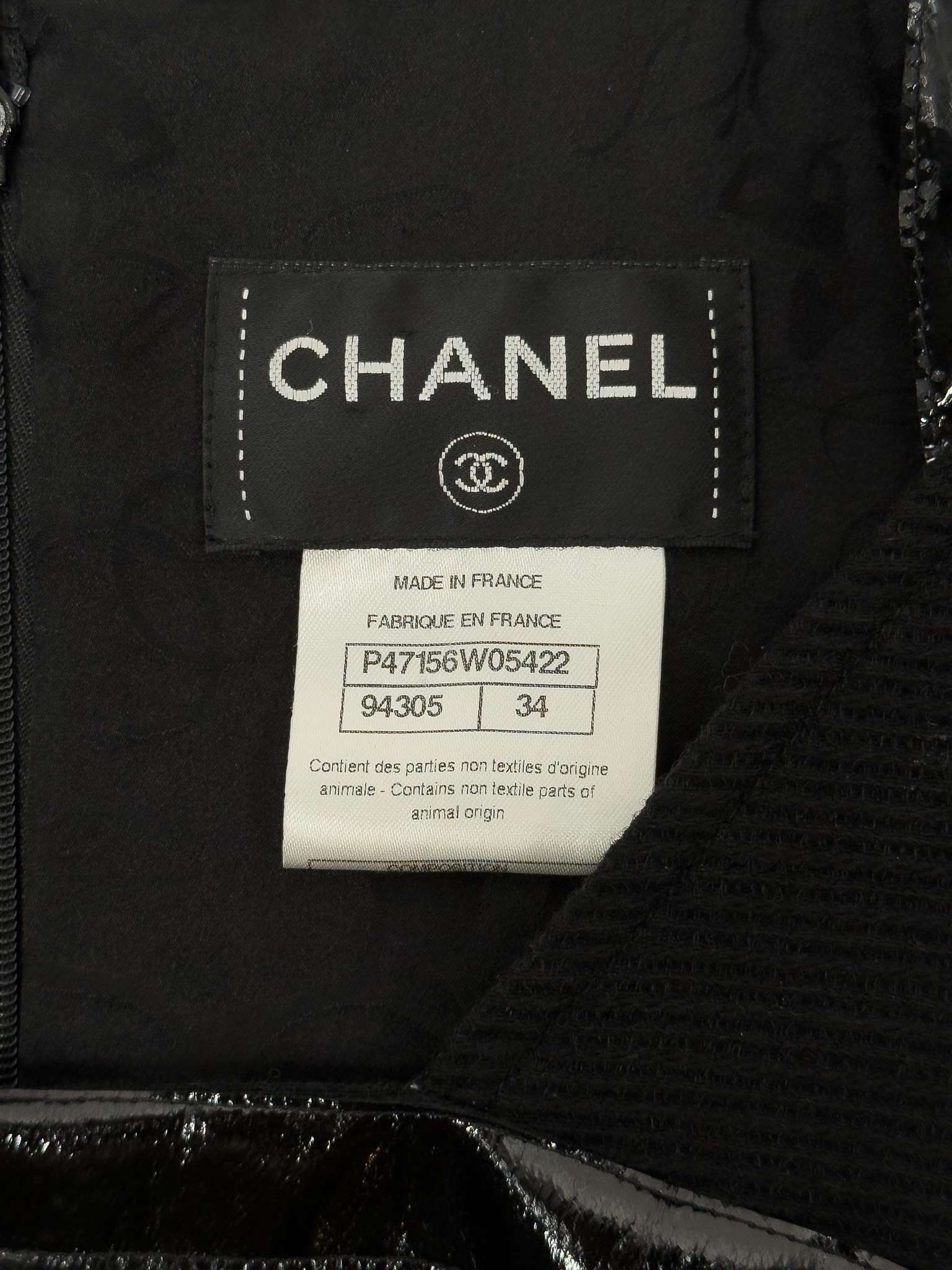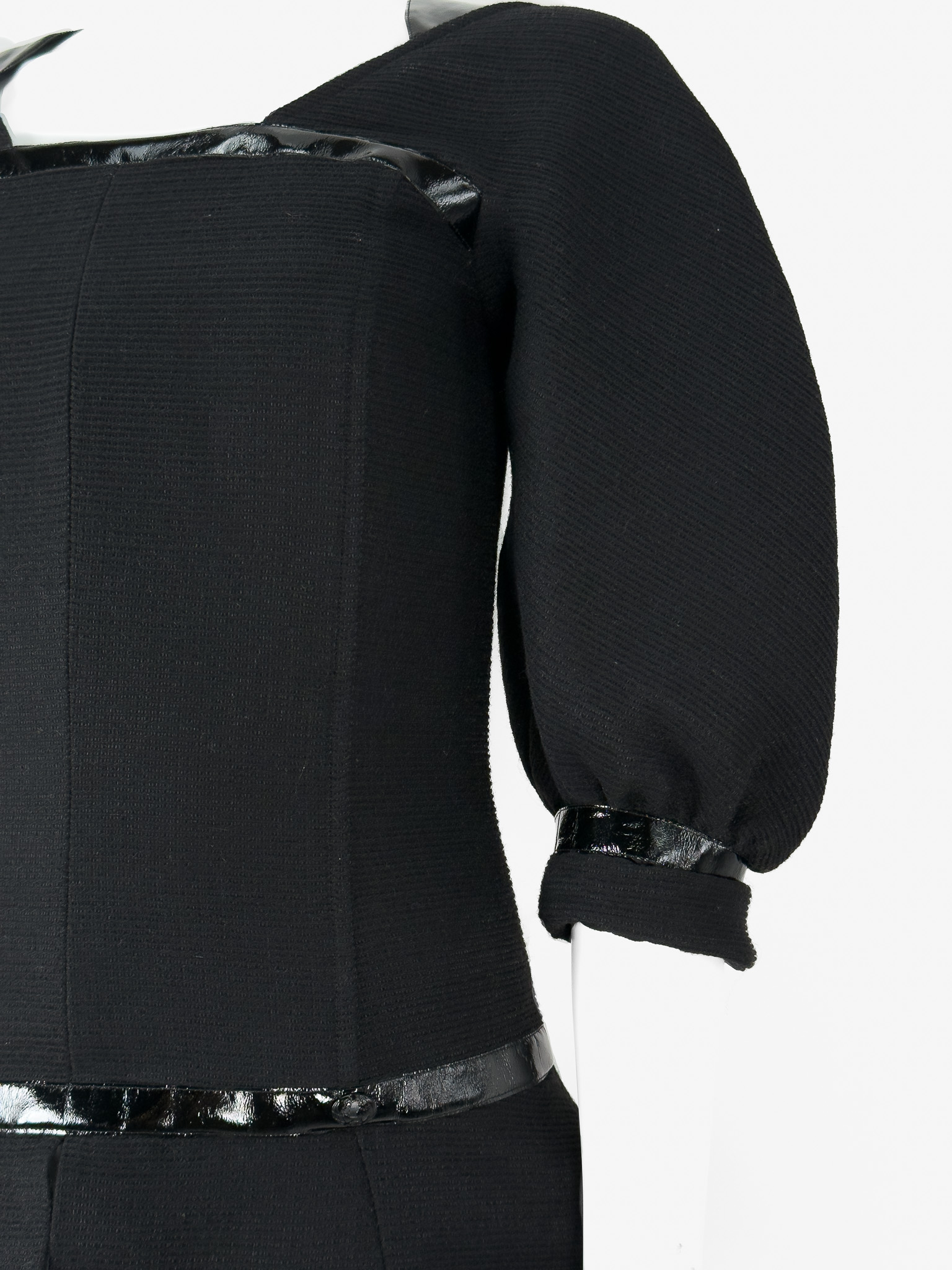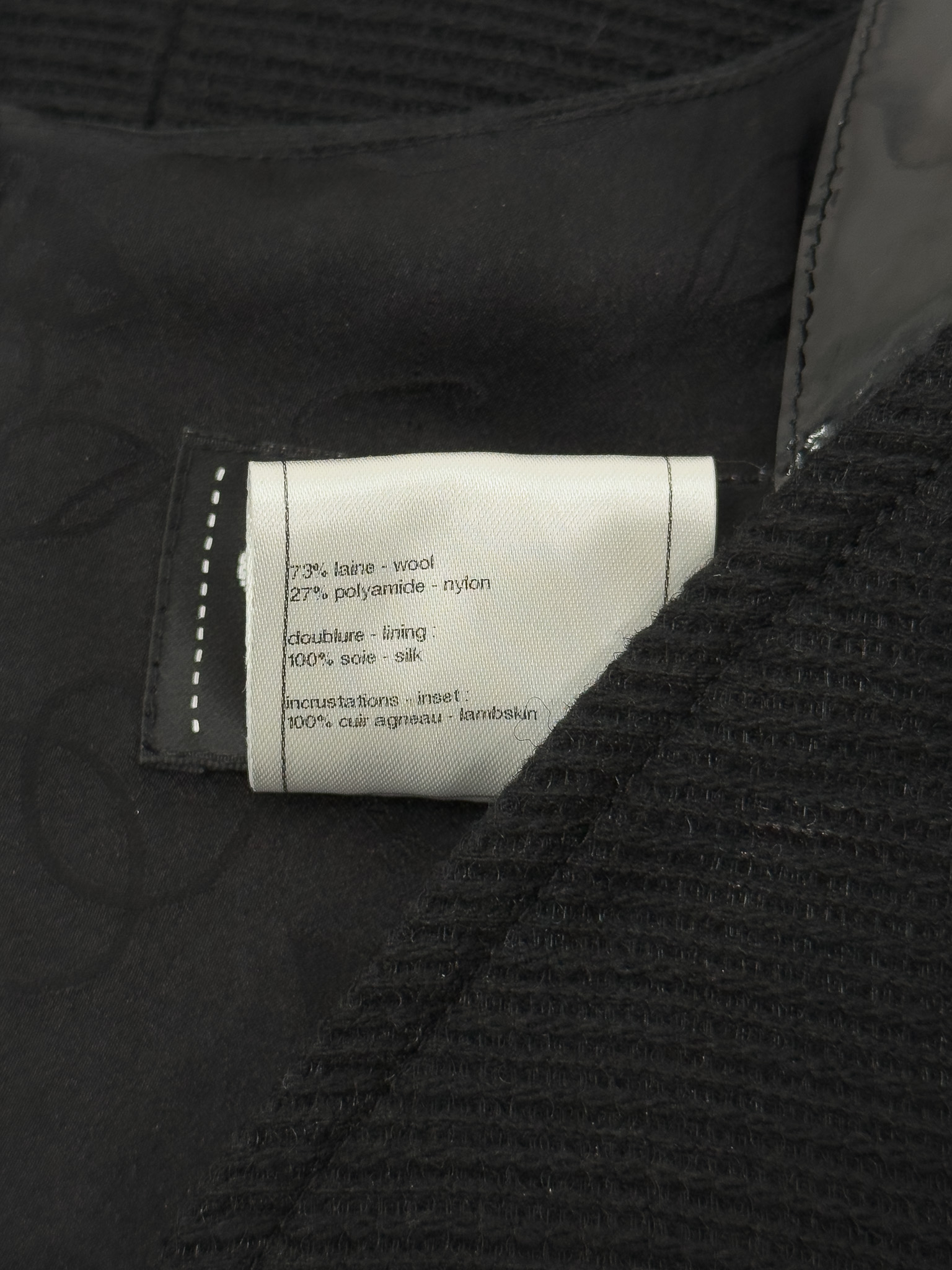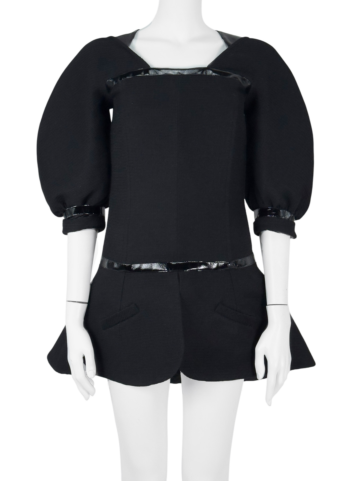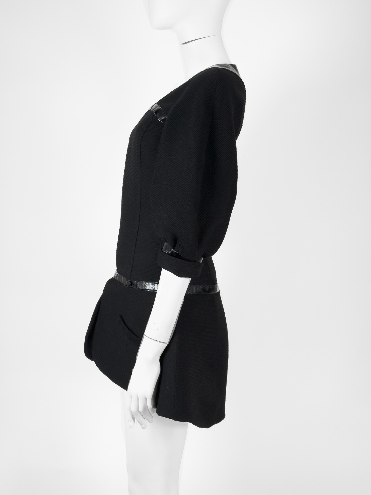 "Czarna tunika, piankowa forma, tył dłuższy od przodu, wykończona lakierowanymi wstawkami, dwie kieszonki na przodzie, bufiaste rękawki. Rozmiar z metki FR 34. Skład: 73% wełna, 27% poliamid, podszewka: 100% jedwab. Stan bardzo dobry. Kolekcja z 2013 roku. Wymiary: szerokość mierzona od pachy do pachy 42cm, długość całkowita 75cm."