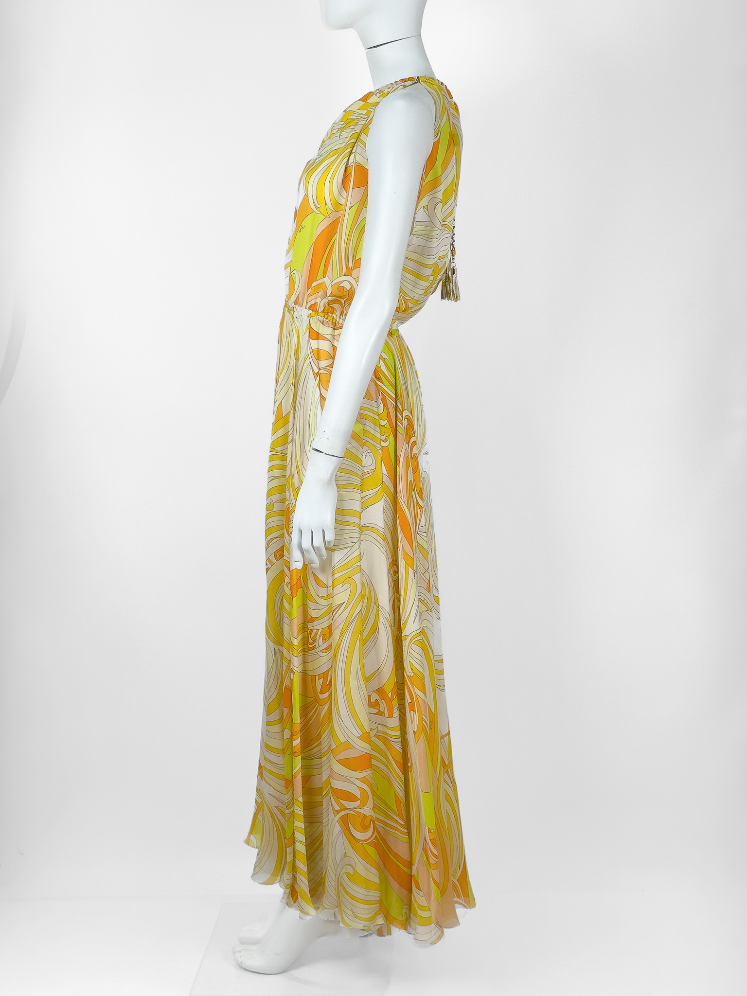 "Żółto-pomarańczowo-liliowa jedwabna sukienka bez rękawów, ozdobiona wzorem z delikatnym logo marki, zaokrąglony dekolt, długość maxi, srebrny łańcuch przy dekolcie, taliowana, guma w talii. Stan bardzo dobry. Rozmiar z metki FR 42. Skład: 100% jedwab. Wymiary: szerokość mierzona od pachy do pachy 53cm., długość całkowita 142cm."