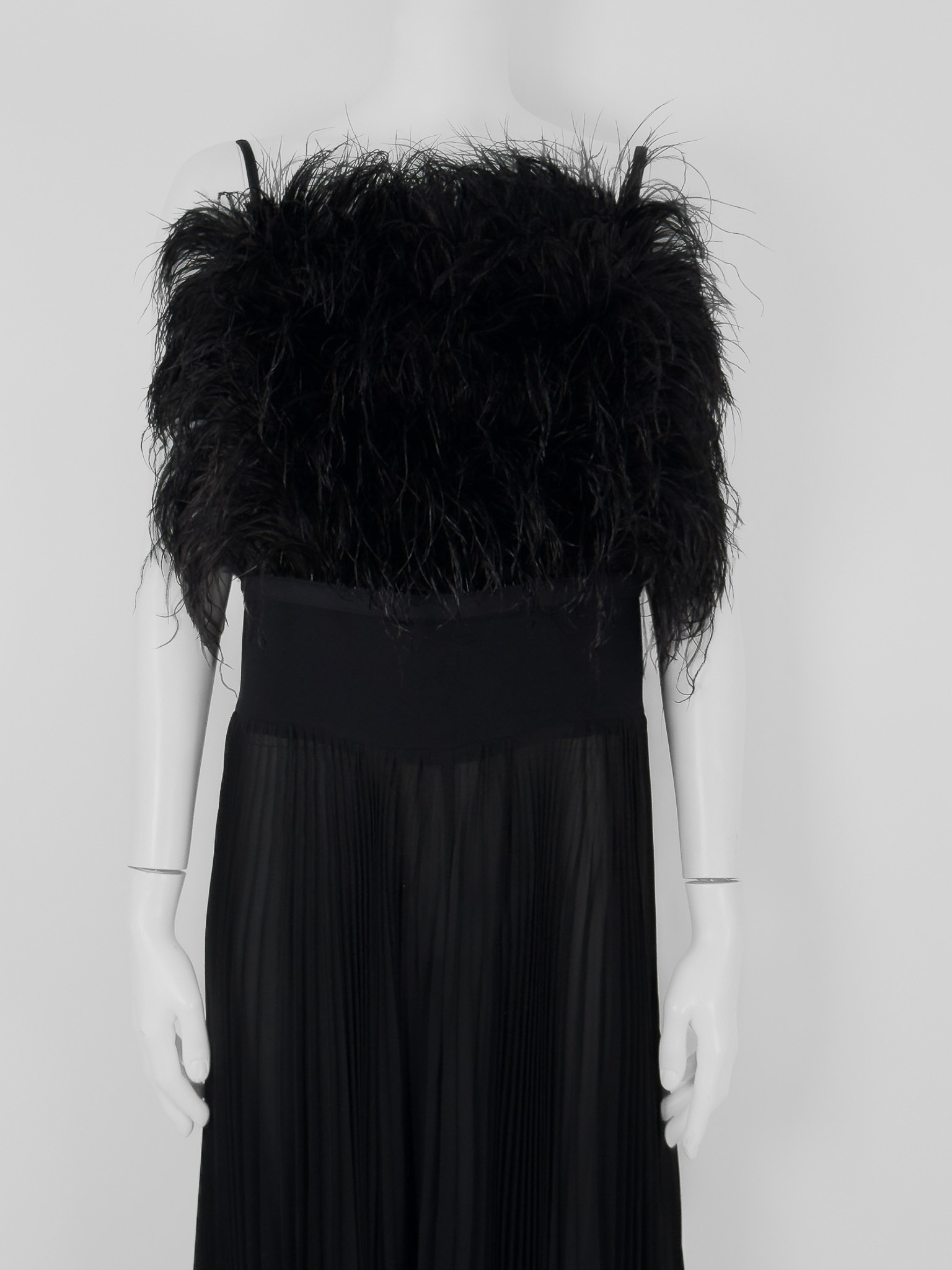 "Czarna sukienka na ramiączkach, w biuście obszyta piórami, dół plisowany, rozkloszowany, podkreślona talia, z tyłu zapinana na suwak, długość maxi, półtransparentna w dolnej części. Brak metki z rozmiarem i składem. Wymiary: szerokość mierzona od pachy do pachy 42cm, długość całkowita 146cm. Rozmiarowo wypada jak S/M."