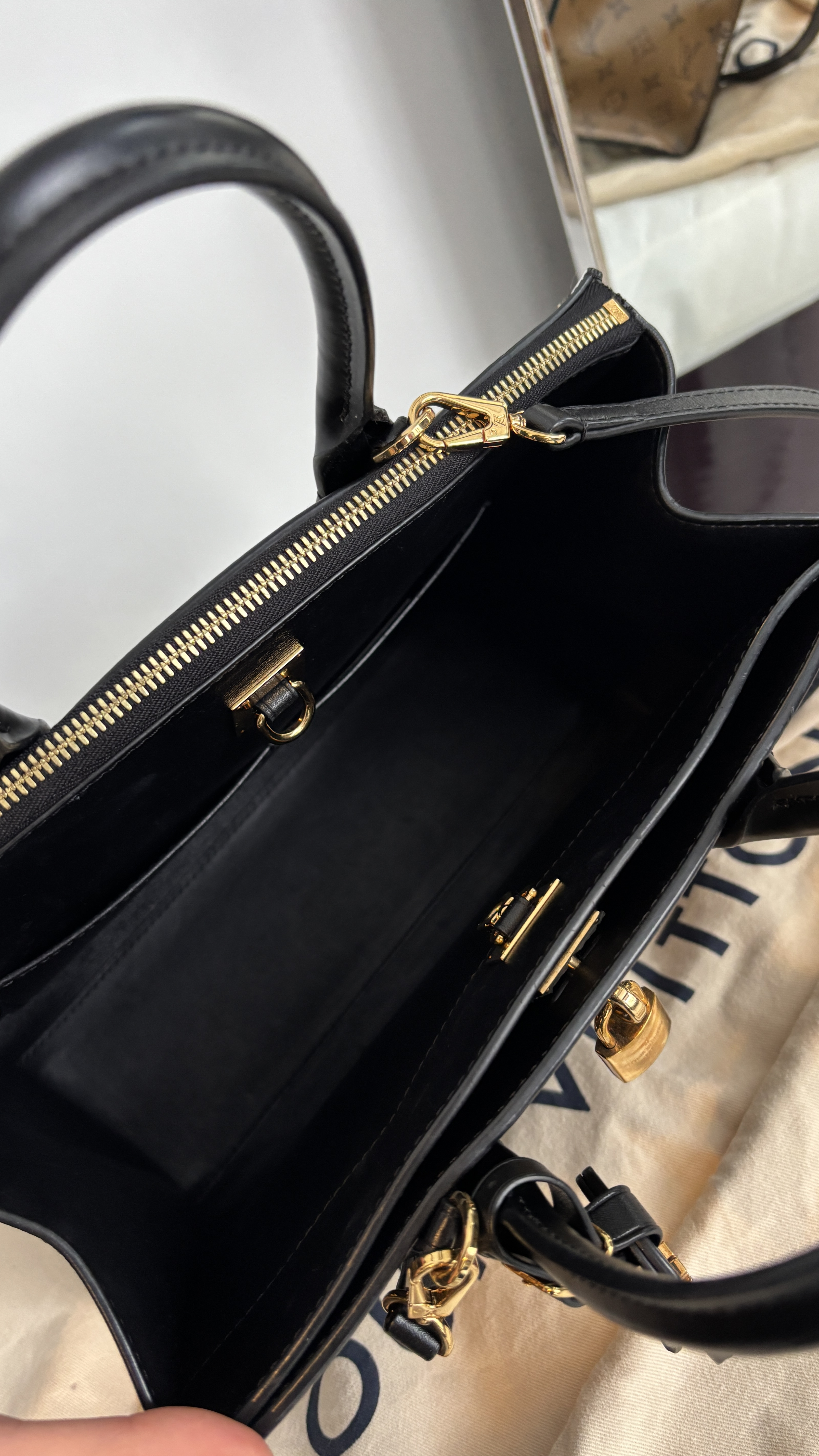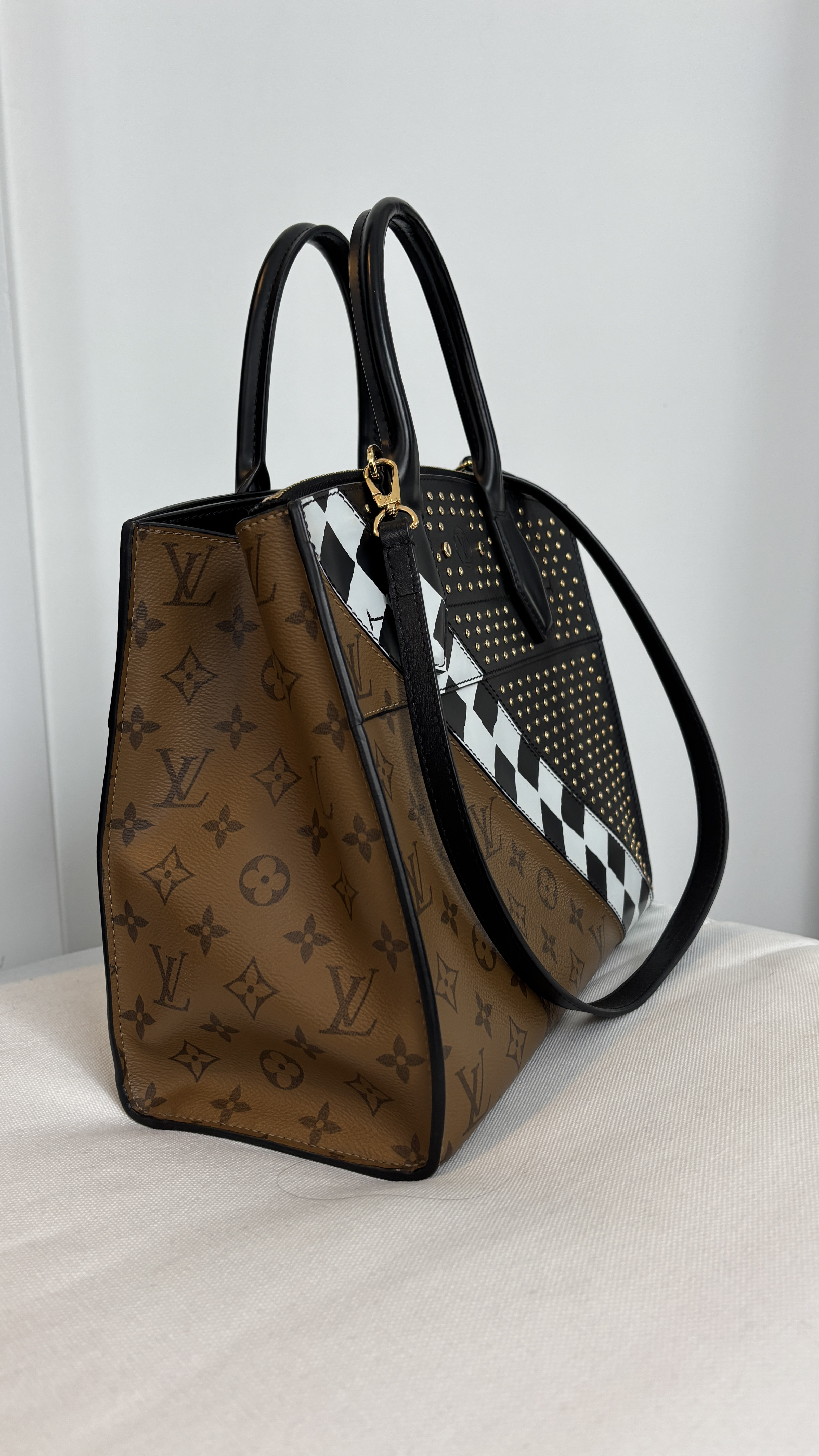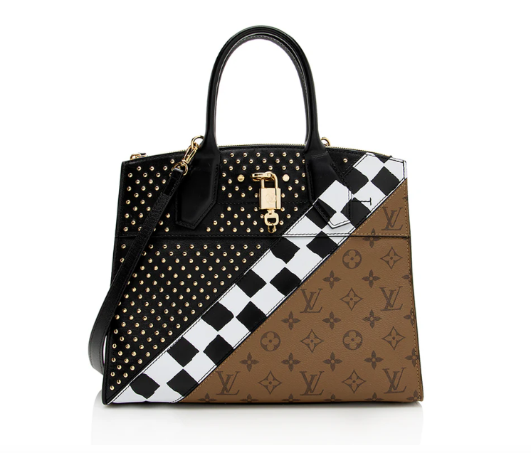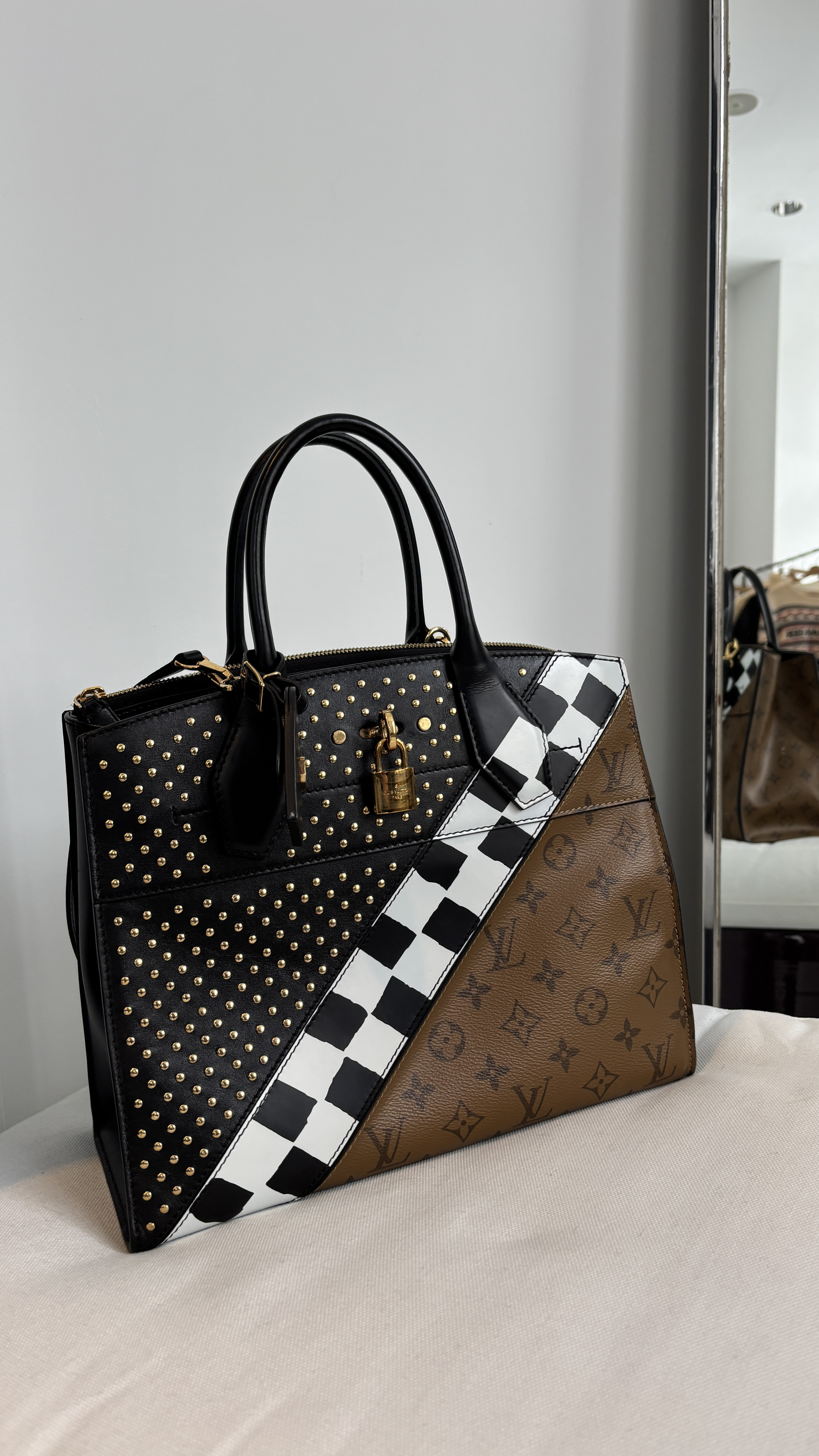 "Model Monogram City Steamer MM, torebka typu tote, do ręki, połaczenie brązowego monogramu, czarno-białej szachownicy oraz czarnej skóry nabijanej złotymi ćwiekami, złote okucia. Jedna duża skórzana komora (stan bardzo dobry) oraz druga zapinana na suwak. W zestawie czarny dopinany pasek na ramię (nie crossbody) i worek przeciwkurzowy. Brak przetarć na rogach, skórzana podstawa z drobnymi rysami. Wymiary: wysokość 25,5 c, szerokość 30,5 cm, głębokość 13,3 cm"