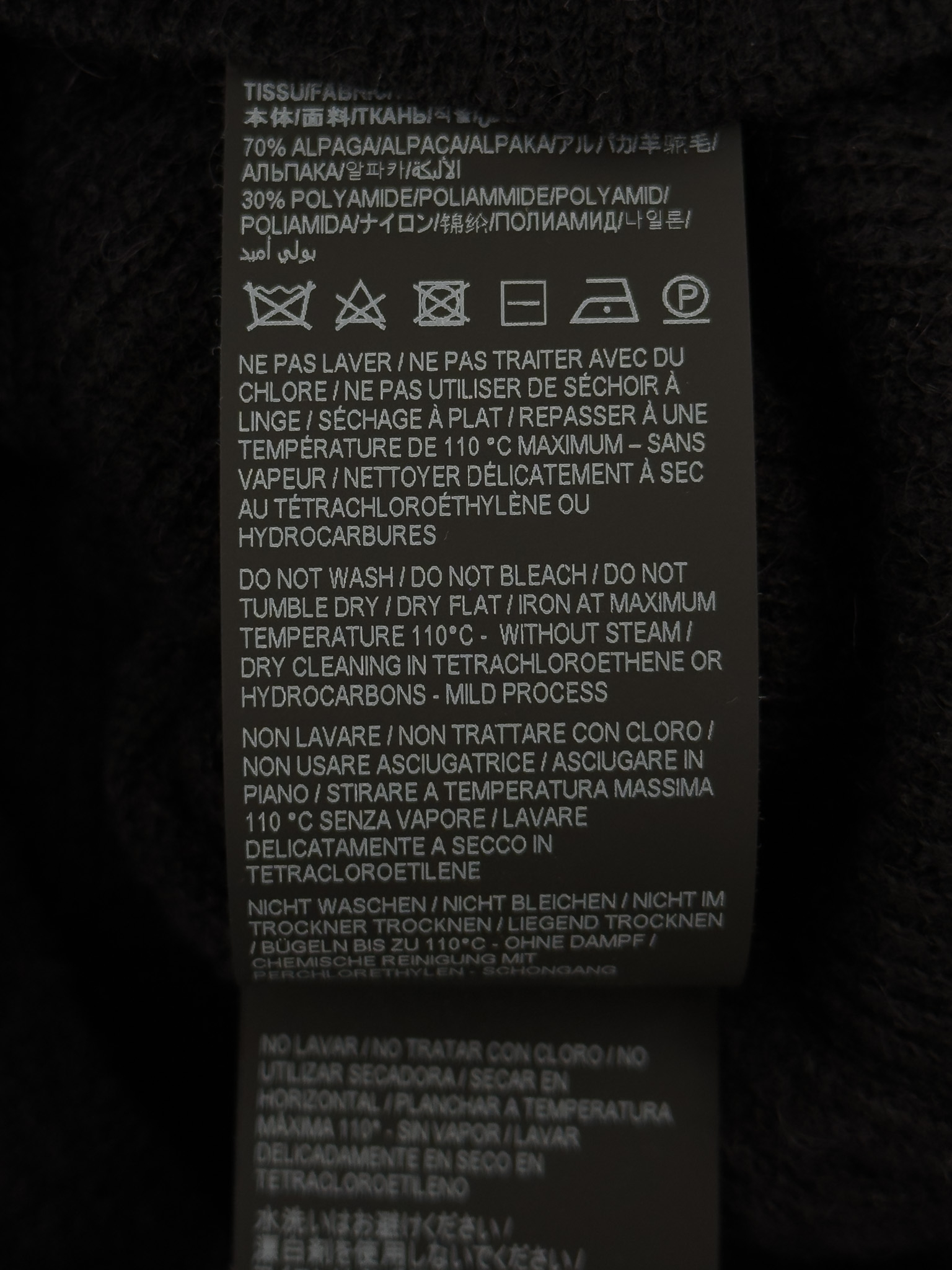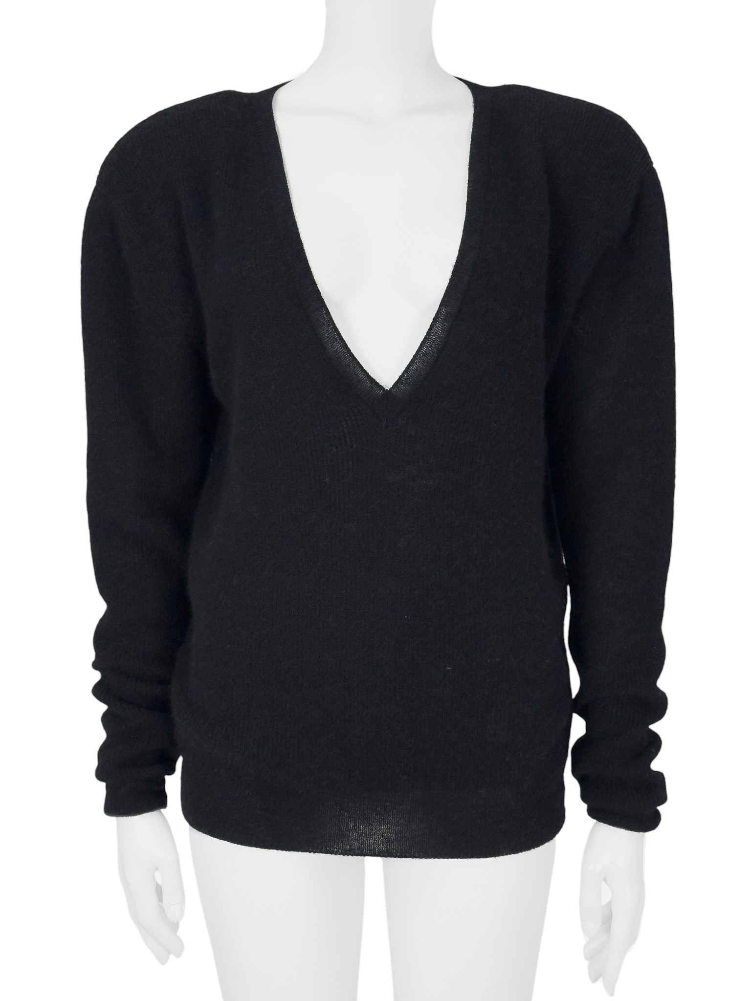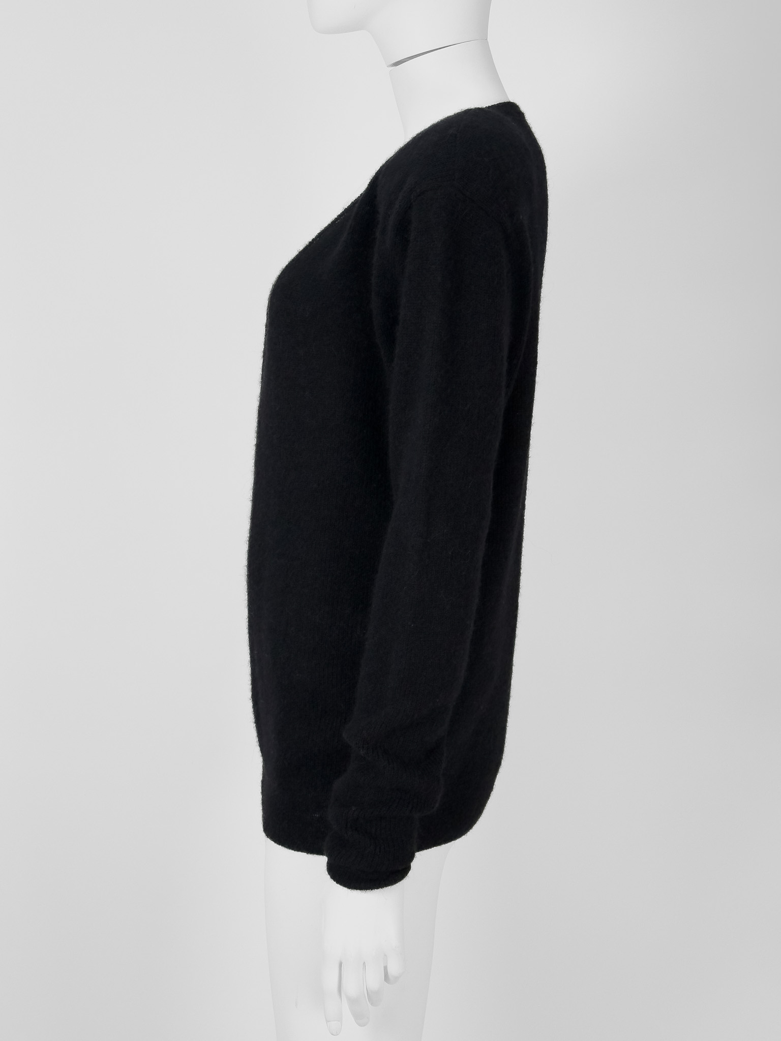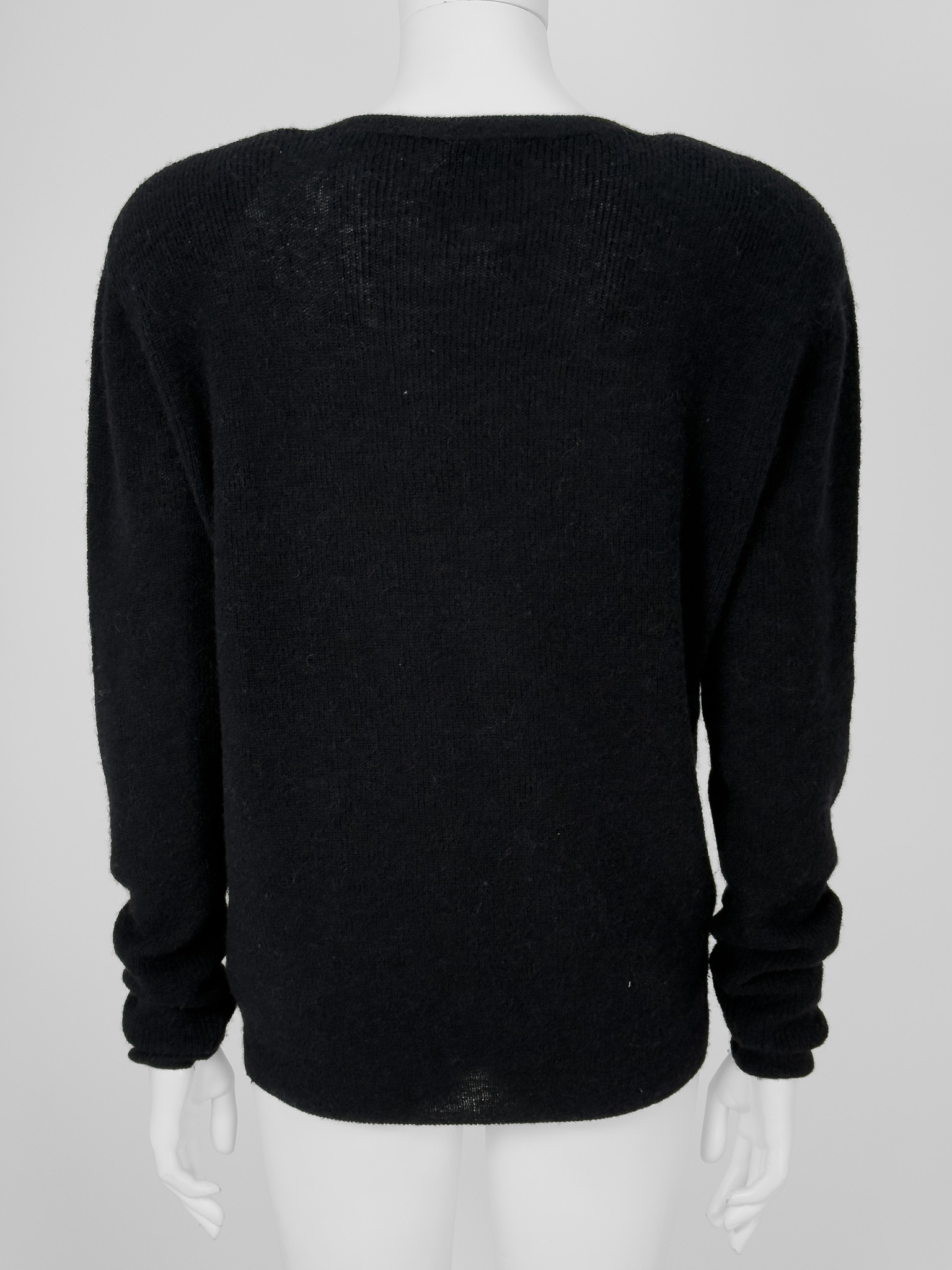 "Czarny cienki sweter, poduszki na ramionach, głęboki dekolt w serek, krój oversize. Rozmiar z metki XS. Skład: 70% alpaka, 30% poliamid. Wymiary: szerokość mierzona od pachy do pachy 59cm, długość całkowita 64cm."