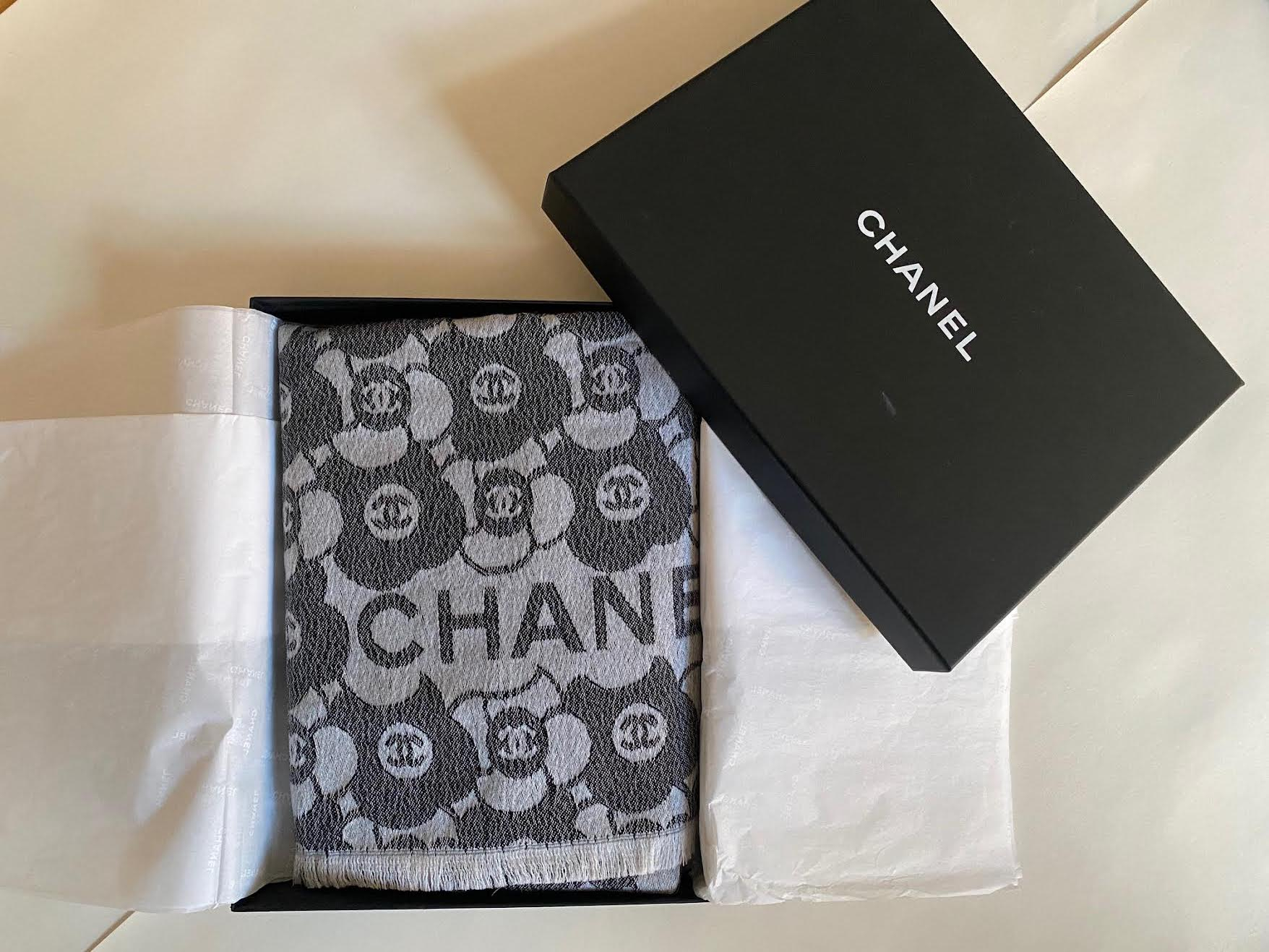 "Kaszmirowo-wełniany szal w odcieniach czerni, bieli oraz szarego, w zestawie z pudełkiem. Stan nowy. Wymiary: 180 cm x 65 cm. Skład: 53% kaszmir , 47% wełna."