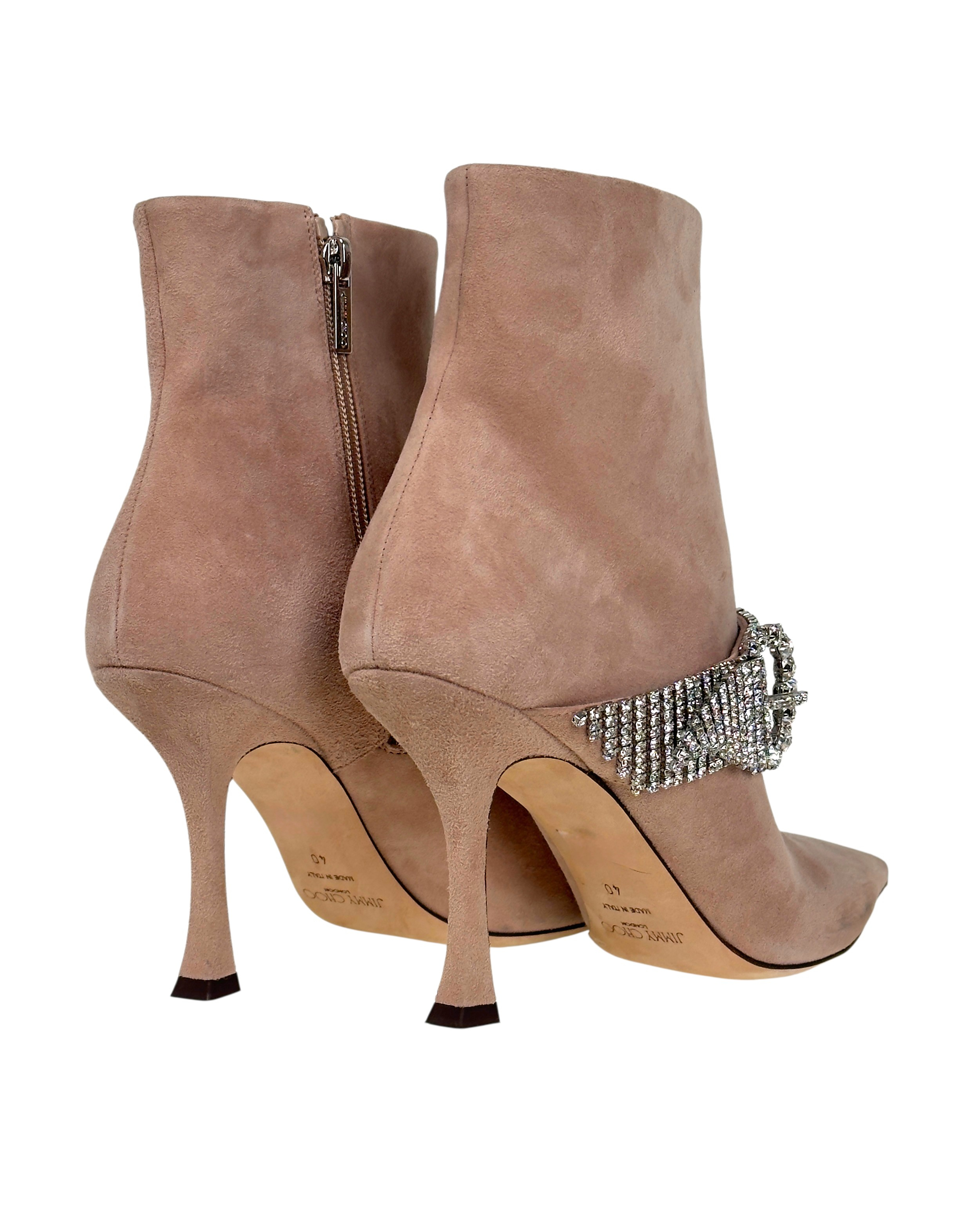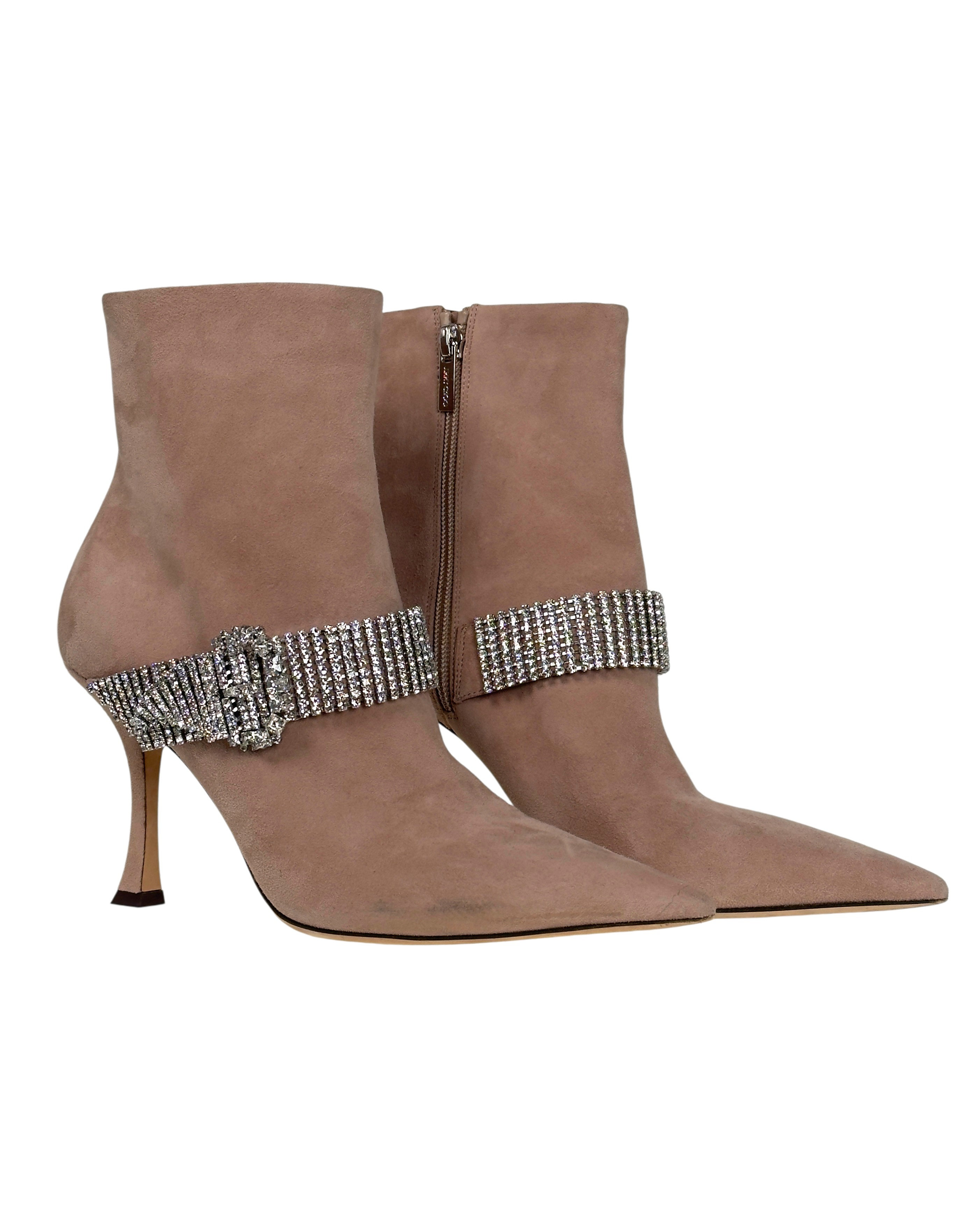 "Zamszowe szpilki w kolorze pudrowego różu, na szpilce, ozdobne klamry z kryształkami dookoła kostek. rozmiar 40. Stan bardzo dobry."