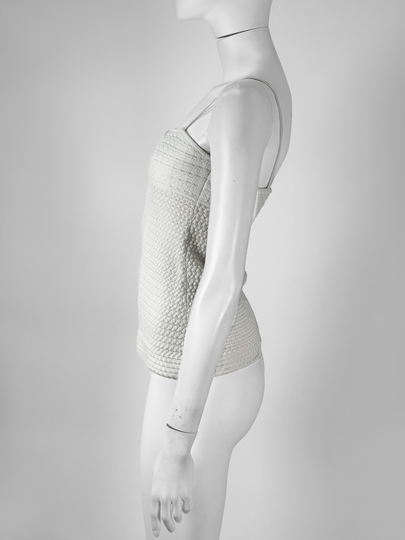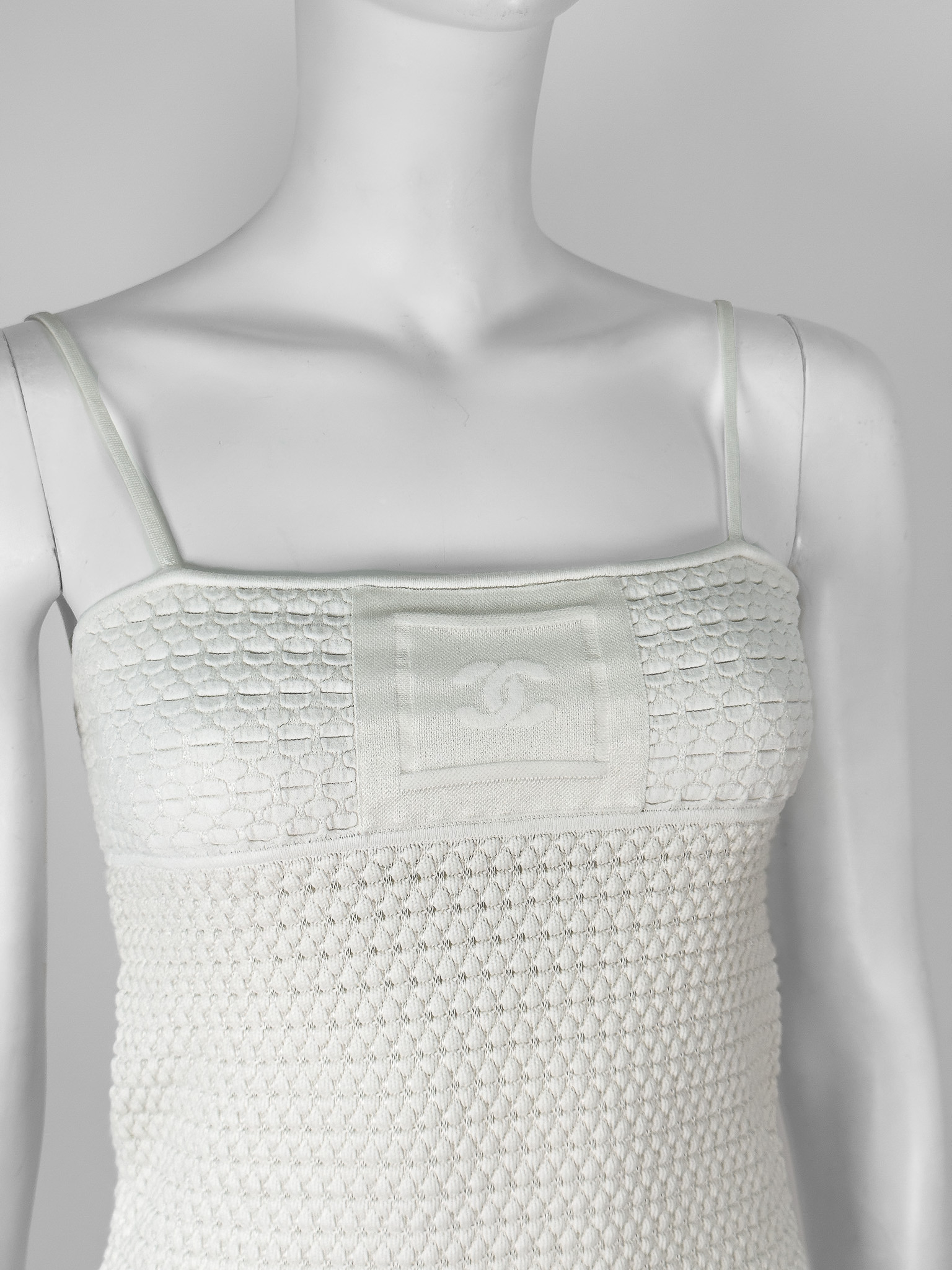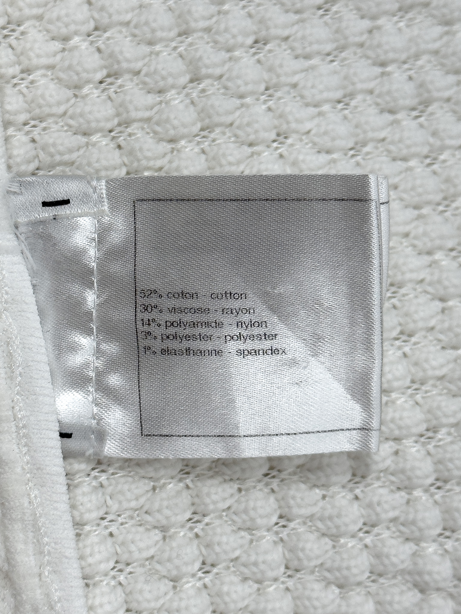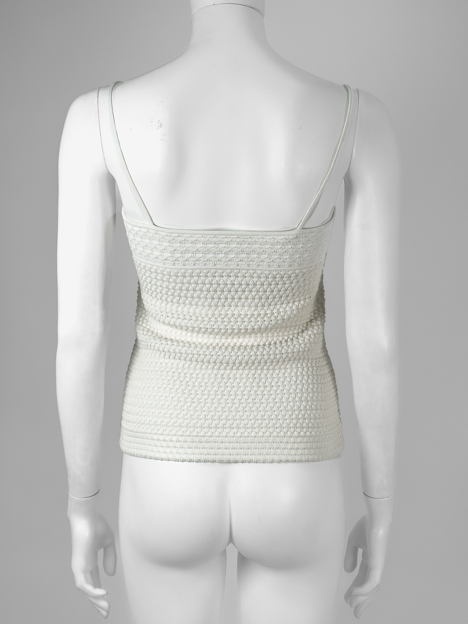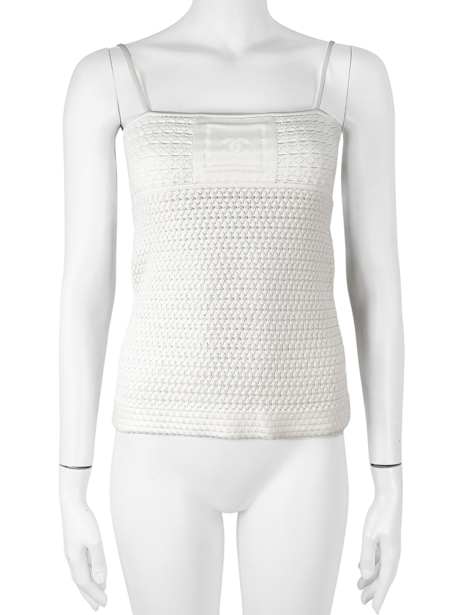 "Biało-kremowy top na cienkich ramiączkach, materiał w strukturę, wytłaczane logowanie marki na samej górze. Rozmiar z metki 34. Skład: 52% bawełna, 30% wiskoza, 14% poliamid, 3% poliester, 1% elastan. Wymiary: szerokość mierzona od pachy do pachy 37cm, długość całkowita 42cm."