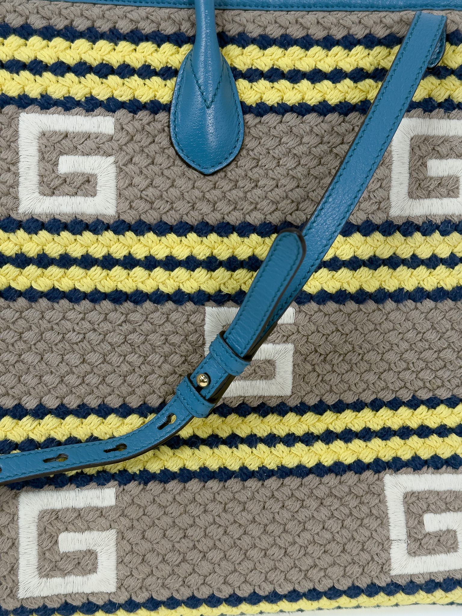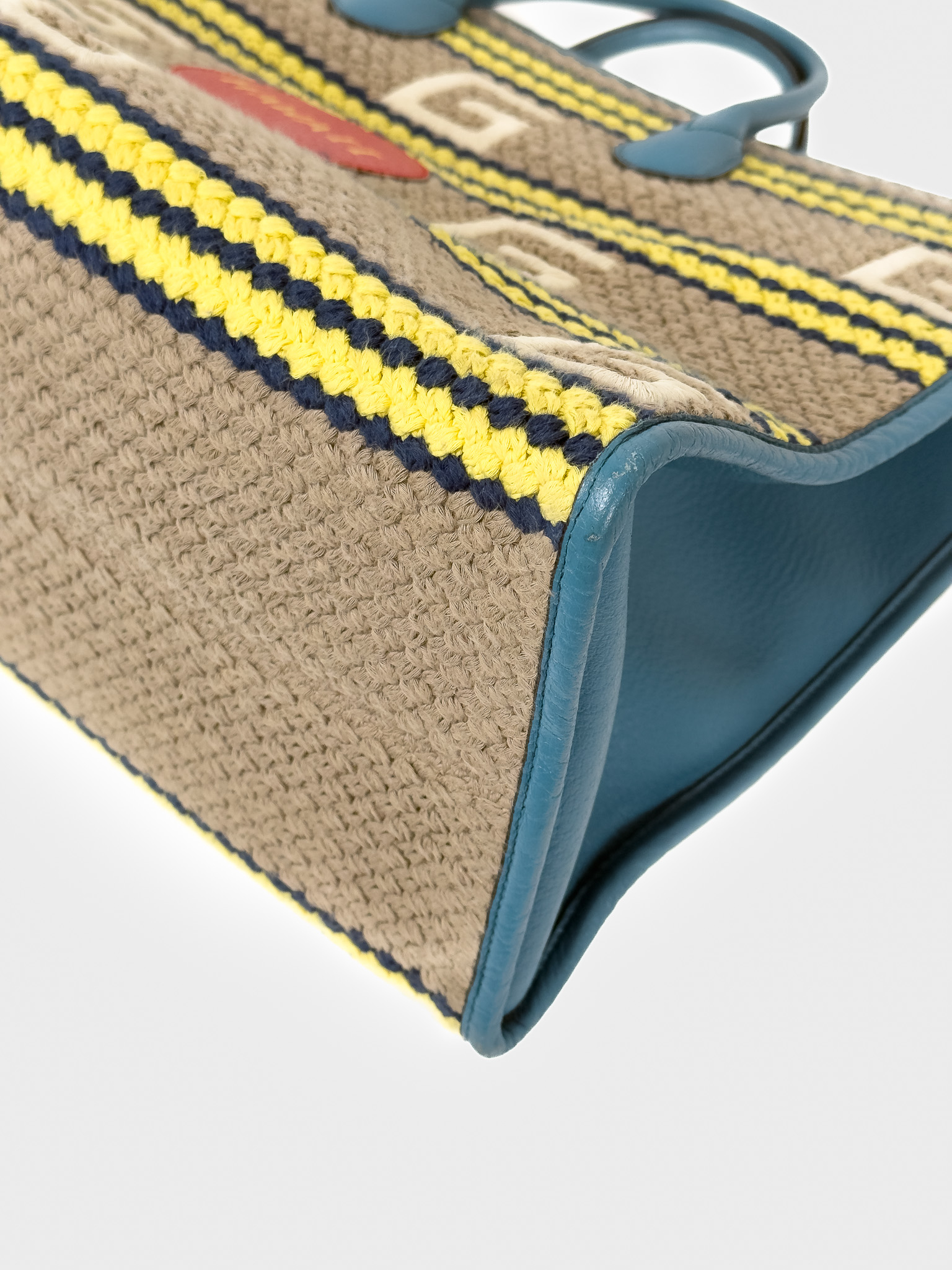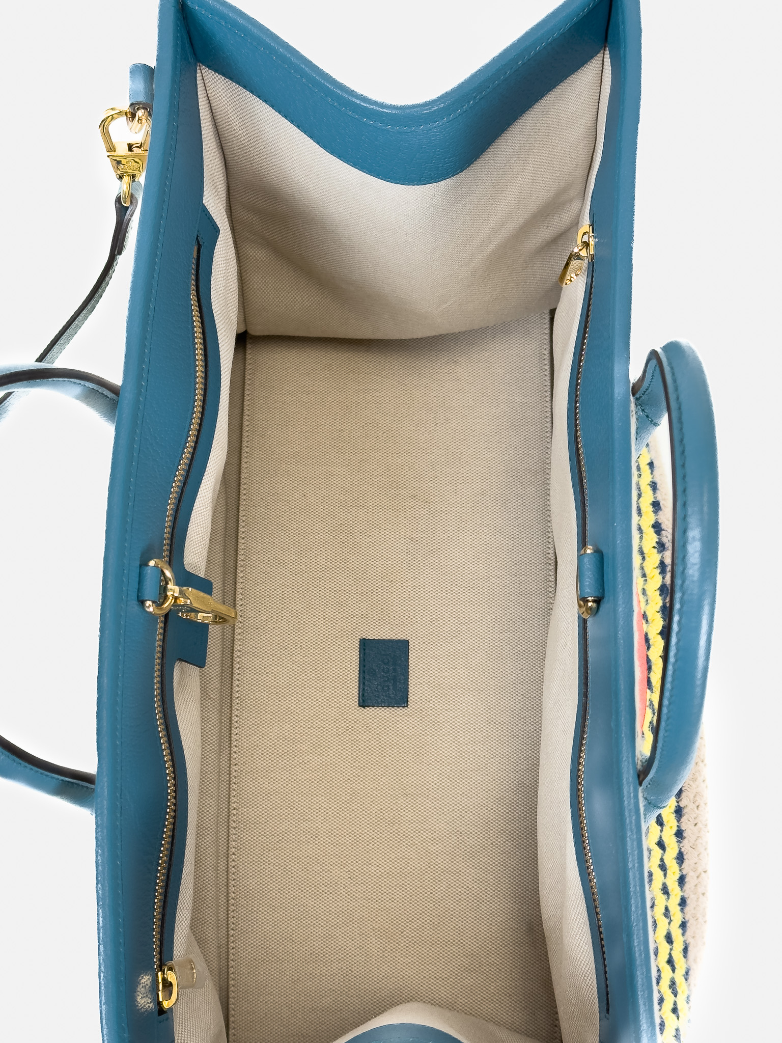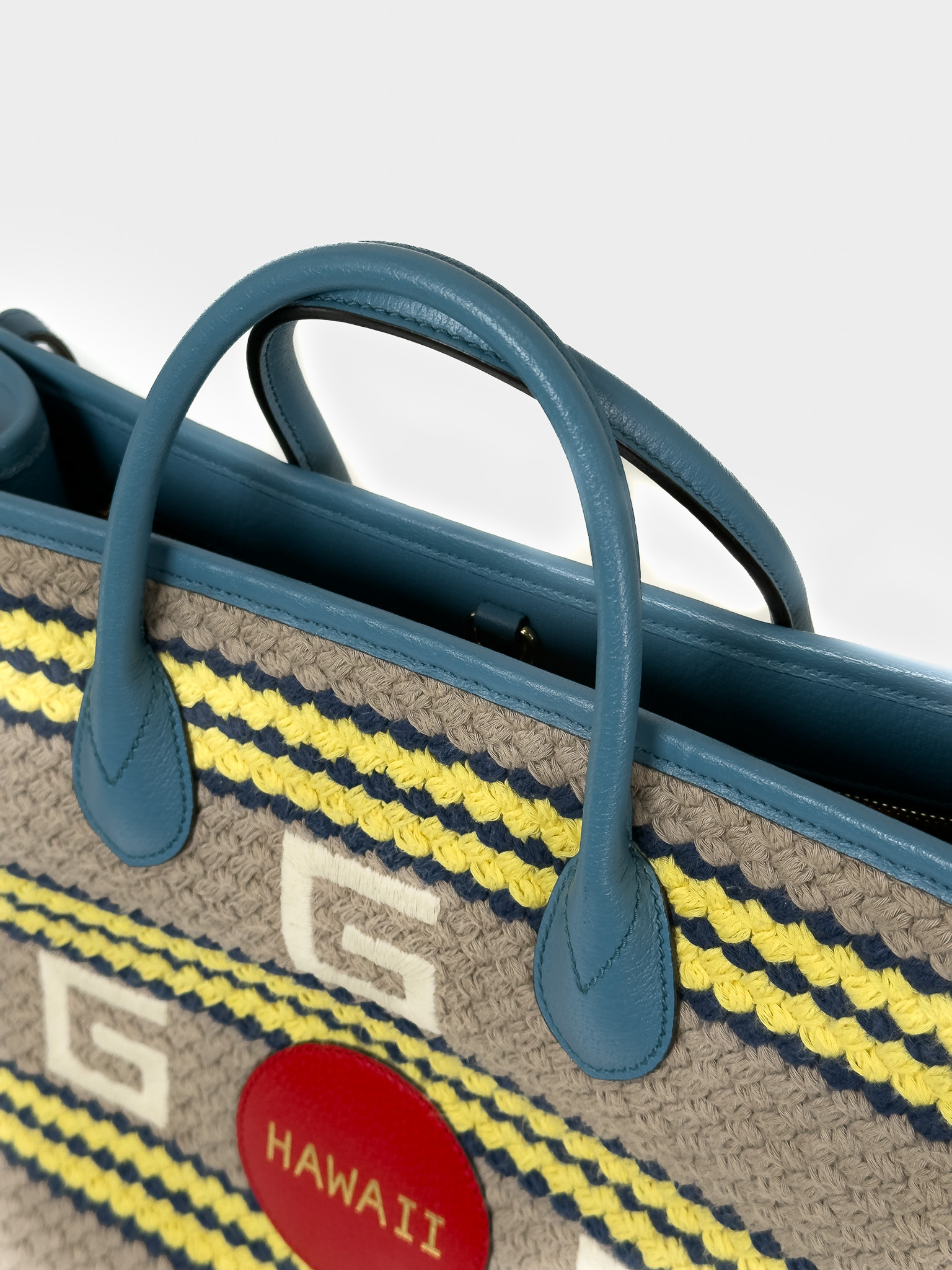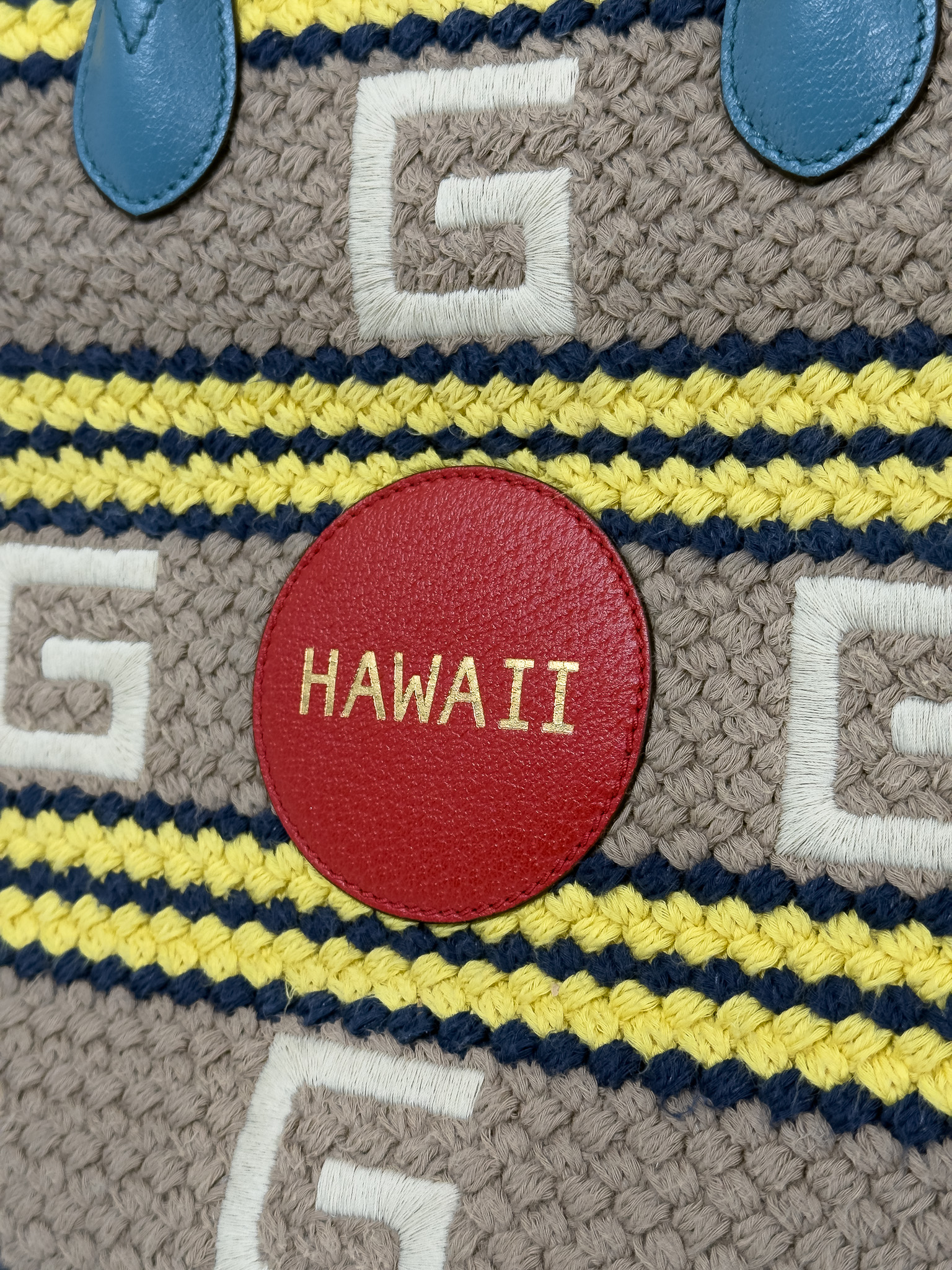 "Duża pleciona torba plażowa do ręki/ na ramię, w odcieniach beżu, żółci oraz granatu, wykończona skórą w kolorze niebieskim, ozdobiona kremowymi inicjałami marki oraz skórzaną czerwoną okrągłą naszywką w centralnej części z napisem "HAWAII", jedna duża komora z dwoma kieszeniami wewnątrz, prostokątny kształt, w zestawie z dowodem zakupu z komisu Dream Big. Stan bardzo dobry, posiada przetarcia na rogach. Wymiary: szerokość 43,5cm, wysokość 31cm, głębokość 20cm."