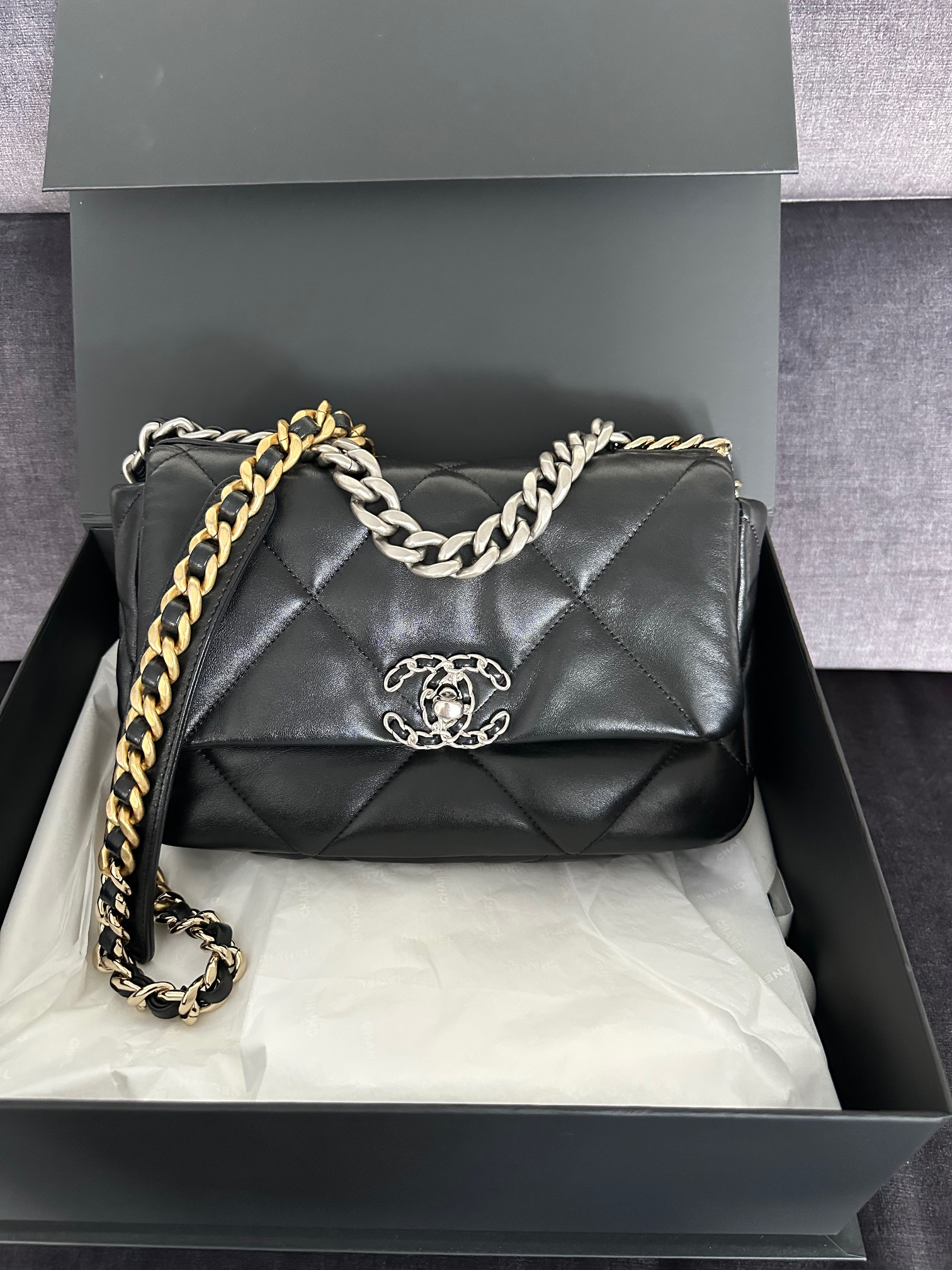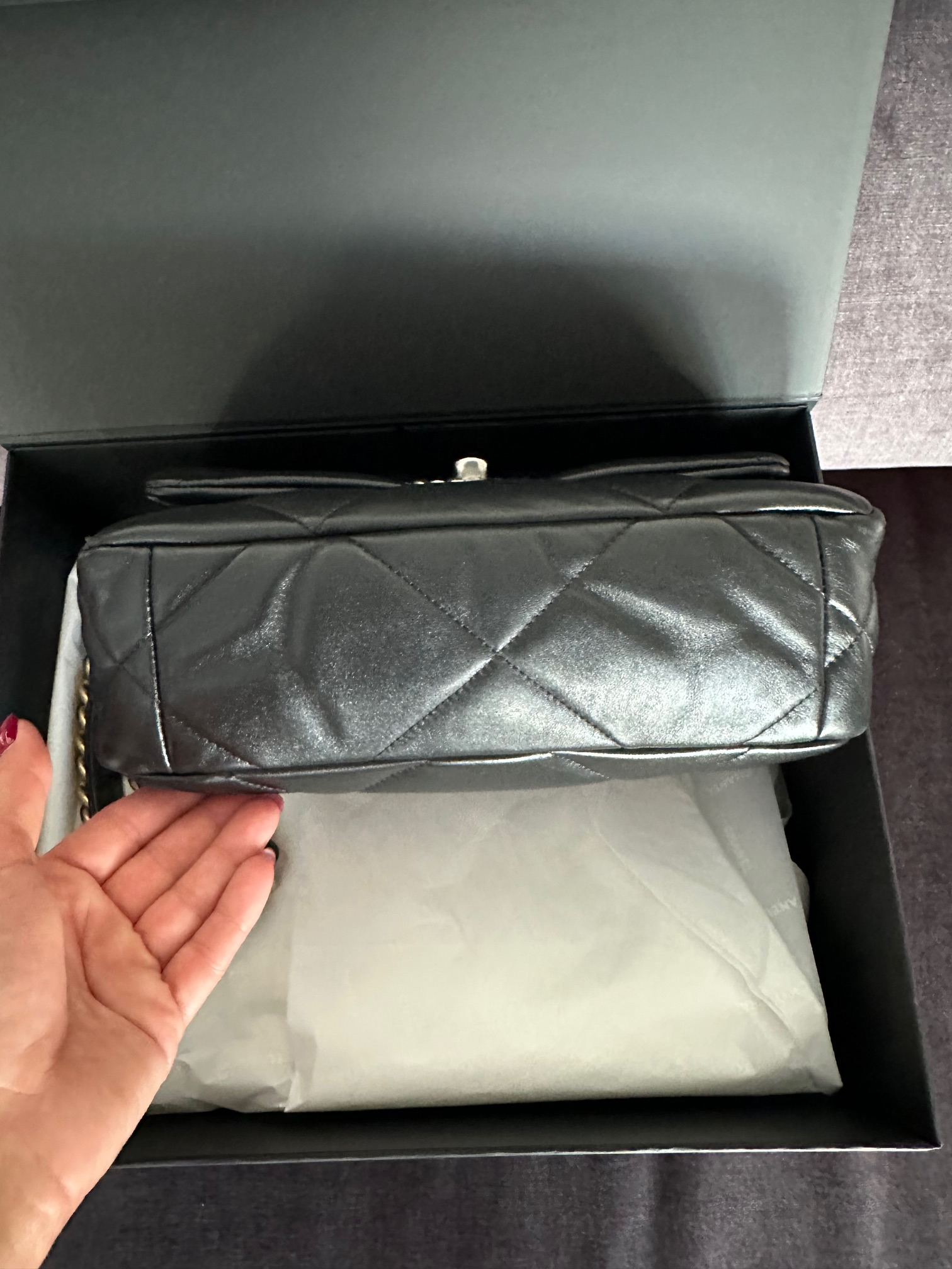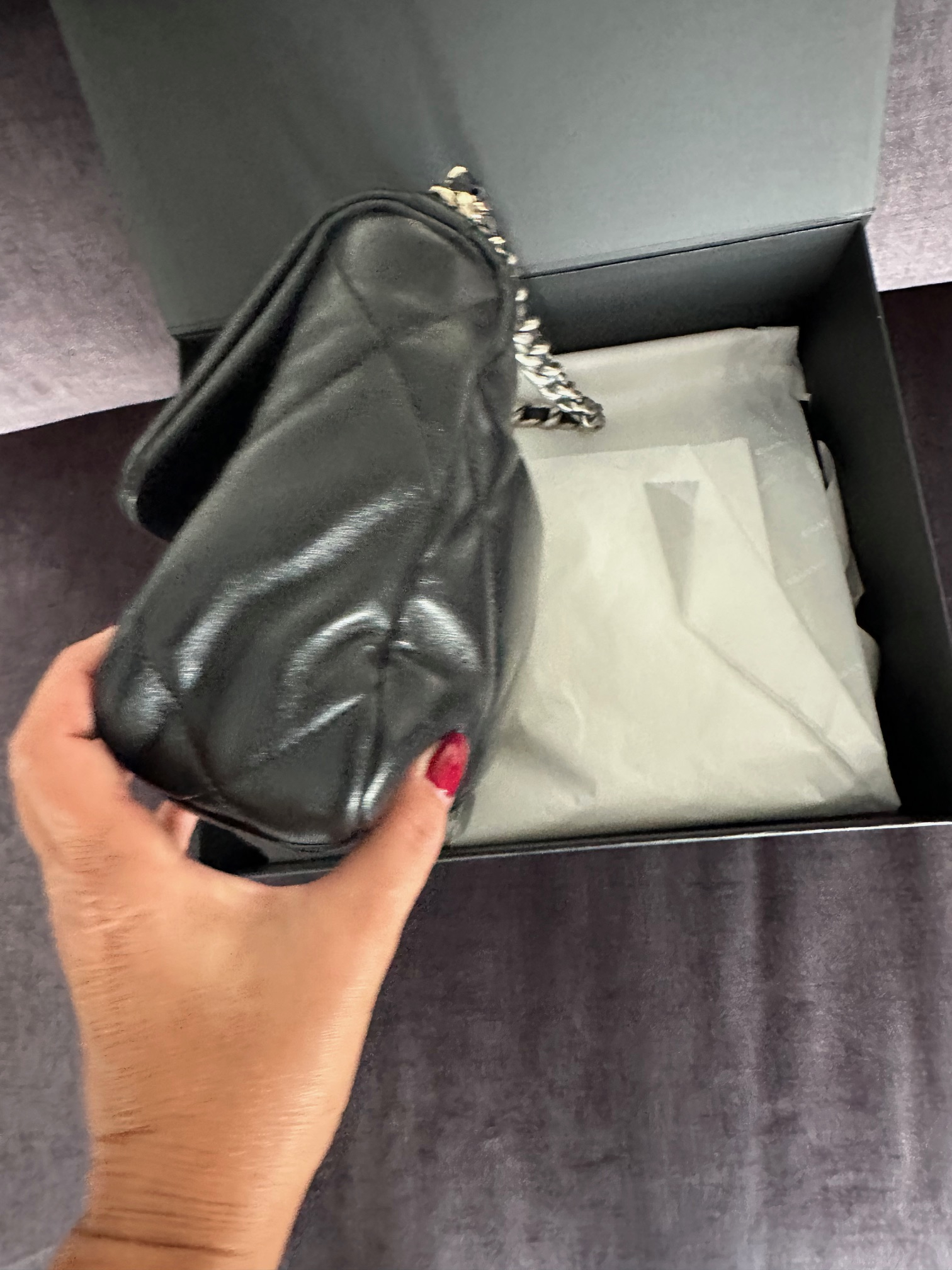 "Czarna torebka ze skóry jagnięcej. Logo CC w kolorze srebrnym oraz łańcuch w kolorze srebrnym, postarzanego złota oraz szampańskiego złota - Chanel 19, rozmiar small. Zakupiona w 2024 roku w Berlinie. W zestawie z rachunkami. Stan bardzo dobry, jedyny ślad użytkowania to plama od błyszczyka w kieszonce. Wymiary torebki: 26 x 16 x 9."