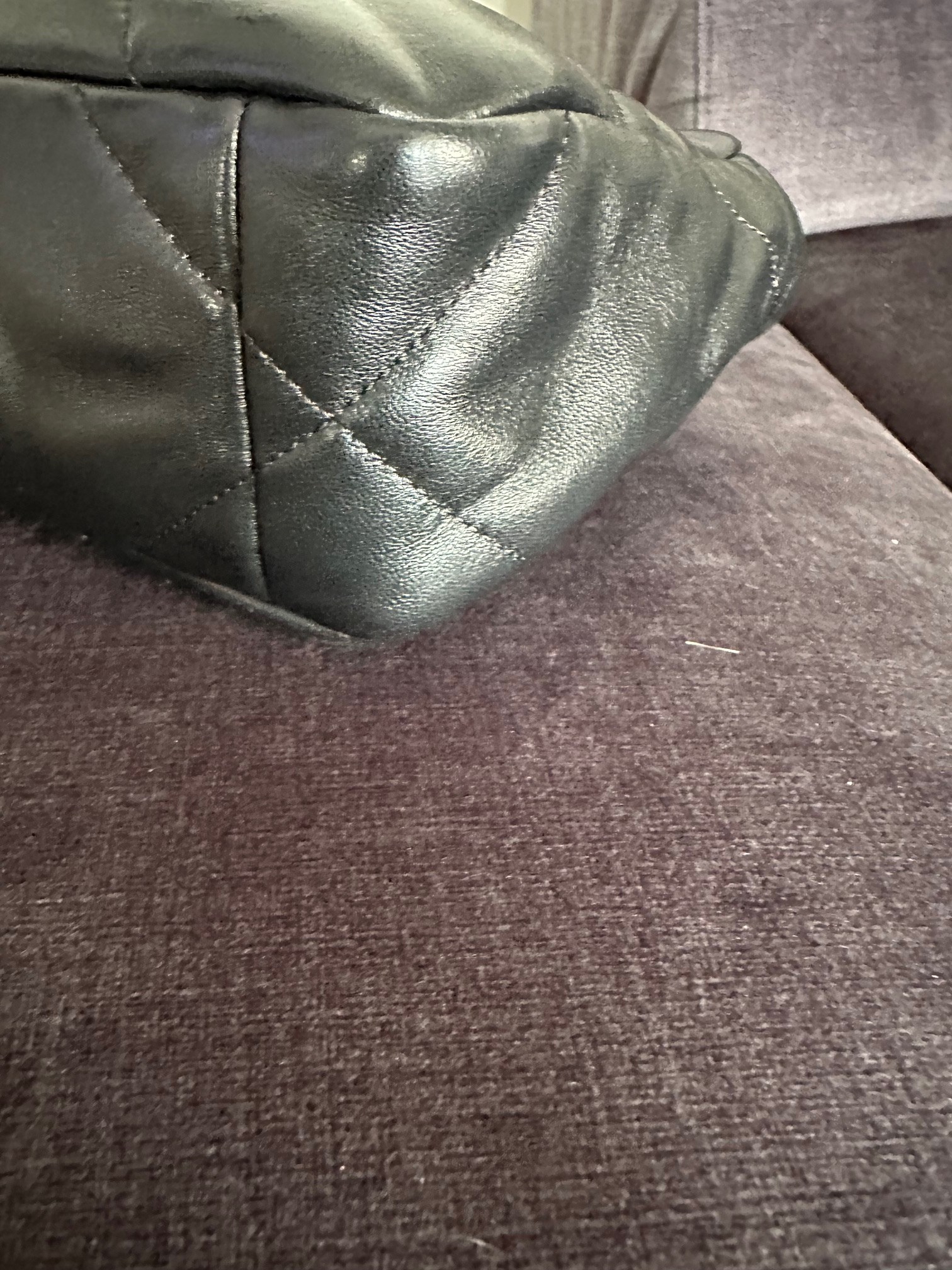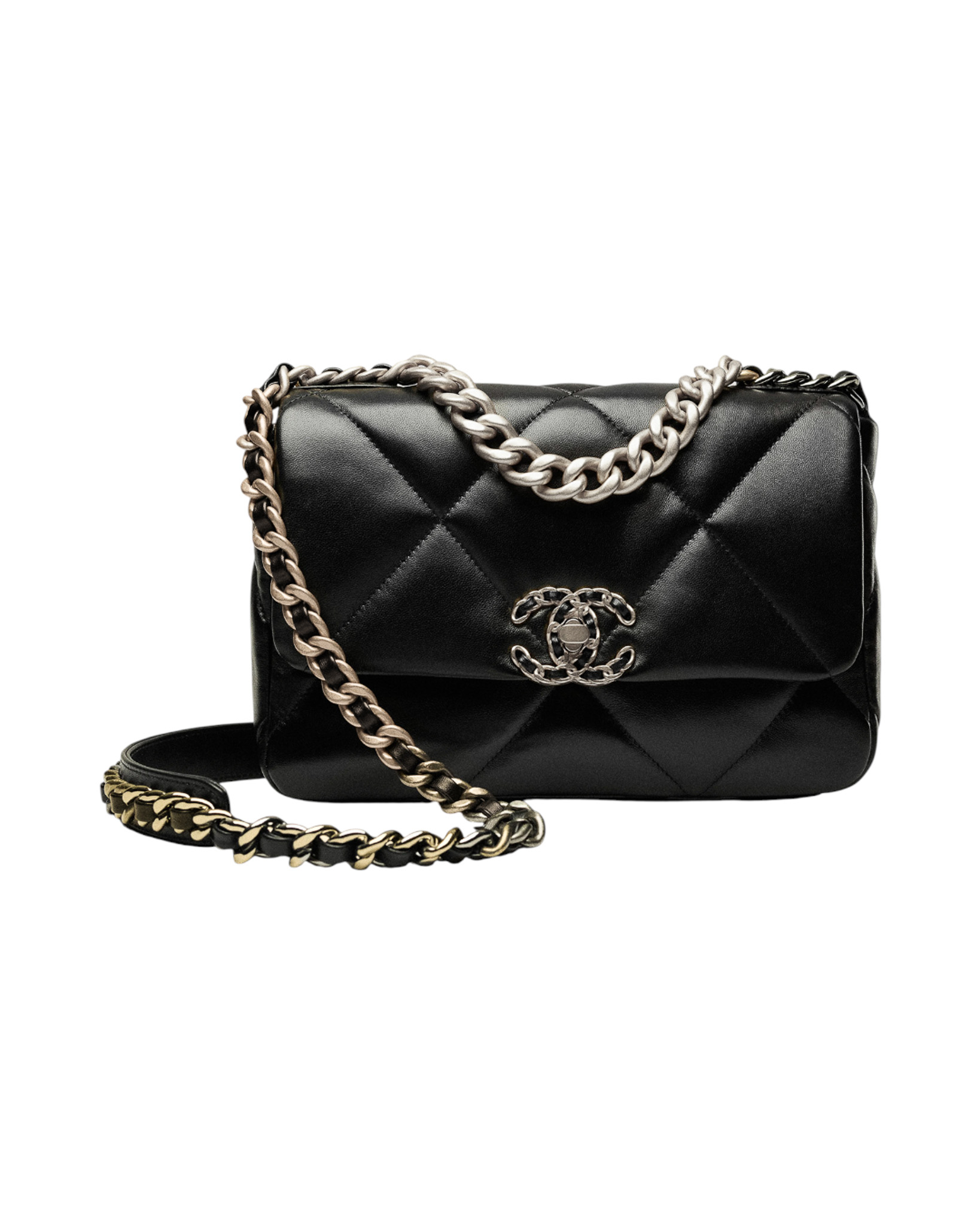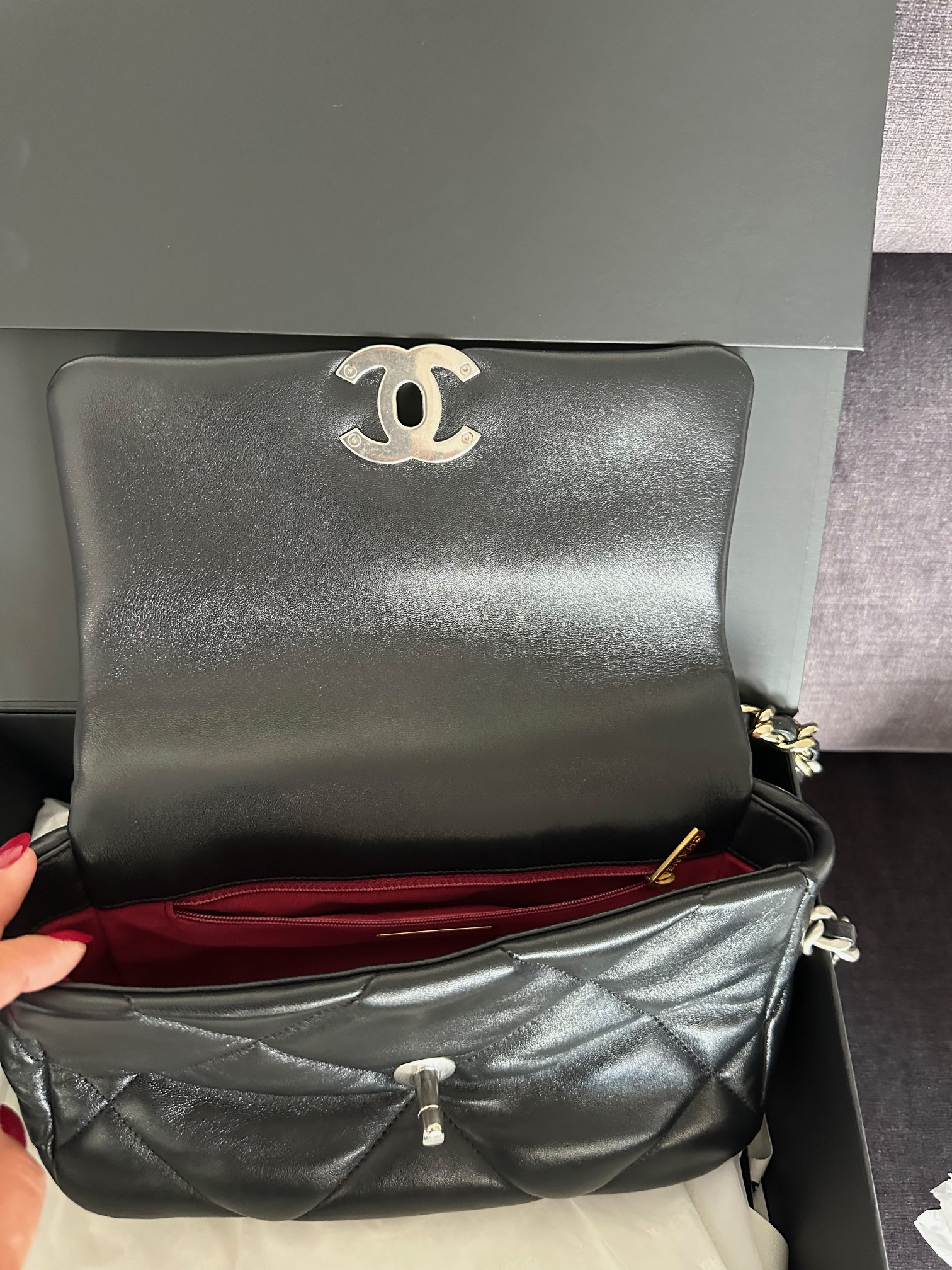 "Czarna torebka ze skóry jagnięcej. Logo CC w kolorze srebrnym oraz łańcuch w kolorze srebrnym, postarzanego złota oraz szampańskiego złota - Chanel 19, rozmiar small. Zakupiona w 2024 roku w Berlinie. W zestawie z rachunkami. Stan bardzo dobry, jedyny ślad użytkowania to plama od błyszczyka w kieszonce. Wymiary torebki: 26 x 16 x 9."