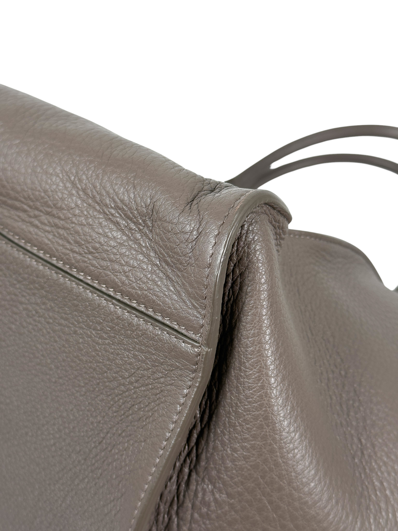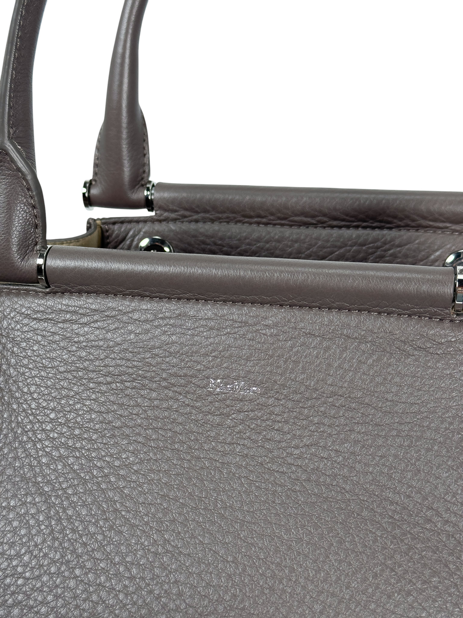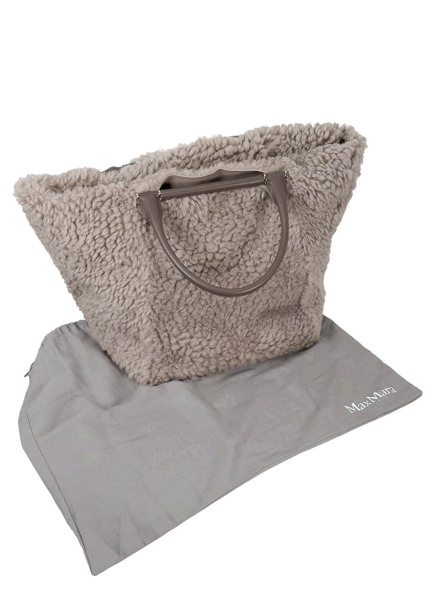 "Skórzana torebka w kolorze taupe ozdobiona ściąganym futrem/kożuchem, groszkowa skóra, dwa uchwyty do ręki/ na ramię, srebrne okucia, zamszowe wnętrze, jedna duża komora, dwie kieszenie, zapinana na logowany karabińczyk w zestawie z workiem przeciwkurzowym. Stan idealny. Wymiary: szerokość 28cm, wysokość 34cm, głębokość 31cm."