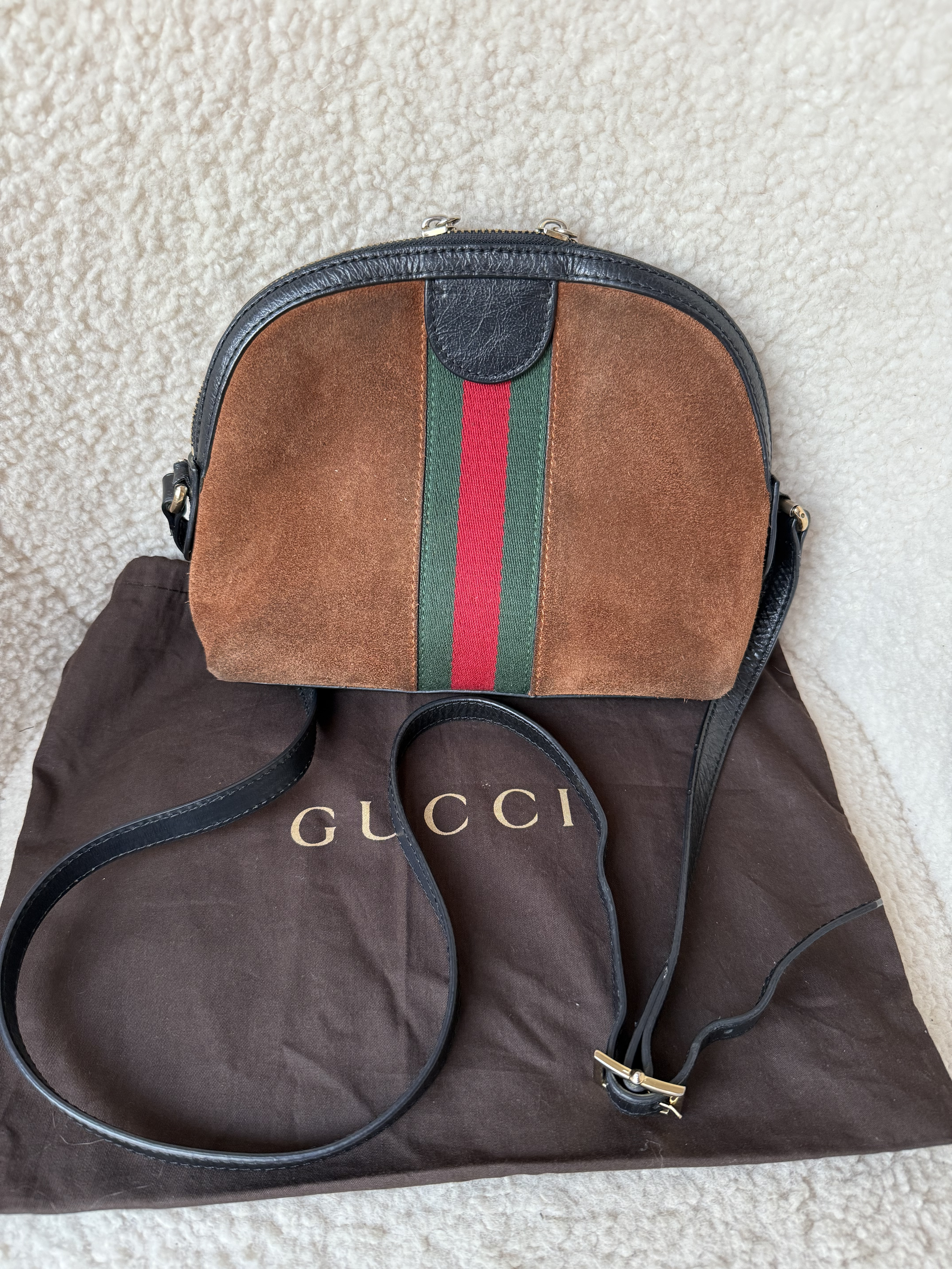"Ponadczasowa torebka na ramię Gucci Ophidia . Wykonana z zamszu wraz ze skórzanymi detalami. Zapinana na zamek. Wewnątrz atłasowa podszewka z kieszonkami. Numer seryjny wewnątrz torebki. Piękne jesienne kolory . Dosyć pojemna. W komplecie z woreczkiem przeciwkurzowym."