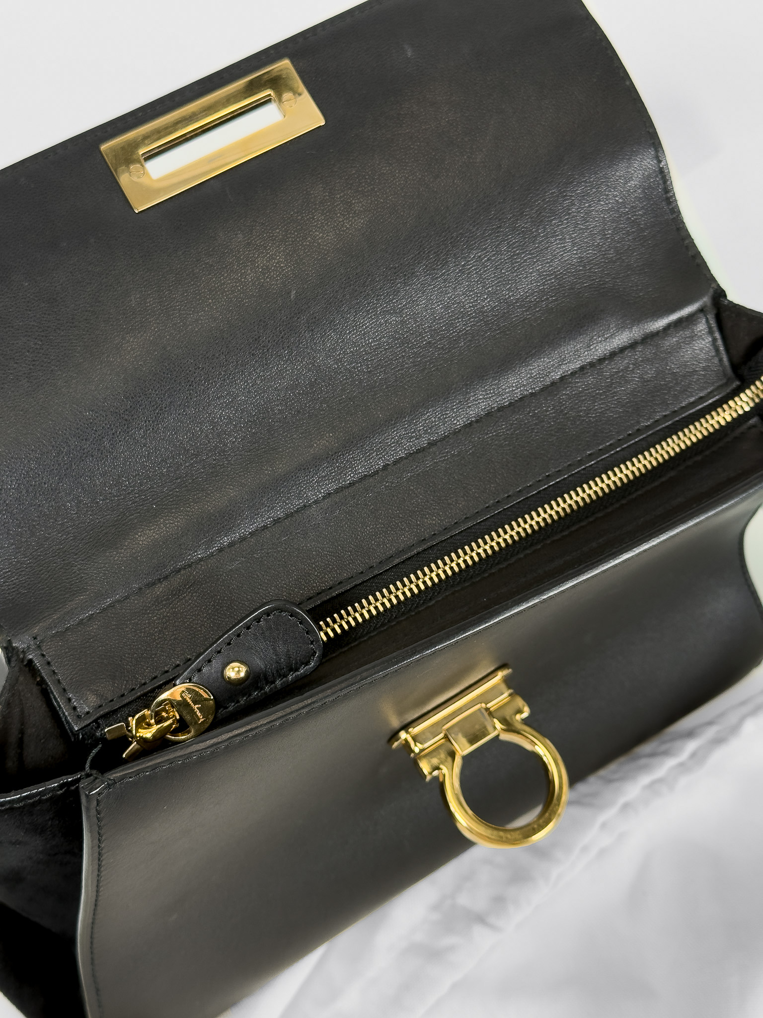 "Model: Sofia. Czarna skórzana torebka, zapięcie na klapę. Wewnątrz posiada jedną przegrodę zapinaną na zamek, złote okucia. Po bokach wstawki z zamszowej skóry. Z tyłu torebki dodatkowa kieszonka na zamek, odpinany, długi pasek. Stan bardzo dobry, posiada zarysowania na skórze oraz na złotych elementach. Wymiary: wysokość 25 cm, szerokość 30 cm, głębokość 10 cm."