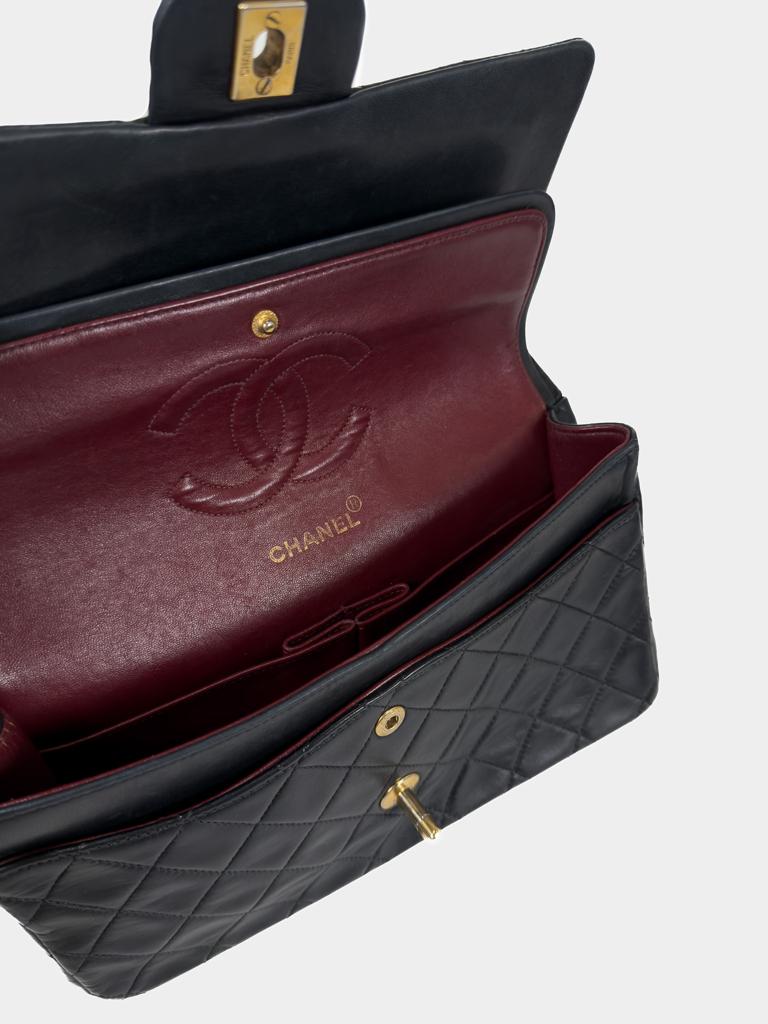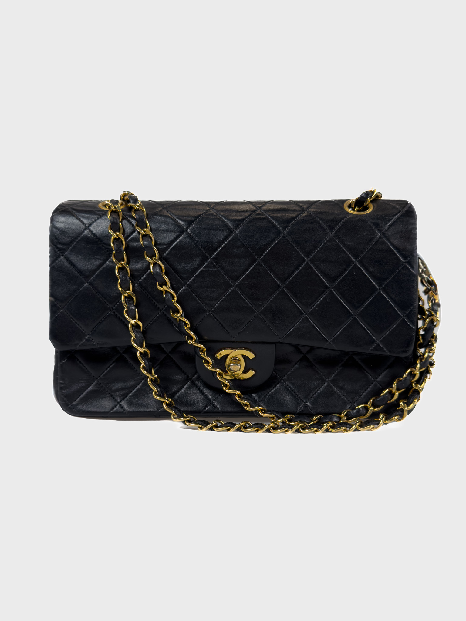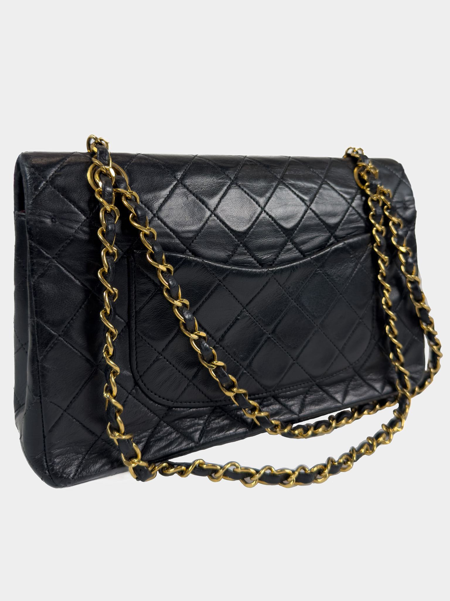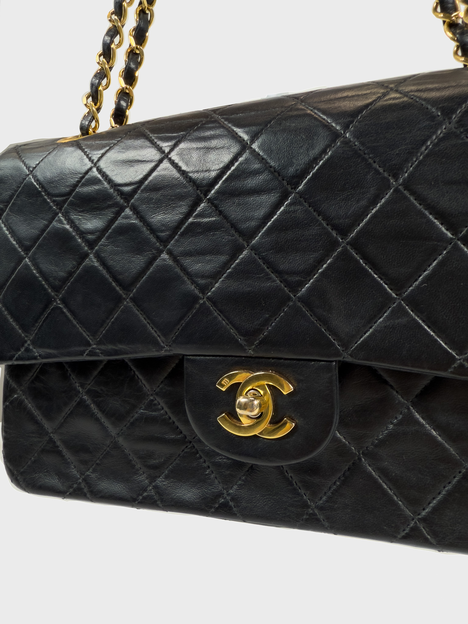 "Czarna skórzana torebka, pikowana diamentowo, złote logo marki w centralnej części, klasyczne zapięcie obrotowe pod klapą, długi pasek na ramię przeplatany skórą i łańcuchem. Jedna główna komora, wewnątrz zasuwana kieszeń oraz otwarta przegroda, kieszeń zewnętrzna z tyłu, lekko porysowana. Stan bardzo dobry – widoczne delikatne zarysowania na rogach oraz przetarcia i ogólne ślady użytkowania. W środku na klapie delikatne zarysowania. W zestawie z workiem przeciwkurzowym. Lata: 189/1991. Potwierdzenie orginalności Entrupy w komplecie. Wymiary: szerokość 26 cm, wysokość 16cm, głębokość 7 cm"
