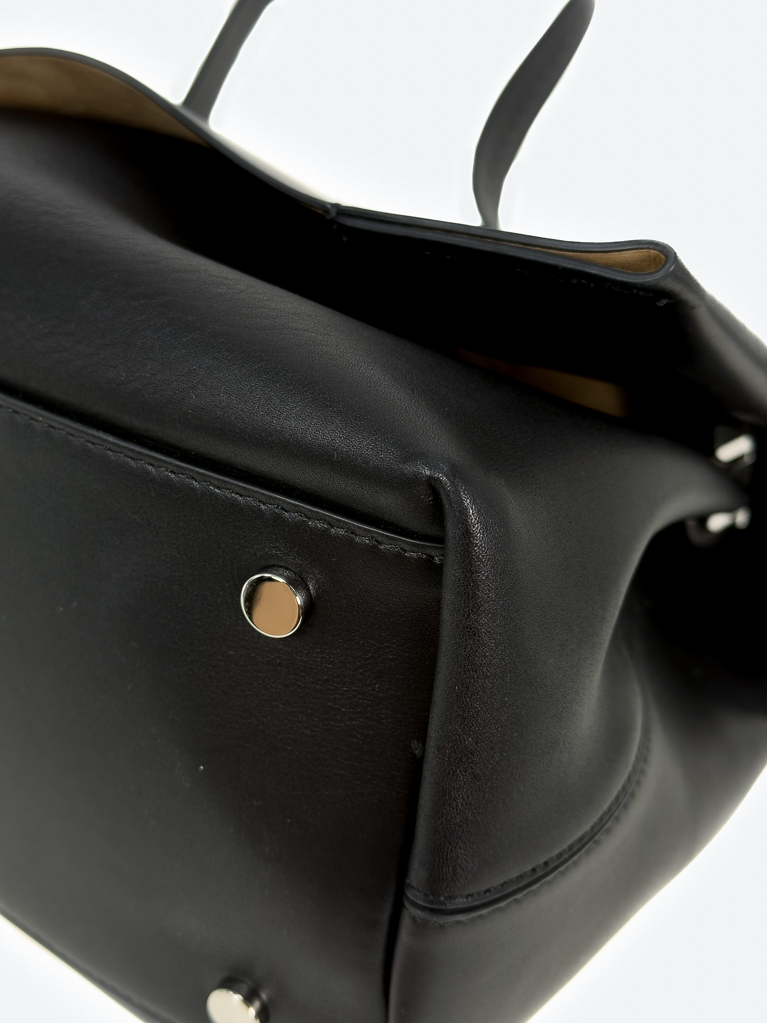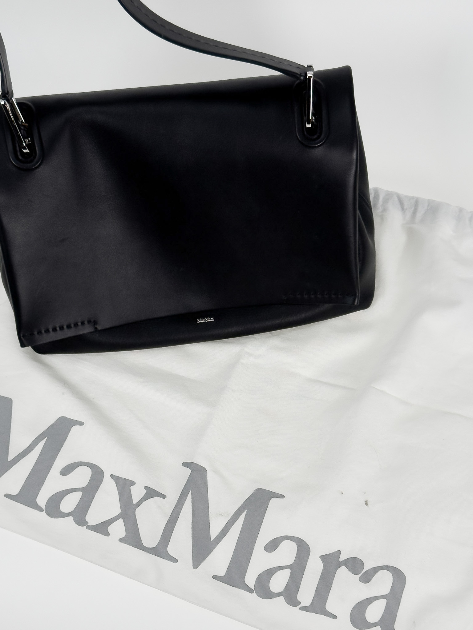 "Czarna skórzana torebka na ramię, miękka skóra, jeden uchwyt, wykończona dekoracyjnym przeszyciem, logo marki pod klapą, srebrne okucia, cztery nóżki od spodu, brązowe wnętrze, jedna komora z kieszenią, w zestawie z workiem przeciwkurzowym. Stan bardzo dobry, posiada delikatne zarysowania na skórze oraz nóżkach, plamy od długopisu wewnątrz. Wymiary: szerokość 34cm, wysokość 23cm, głębokość 16cm."