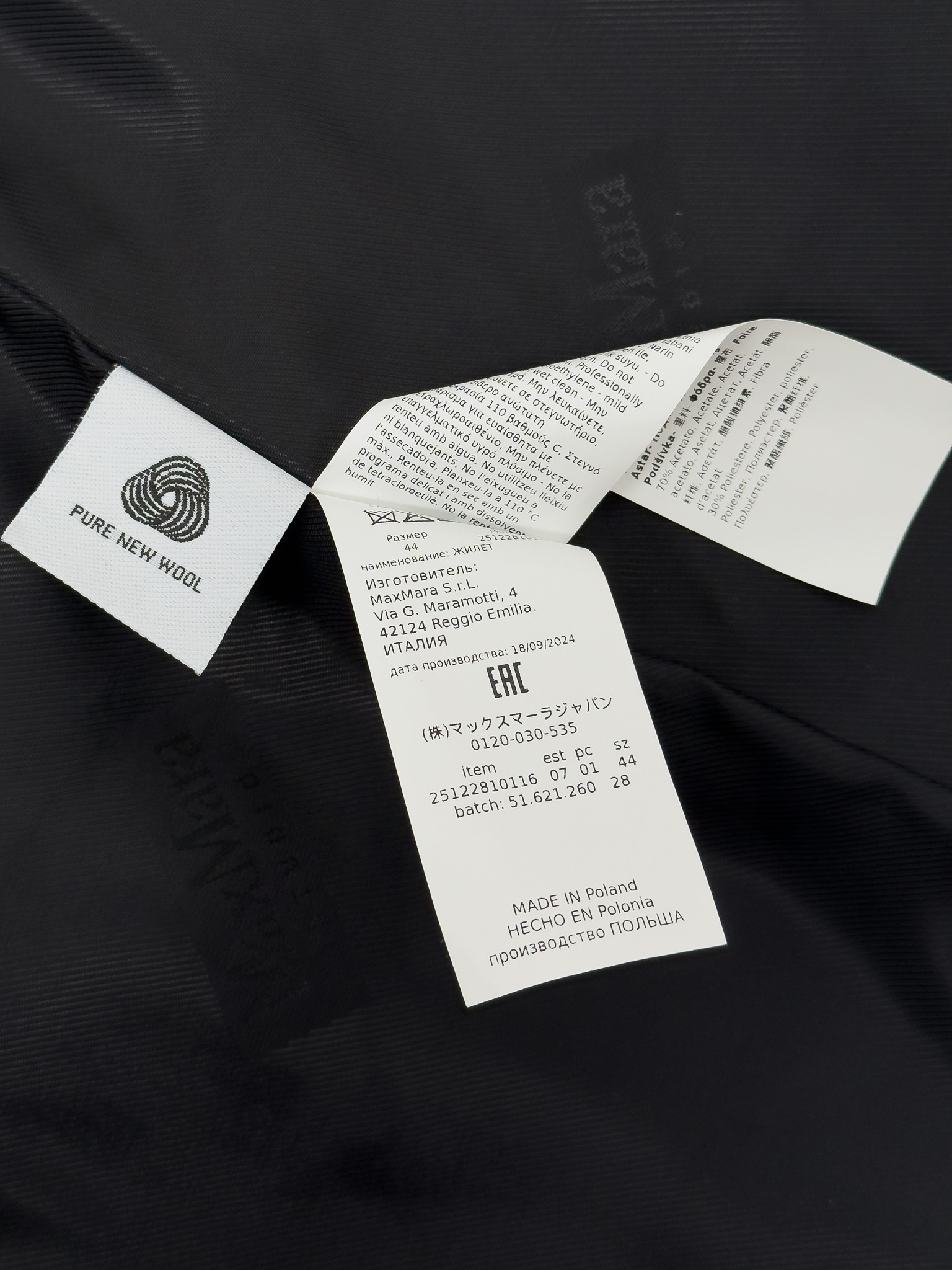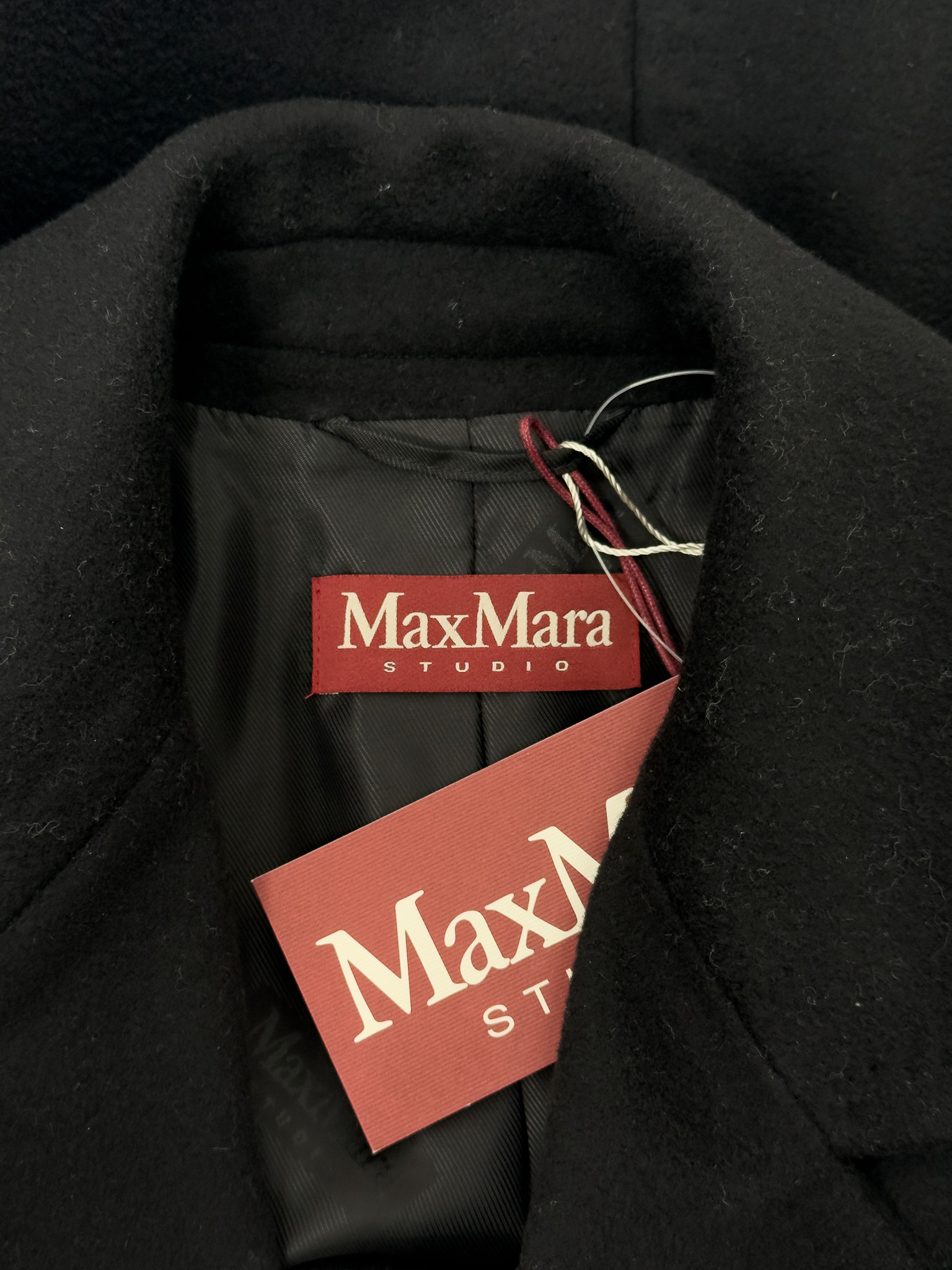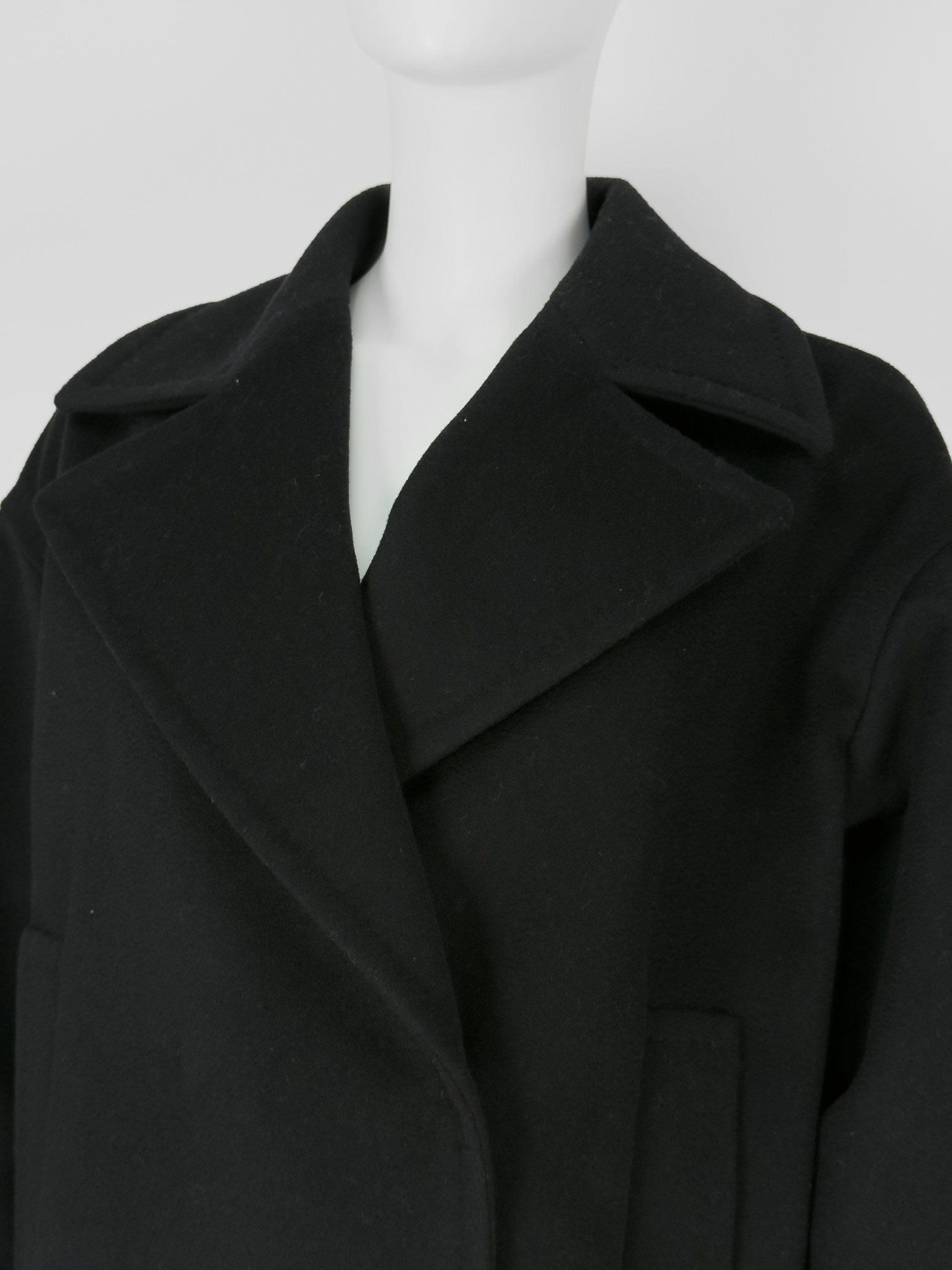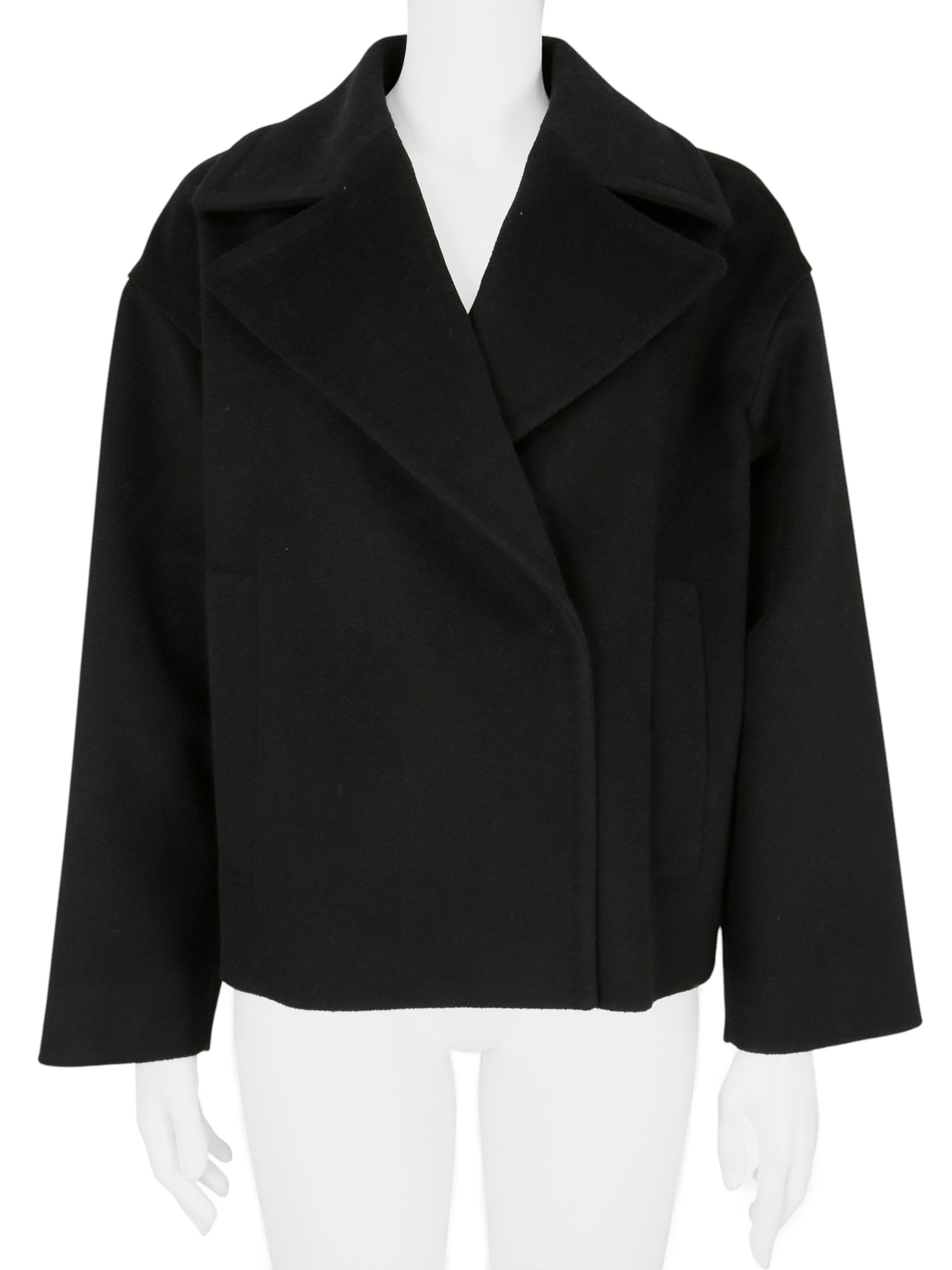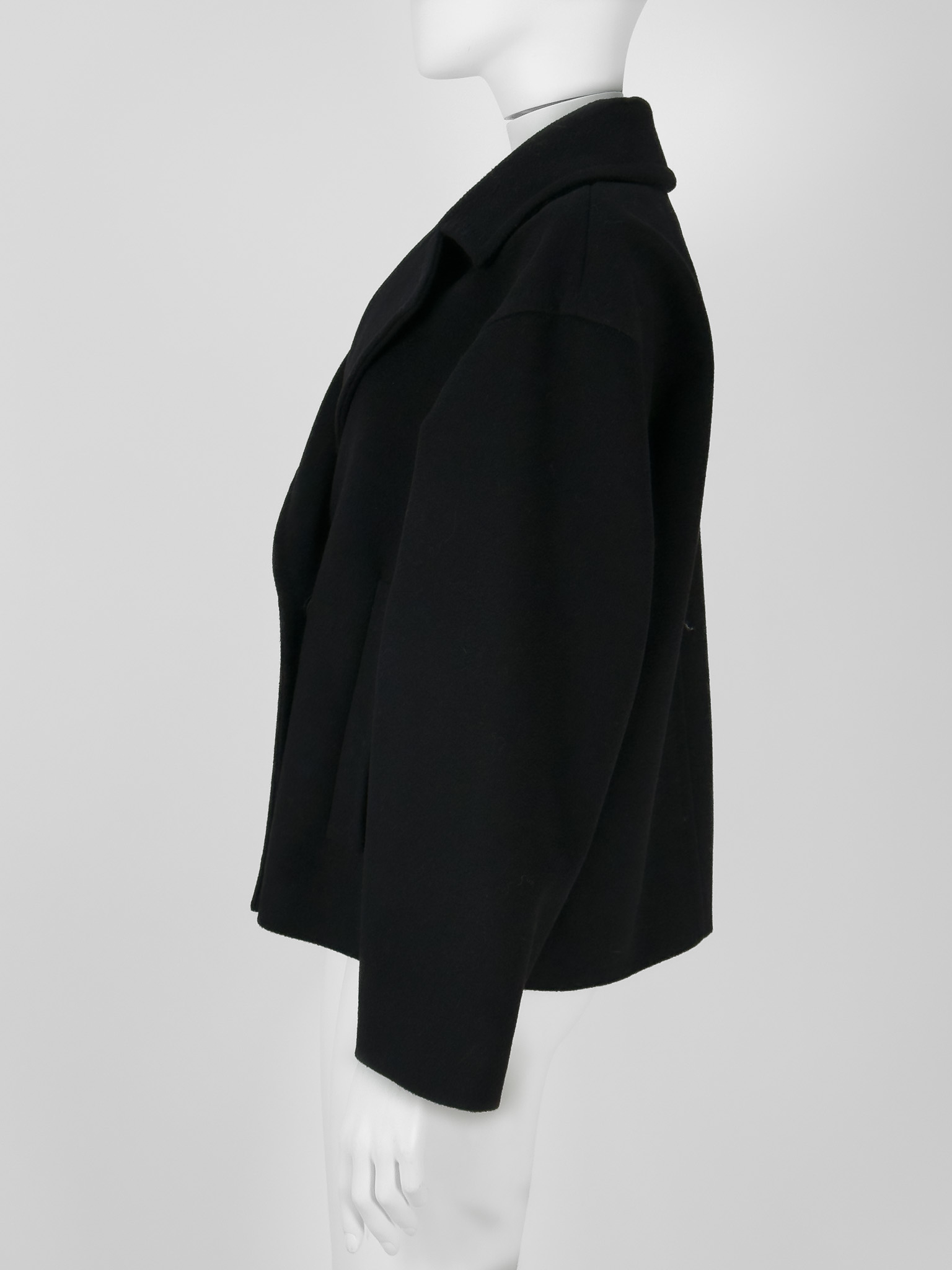 "Czarna wełniana bosmanka, zapinana na kryte zatrzaski, krój oversize, kołnierz, dwie kryte kieszenie po bokach, dekolt w serek, wykończona stębnowaniem, logowana podszewka. Stan nowy z metką. Rozmiar z metki IT 44. Skład: 100% wełna dziewicza; podszewka: 70% acetat, 30% poliester. Wymiary: szerokość mierzona do pachy do pachy 61cm, długość całkowita 62cm."