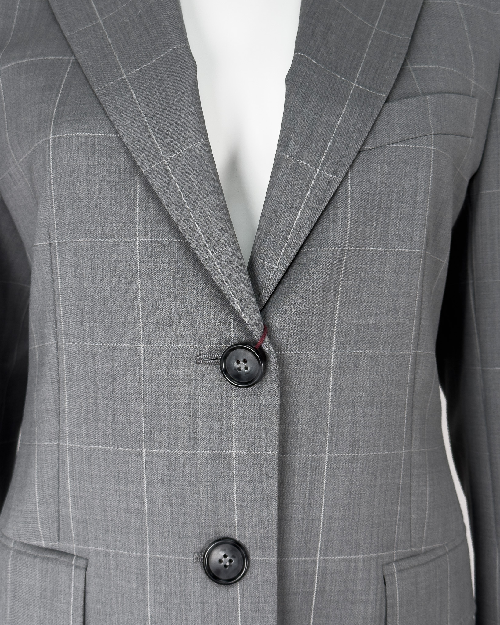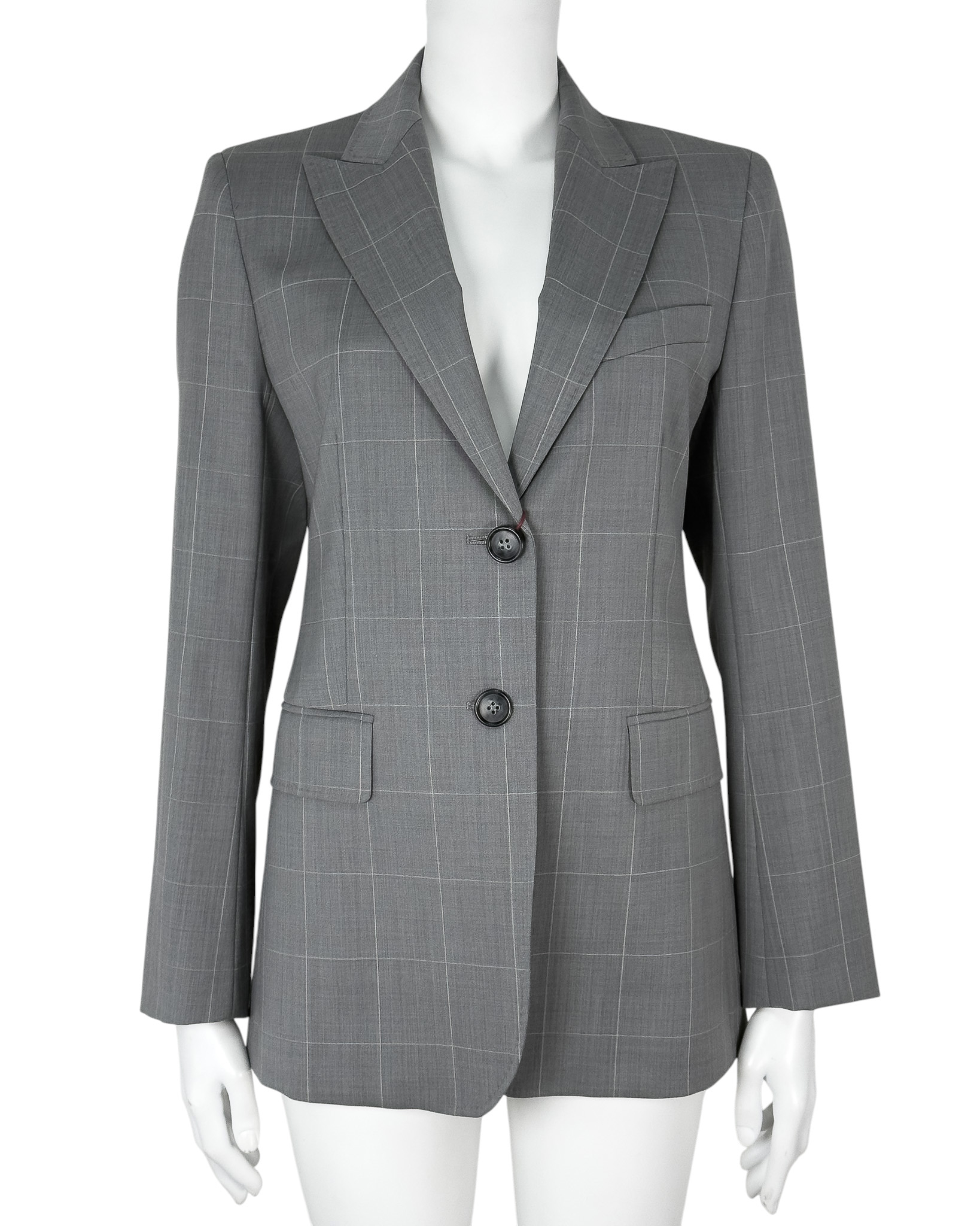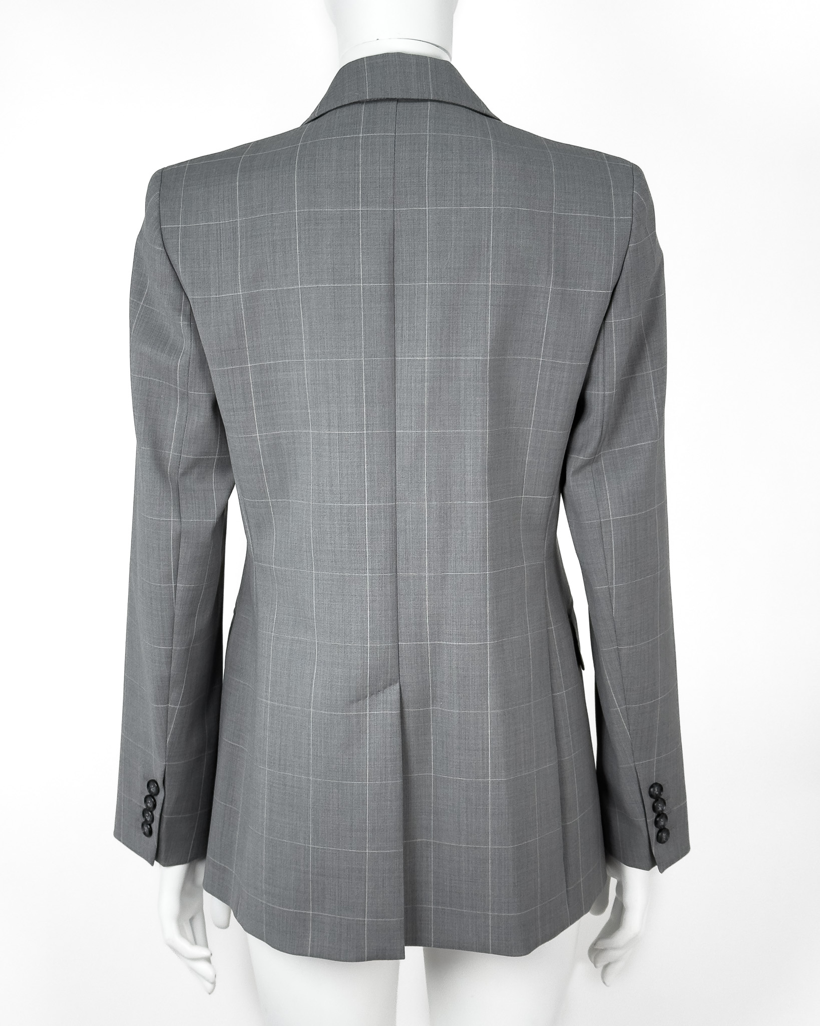"Szara wełniana marynarka w delikatną białą kratę, zapinana na dwa guziki, dekolt w szpic, poduszki na ramionach, mankiety ozdobione guzikami, dwie zaszyte kieszenie z klapami po bokach, taliowana, rozporek. Stan nowa z metką. Rozmiar z metki IT 42. Skład: 100% wełna; podszewka: 70% acetat, 30% poliester."