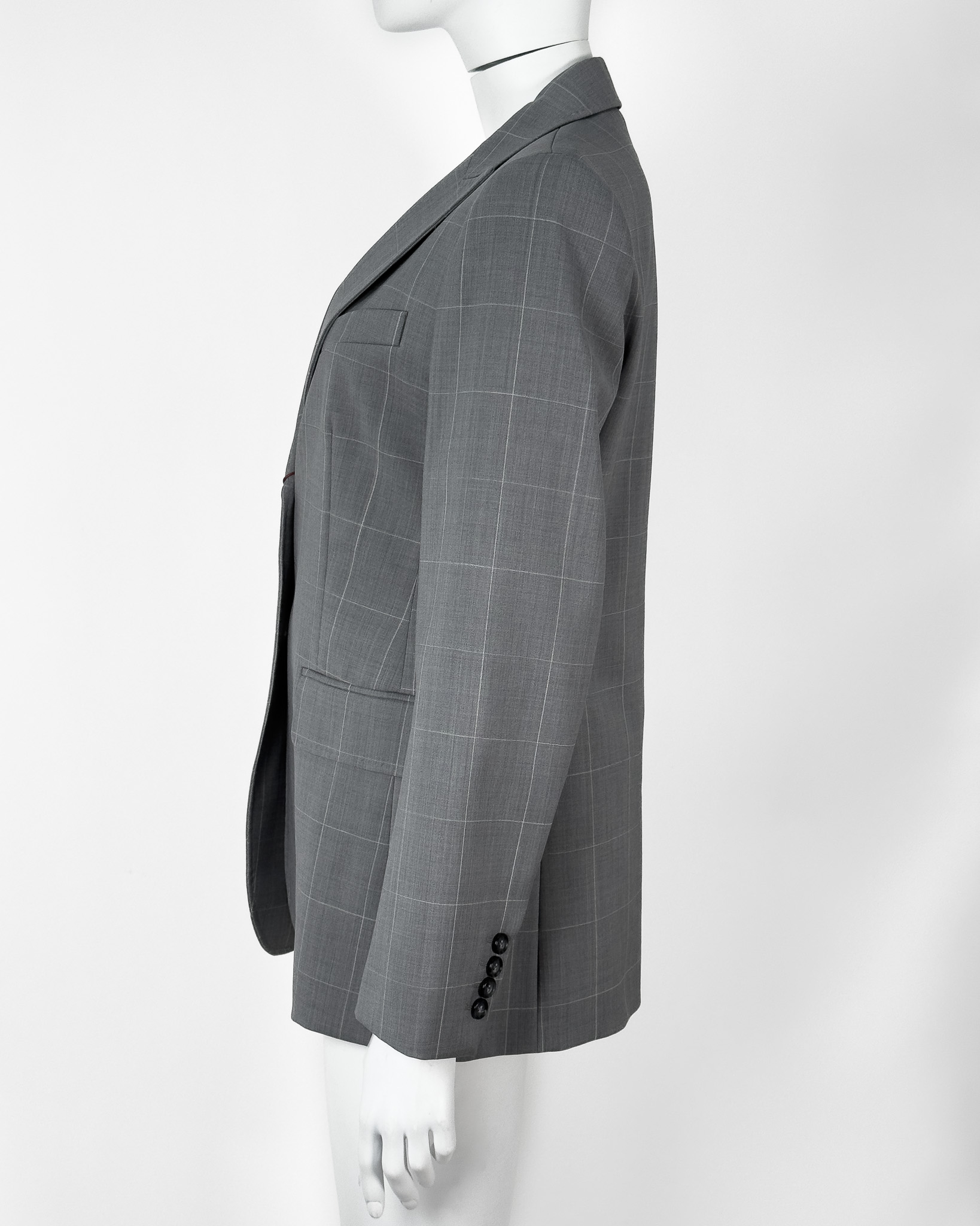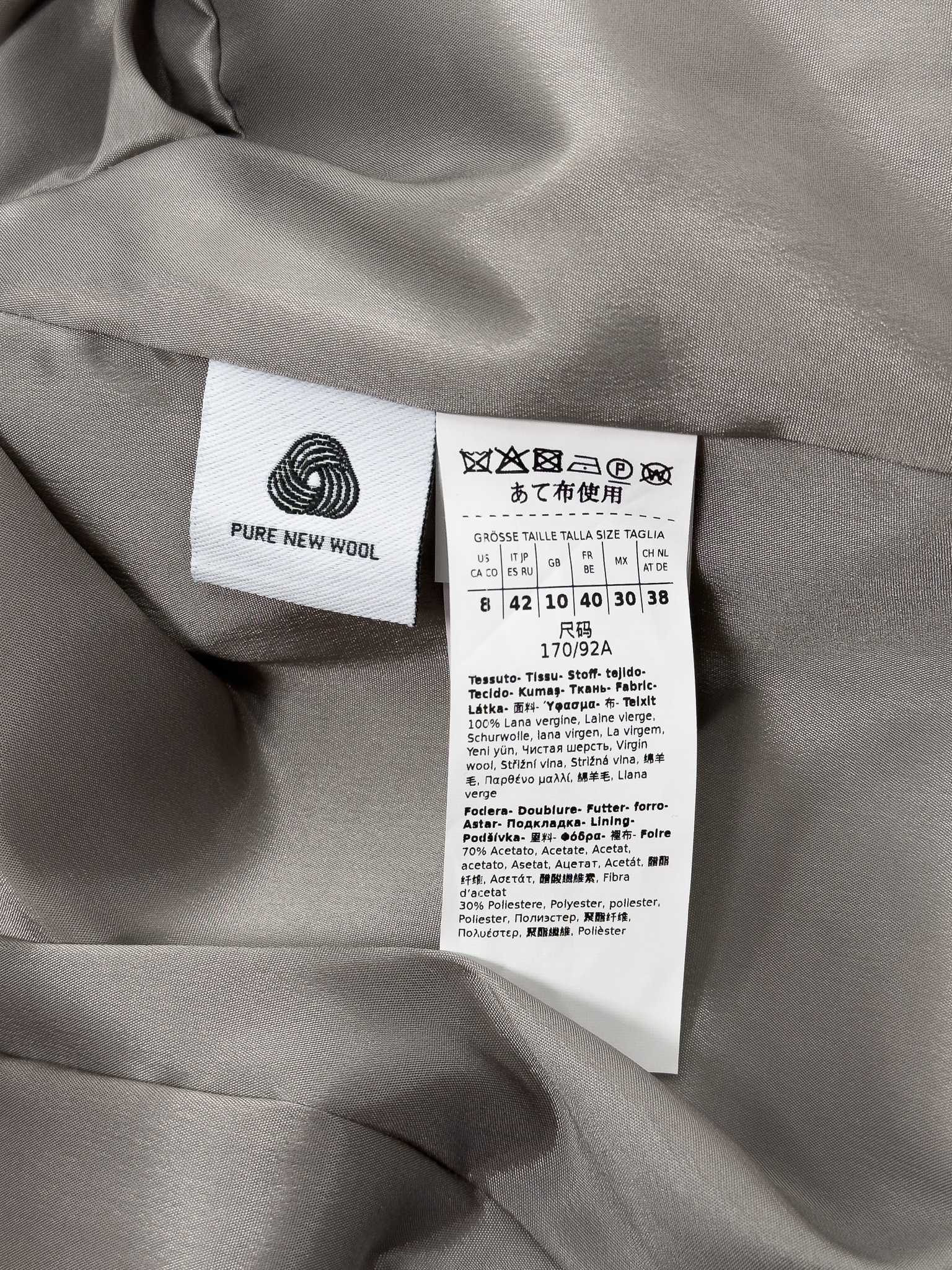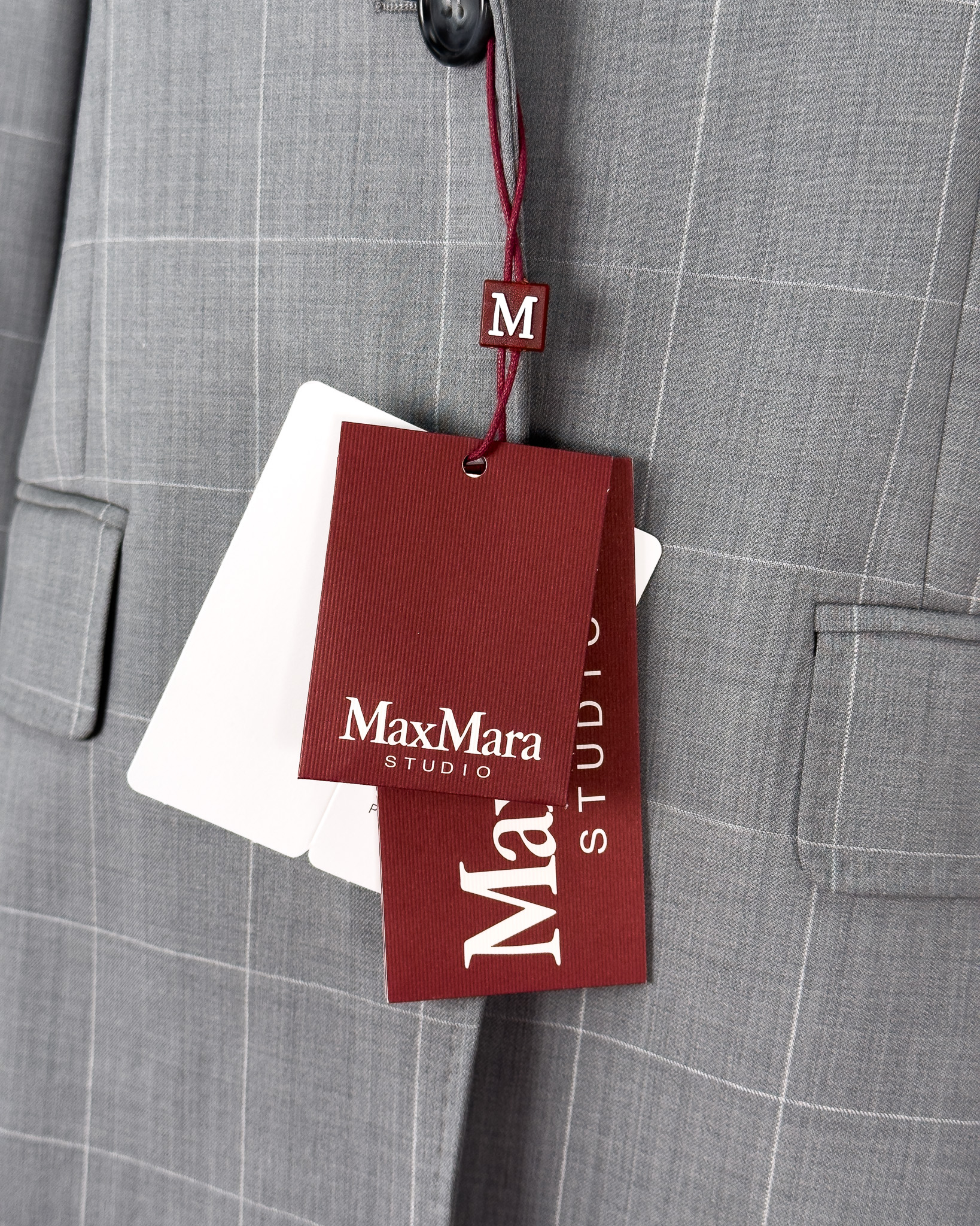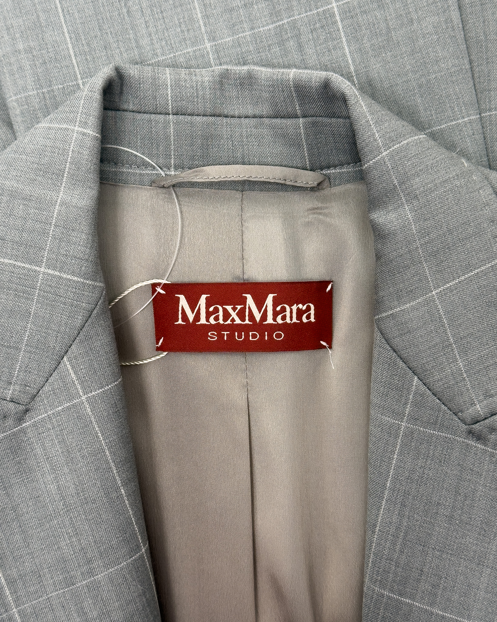 "Szara wełniana marynarka w delikatną białą kratę, zapinana na dwa guziki, dekolt w szpic, poduszki na ramionach, mankiety ozdobione guzikami, dwie zaszyte kieszenie z klapami po bokach, taliowana, rozporek. Stan nowa z metką. Rozmiar z metki IT 42. Skład: 100% wełna; podszewka: 70% acetat, 30% poliester."