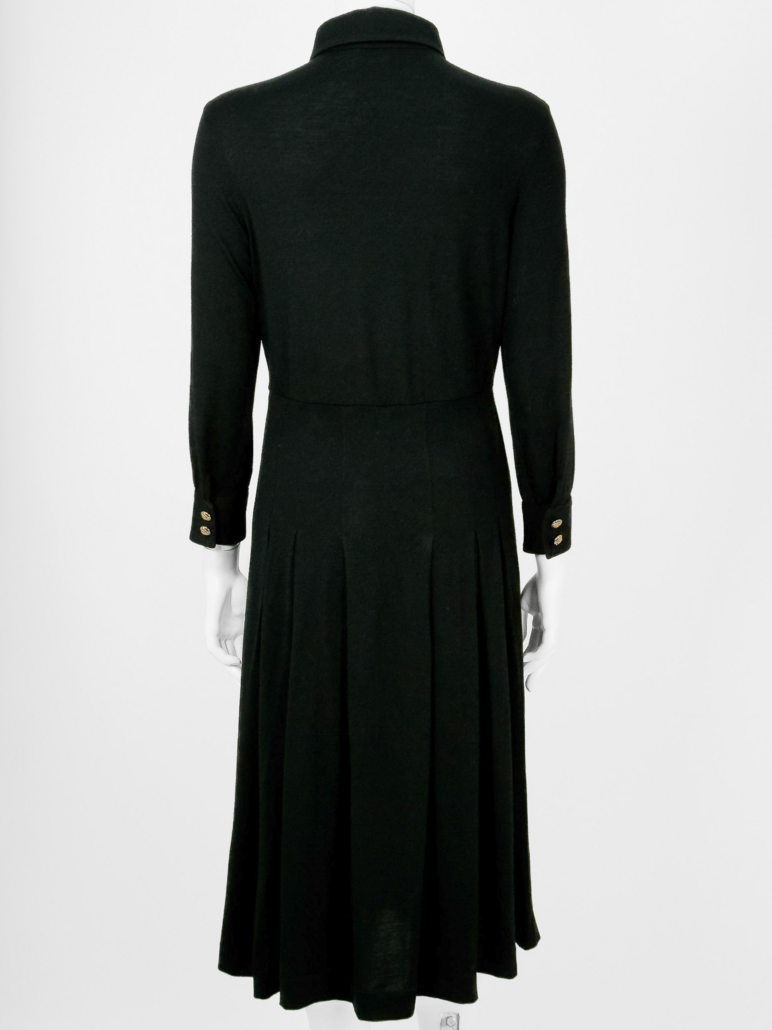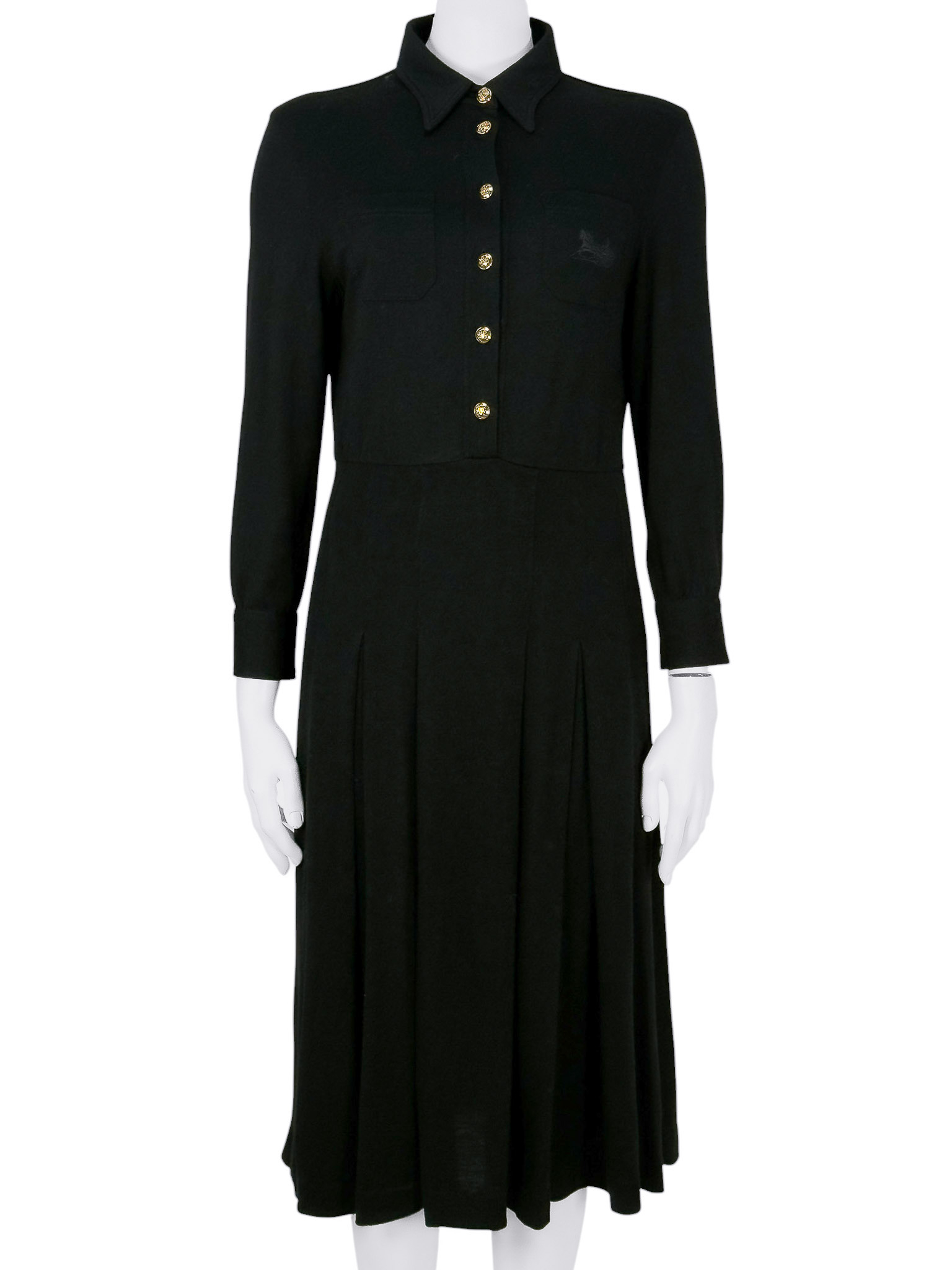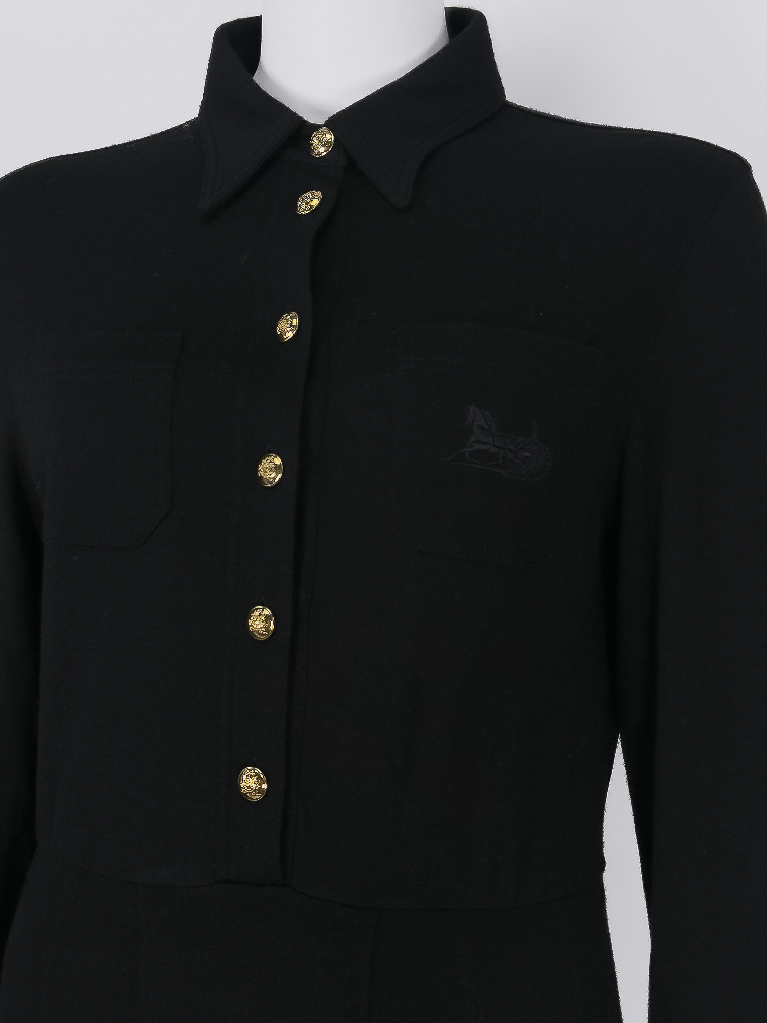 "Prosta wełniana czarna sukienka z kołnierzem zapinana na sześć złotych guzików logowanych, dwie kieszonki z przodu, na jednej z nich logo marki. Sukienka rozkloszowana od talii. Zapinana z boku na zamek. Rozmiar z metki L. Skład: 70% wełna, 30% kaszmir. Wymiary: szerokość mierzona od pachy do pachy 48cm, długość całkowita 116cm."