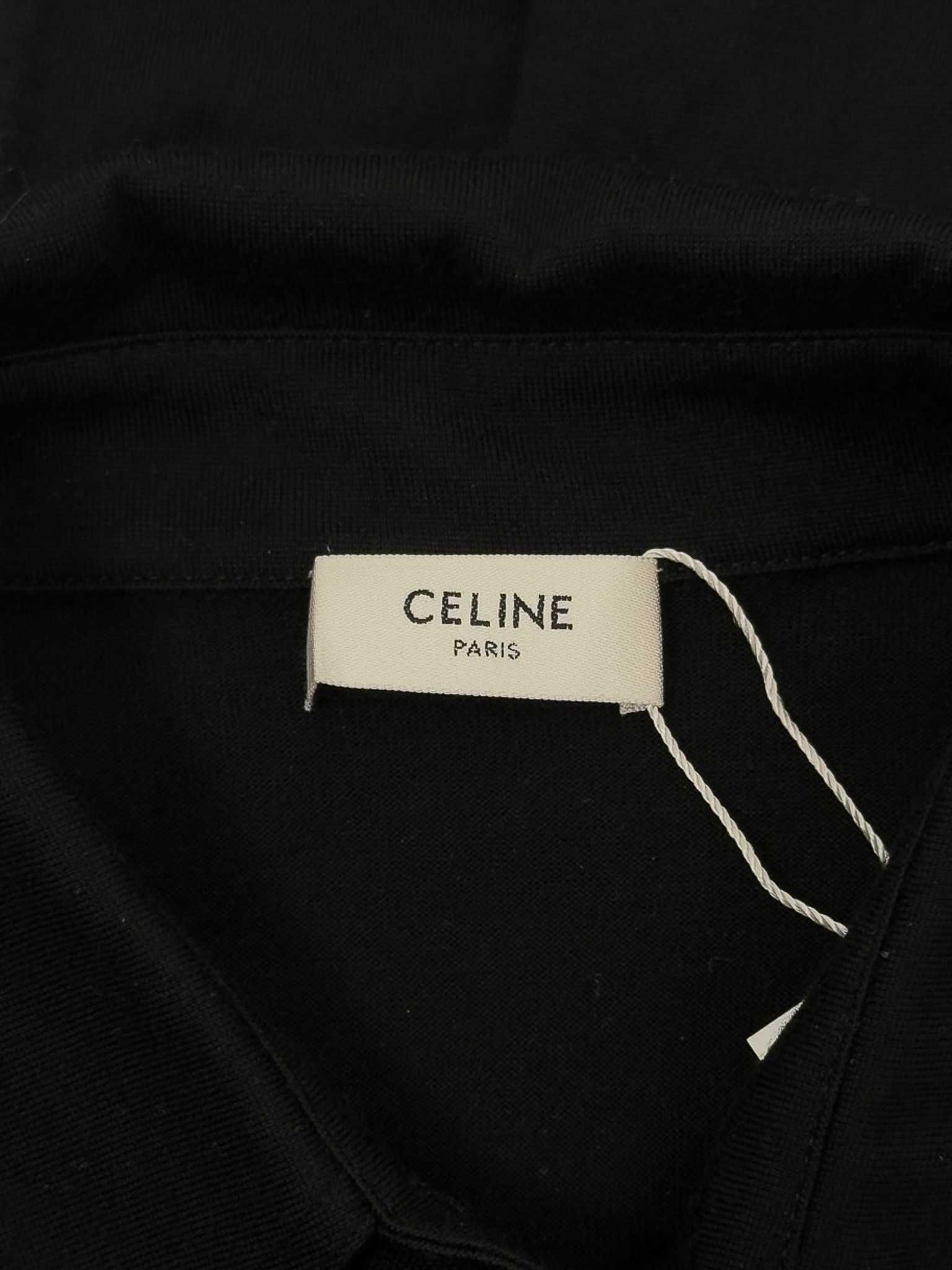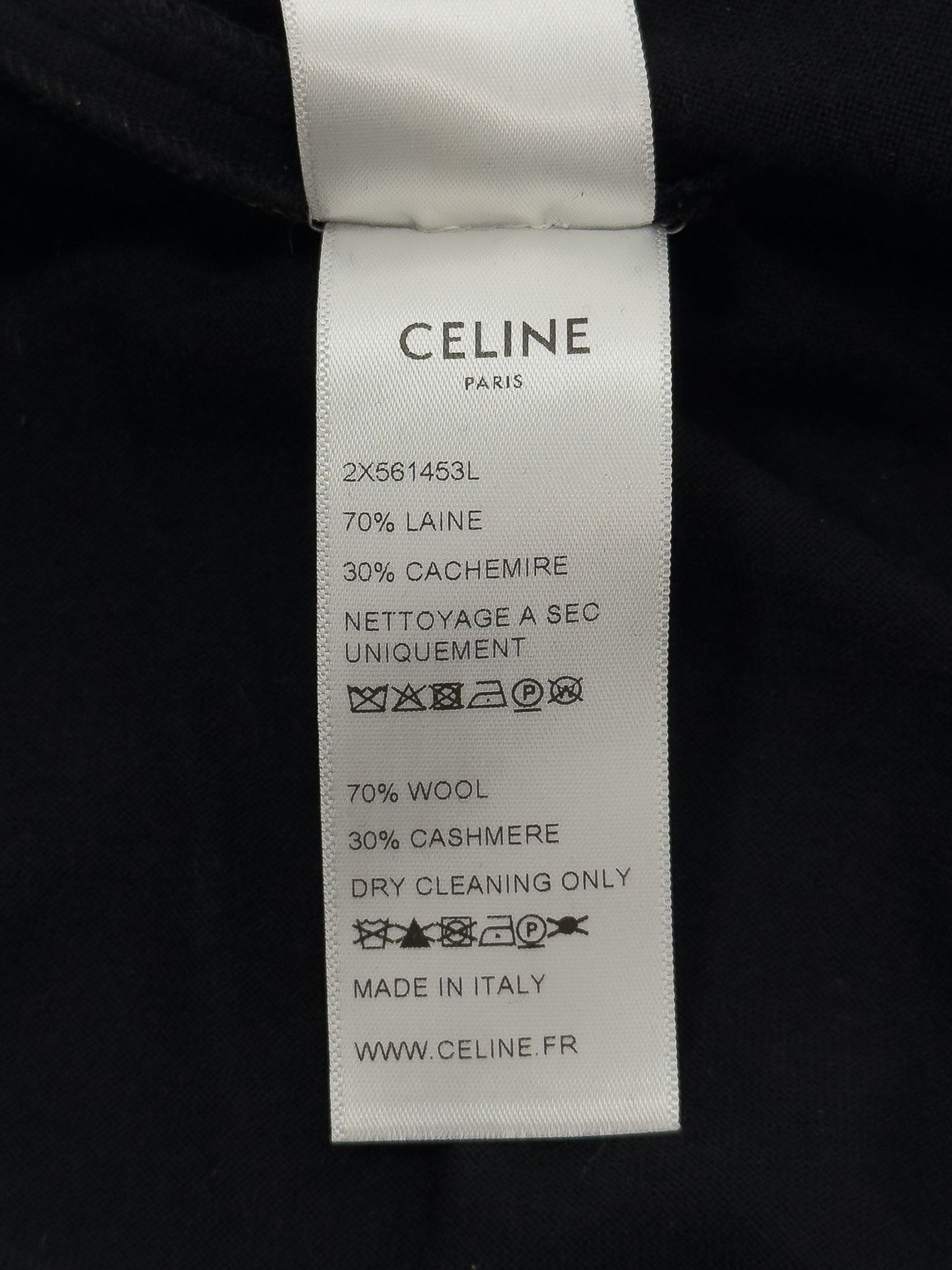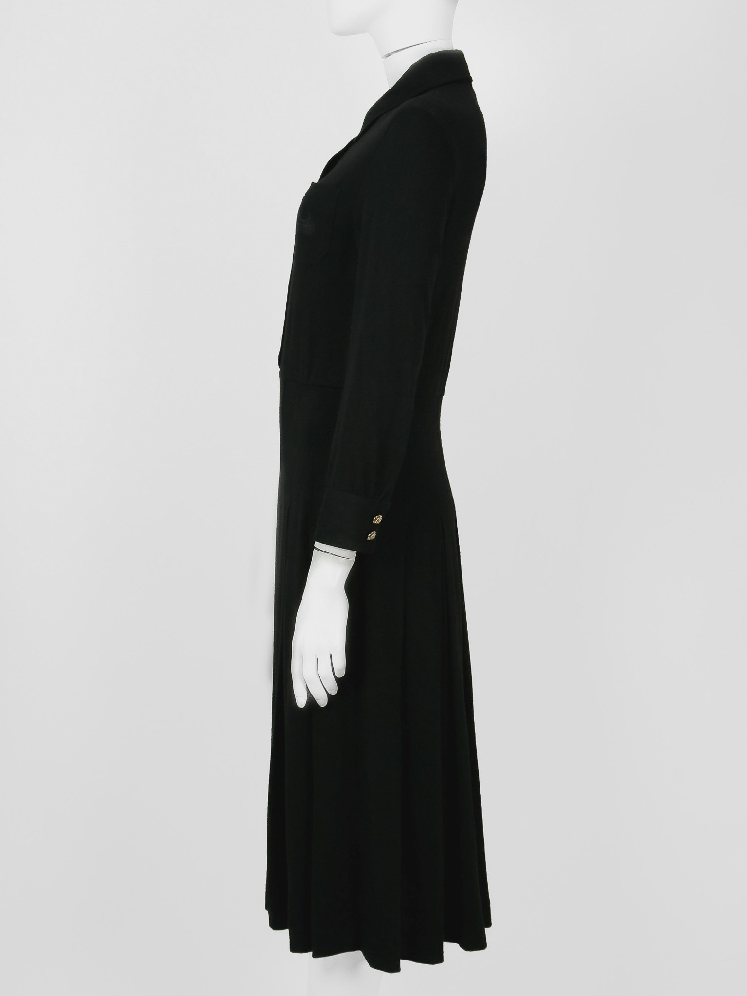 "Prosta wełniana czarna sukienka z kołnierzem zapinana na sześć złotych guzików logowanych, dwie kieszonki z przodu, na jednej z nich logo marki. Sukienka rozkloszowana od talii. Zapinana z boku na zamek. Rozmiar z metki L. Skład: 70% wełna, 30% kaszmir. Wymiary: szerokość mierzona od pachy do pachy 48cm, długość całkowita 116cm."