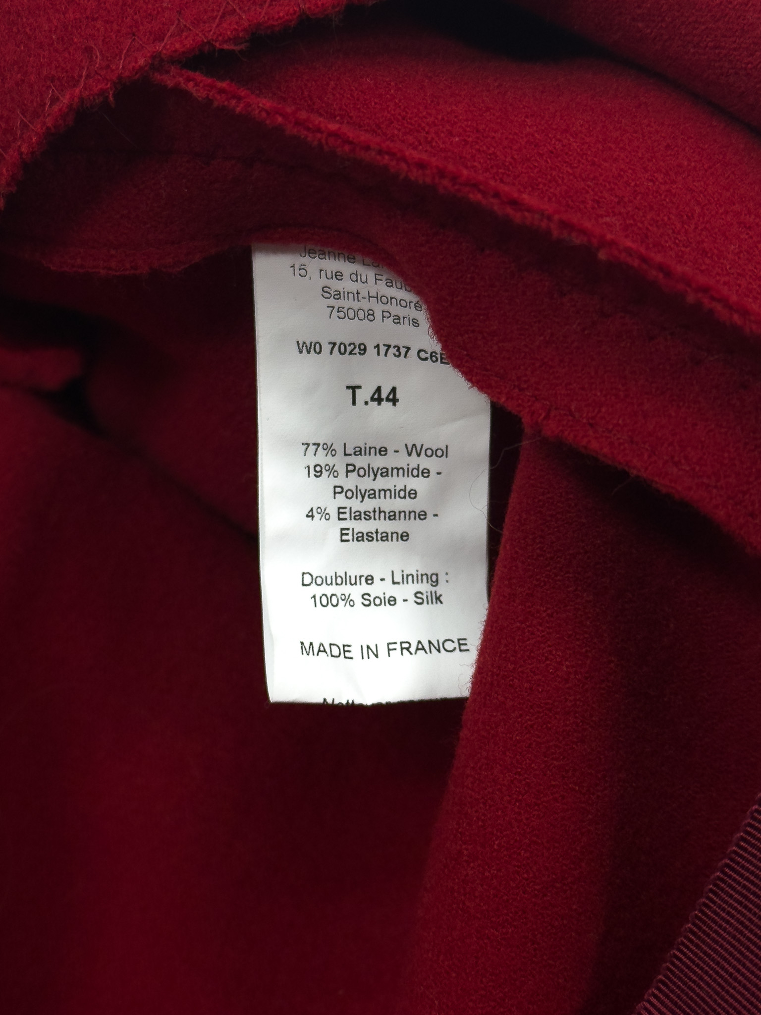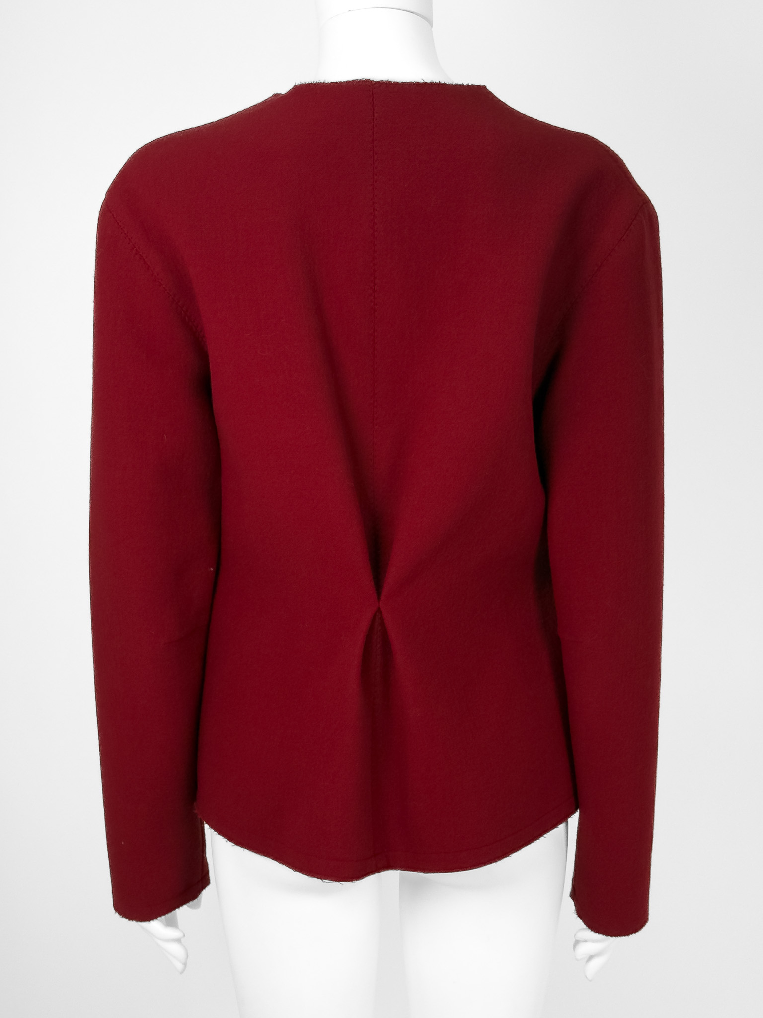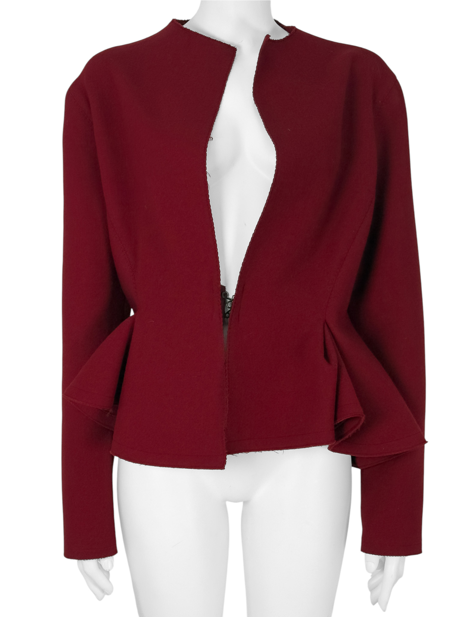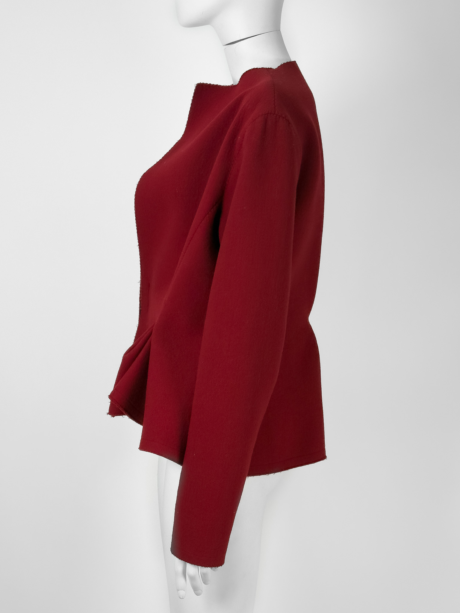 "Czerwony, wełniany żakiet, taliowany, forma baskinki, zapinany na haftkę, surowo wykończony. Rozmiar z metki FR 44. Skład: 77% wełna, 19% poliamid, 4% elastan. Stan: bardzo dobry. Wymiary: szerokość mierzona od pachy do pachy 51cm, długość całkowita 60cm."