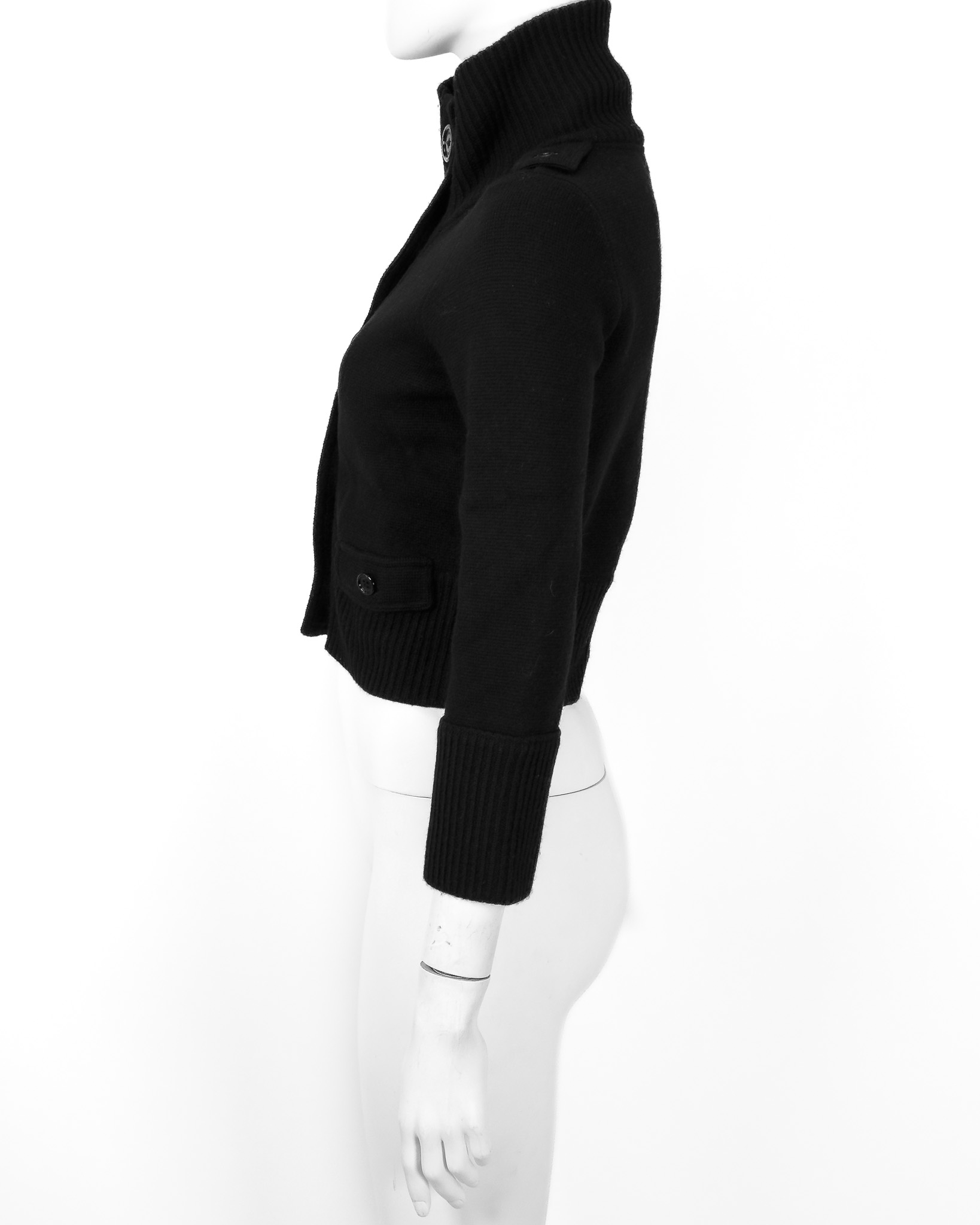 "Czarny wełniany kardigan, zapinany na guziki, golf, w środku wykończony lamówką, dwie kieszenie z klapami po bokach, wykończony prążkowanym ściągaczem. Stan bardzo dobry. Rozmiar z metki S, wypada na mniejszy. Skład: 100% wełna. WYmiary: szerokość mierzona od pachy do pachy 48cm, długość całkowita 43cm."