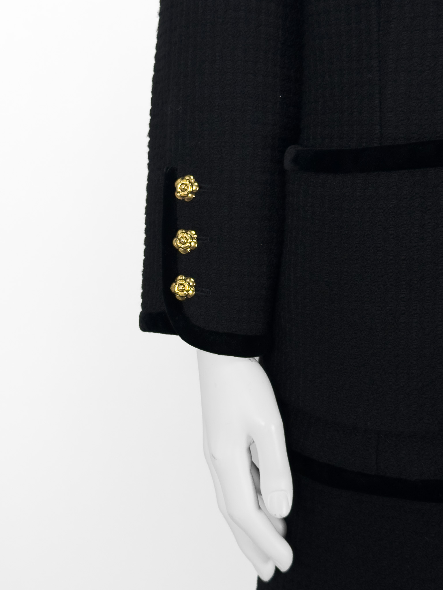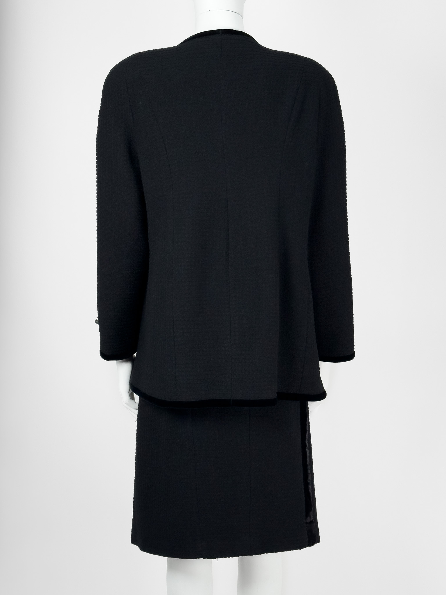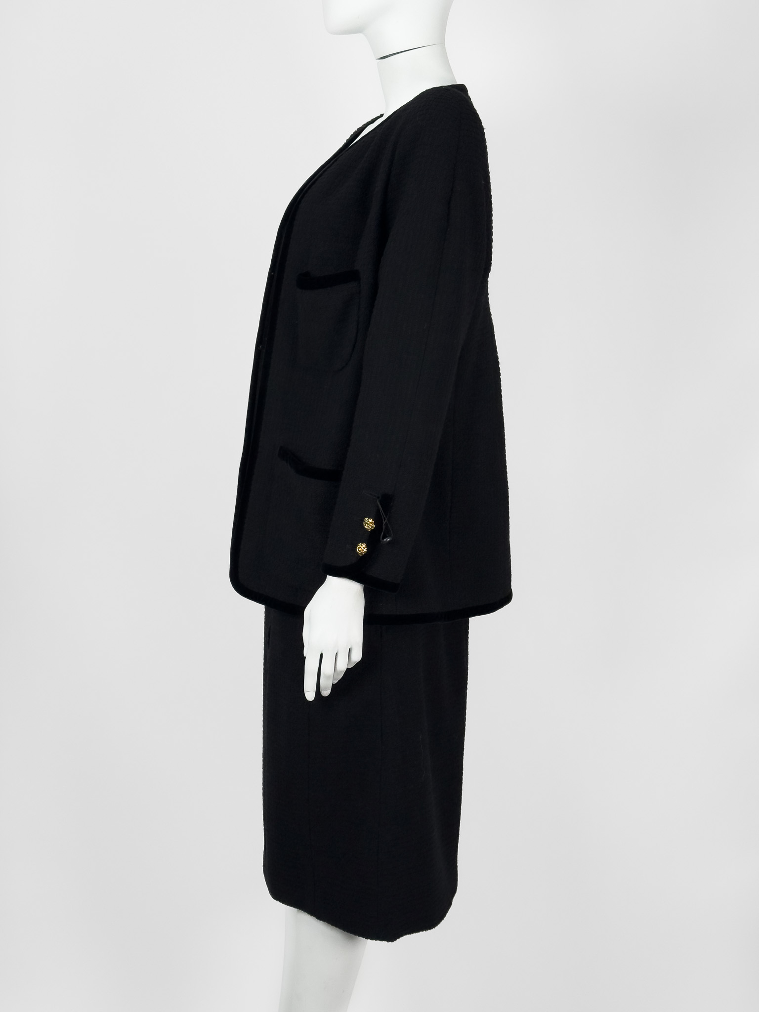 "Czarny, tweedowy, wełniany komplet: żakiet i ołówkowa spódnica. VINTAGE, wykończony welurowymi lamówkami, żakiet zapinany na kryte haftki, posiada cztery kieszonki oraz poduszki w barkach. Stan bardzo dobry, brakuje jednego oczka przy haftce. Rozmiar z metki FR 44. Skład: 100% wełna, podszewka 100% jedwab. Wymiary: szerokość mierzona od pachy do pachy 55cm, długość całkowita 74cm; wymiary spódnicy: szerokość w pasie 47cm, długość całkowita 65cm."