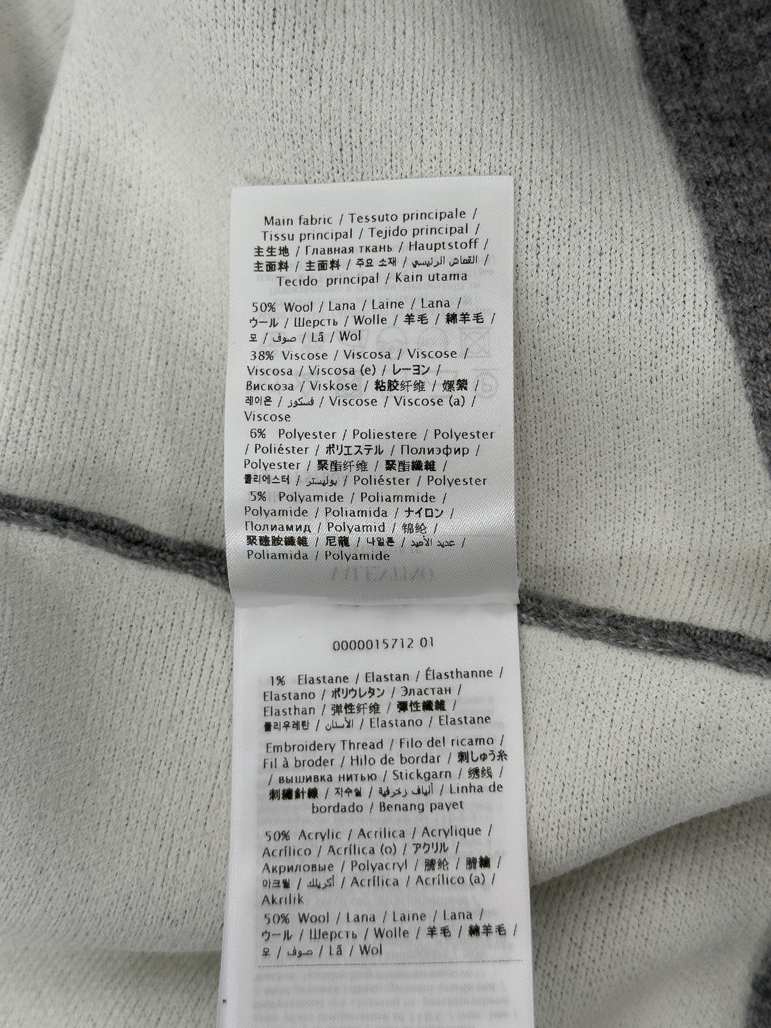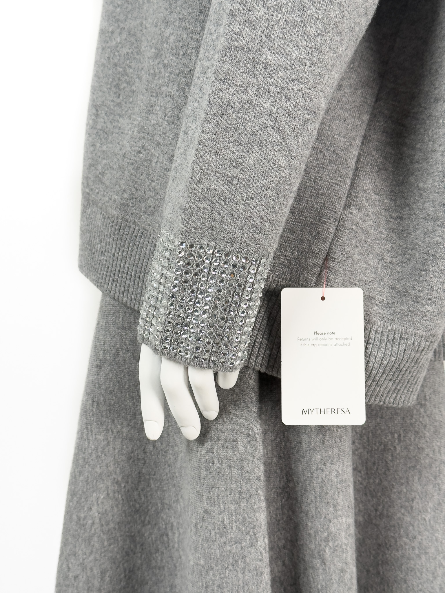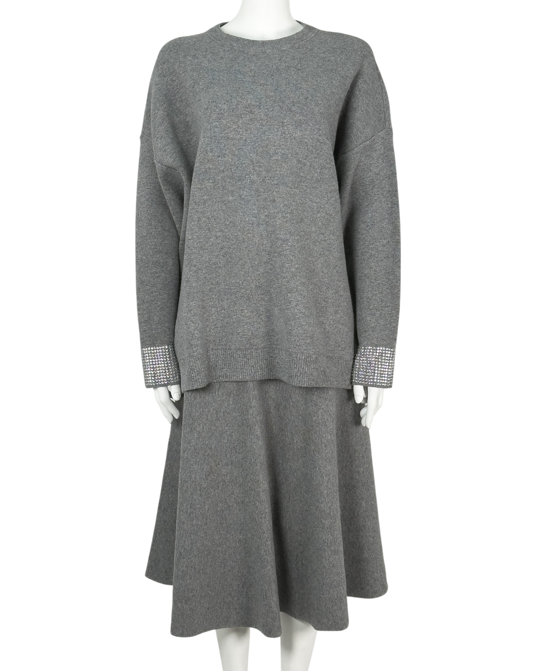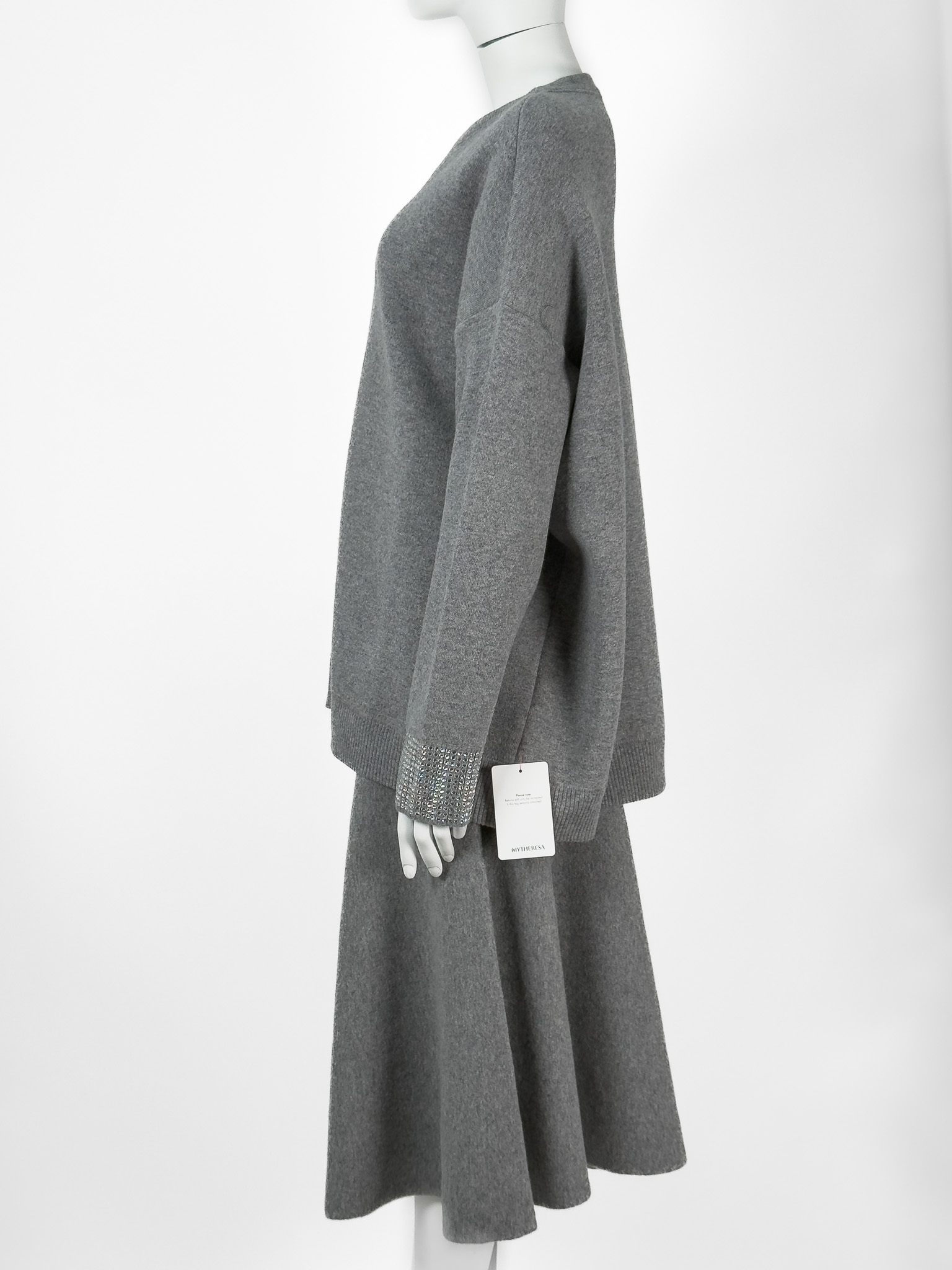 "Szary, wełniany komplet: bluza i spódnica. Bluza, krój oversize, rękaw wykończony sztucznymi diamencikami. Spódnica, krój litery A, delikatnie logowana na górze. Stan nowy z metkami. Rozmiar z metki L. Skład: 50% wełna, 38% wiskoza, 6% poliester, 5% poliamid, 1% elastan. Wymiary bluzy: szerokość mierzona od pachy do pachy 75cm, długość całkowita 75cm; wymiary spódnicy: szerokość w pasie 34,5cm, długość całkowita 81cm."