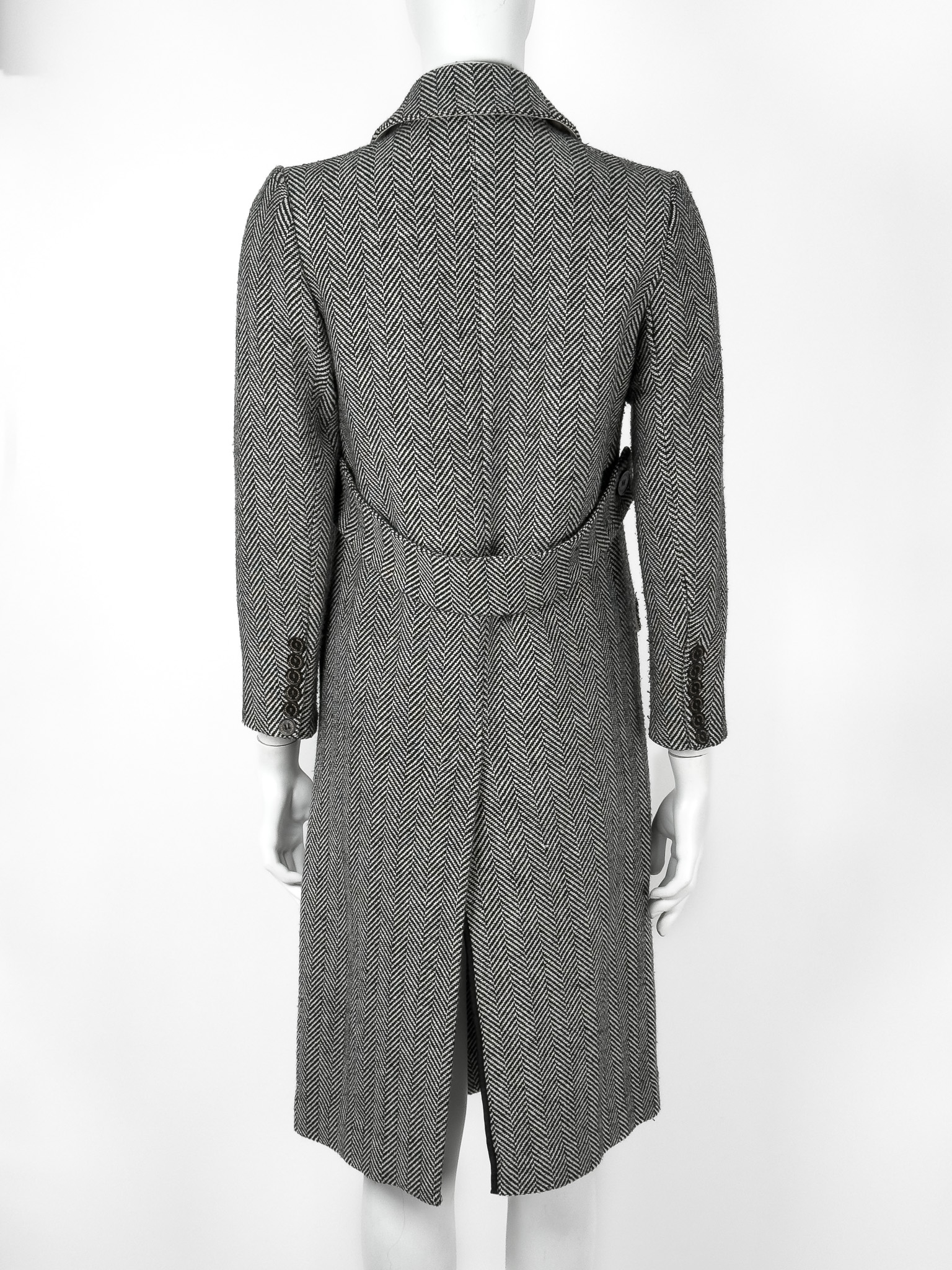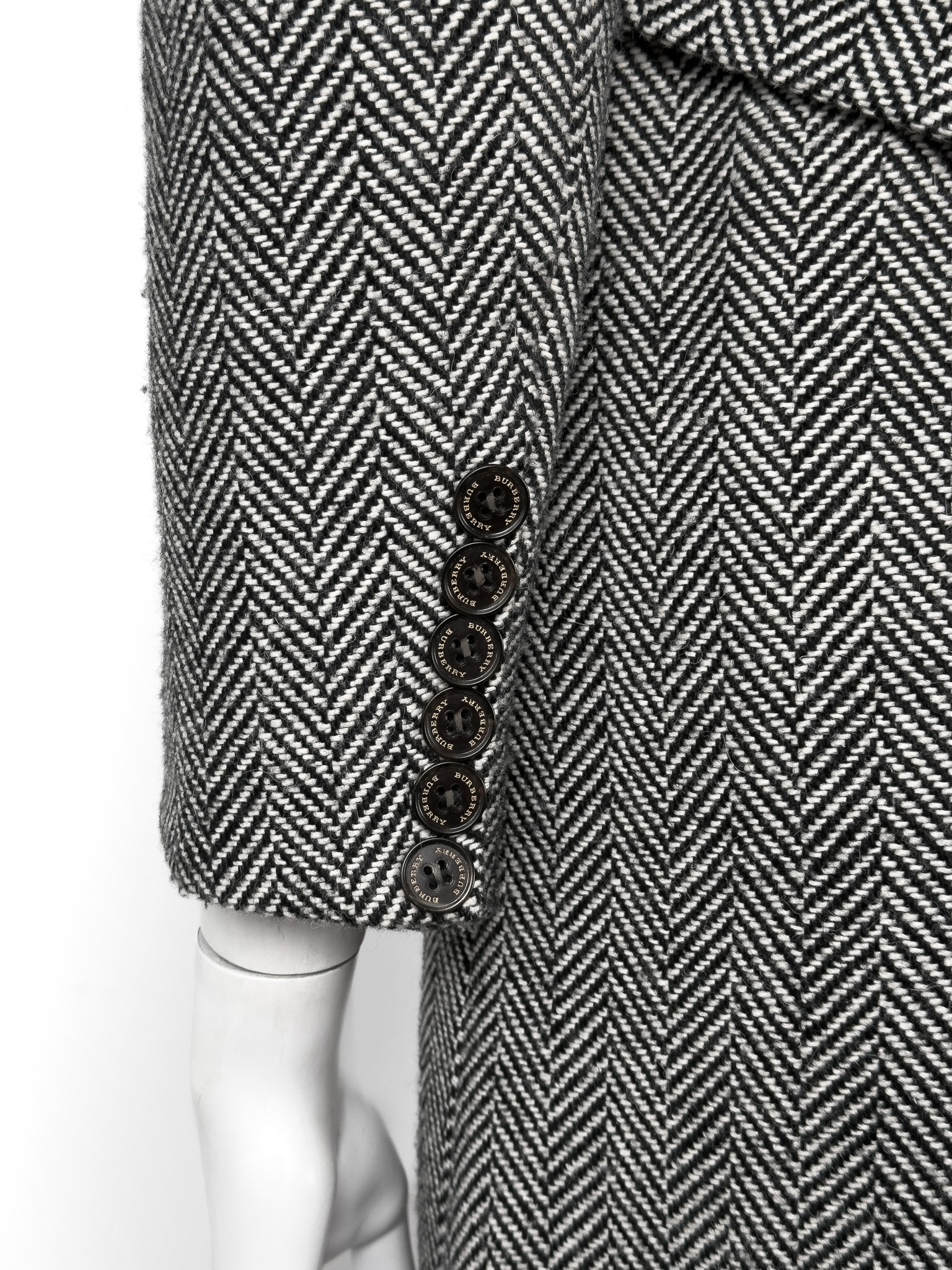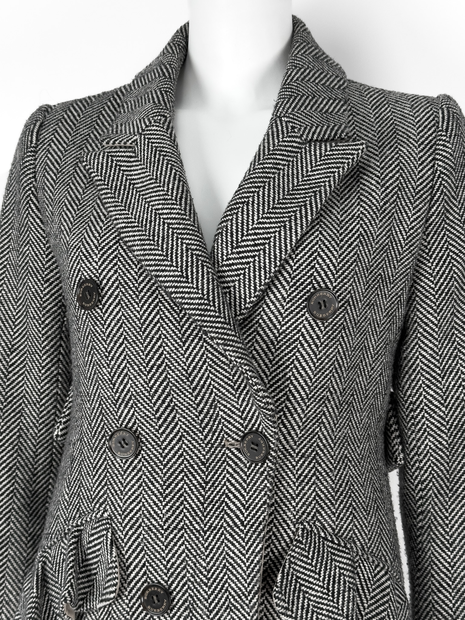 "Czarno-biały wełniany płaszcz w jodełkę, długość midi, dwurzędowy, zapinany na czarne guziki ozdobione złotym logo, dekolt w szpic, taliowany, dwie kryte kieszenie po bokach wykończone klapami w kształcie falban, rozporek, częściowy pasek w tylnej części, częściowa podszewka. Stan bardzo dobry. Rozmiar z metki IT 38. Skład: 100% bawełna. Wymiary: szerokość mierzona od pachy do pachy 49cm, długość całkowita 103cm."